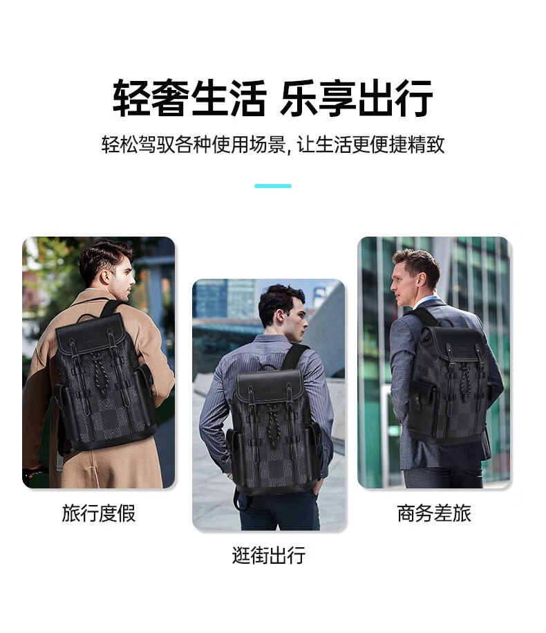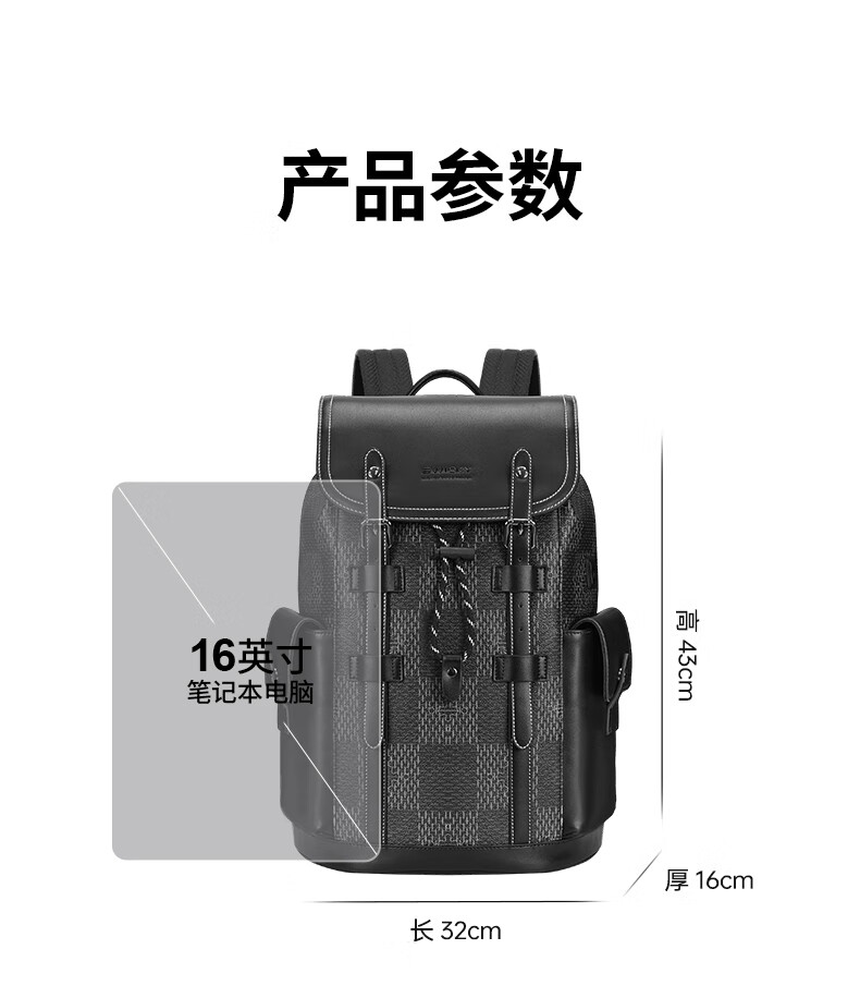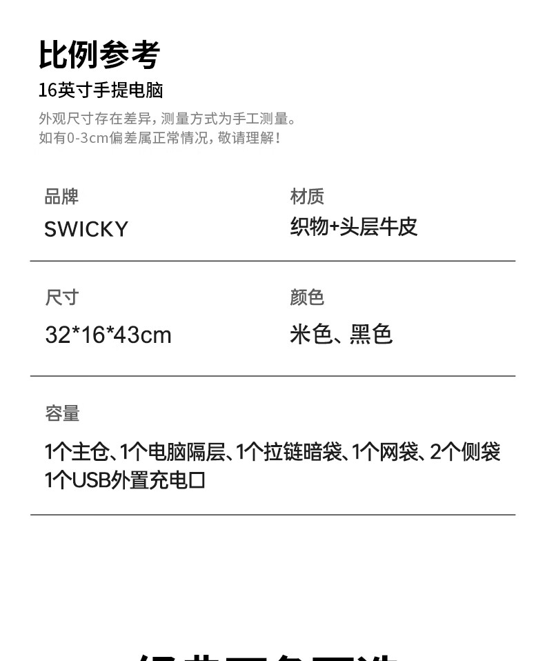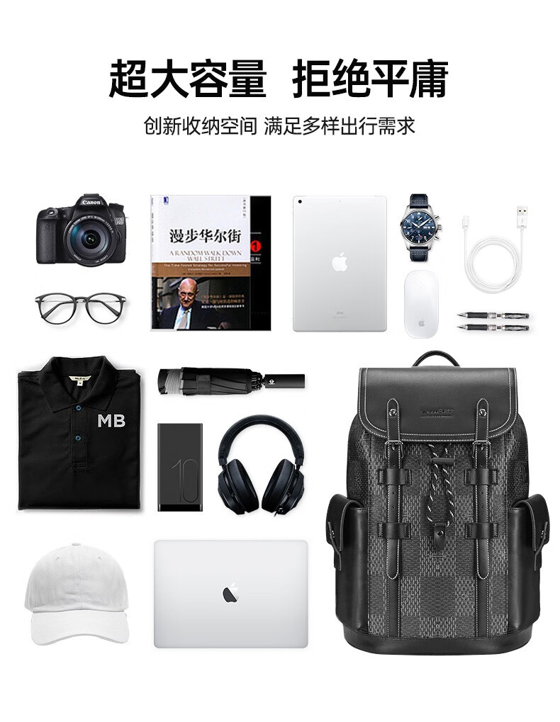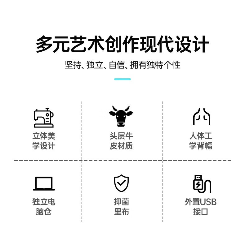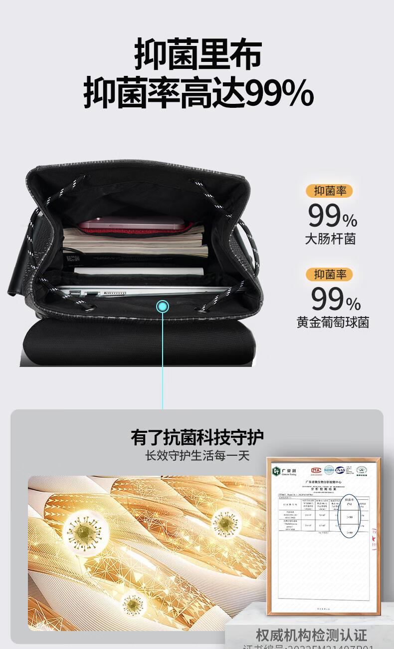 型 号:88174 尺 寸:160*320*430(MM) 材 质:织物 颜 色:黑色/白色 重 量:1.0KG 2.超大容量设计可放16寸电脑; 3.主袋内加厚电脑隔层; 4.创新3D透气背负; 5.外置USB充电接口 6.磁吸开合,方便快捷.