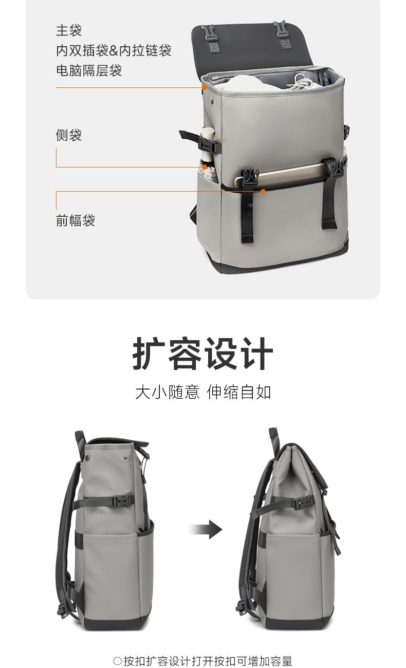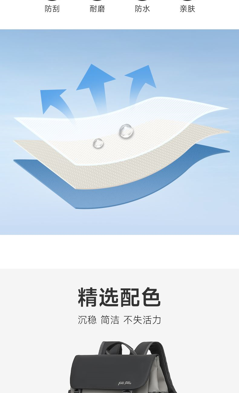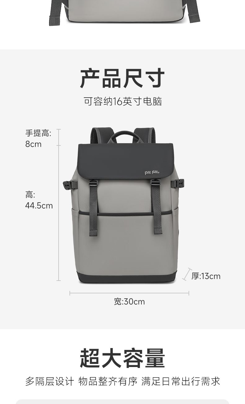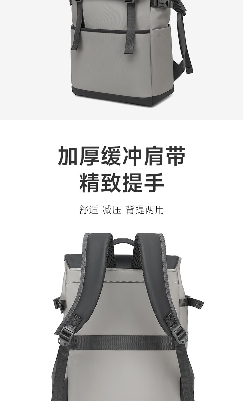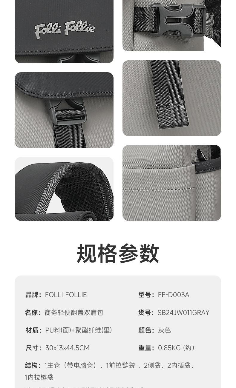 精心布局,合理利用每一寸空间,商务人士的不二之选。 舒适透气肩带,贴合背部,缓解压力,背负更轻松 面料升级版防泼耐刮划,全新耐磨防泼水面料 柔软质感 日常易打理型号: FF-D003A 品号:SB24JW011GRAY 面料材质:PU料(面)+聚酯纤维(里) 里布材质:聚酯纤维 尺寸: 30*13*44.5CM 颜色:灰色 结构:1主仓(带电脑仓)、1前拉链袋、2侧袋、2内插袋、1内拉链袋