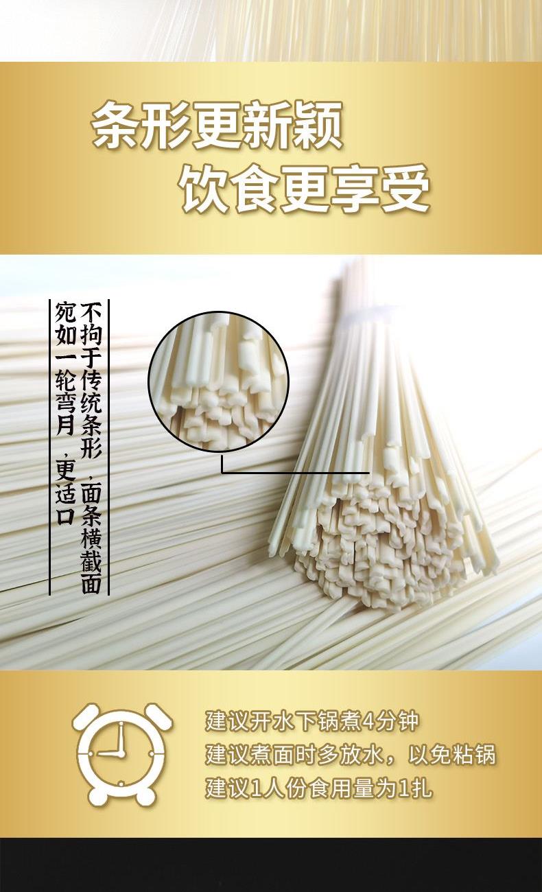 产品规格: 月牙面 270g*6包 1、42%高加水:口感更爽滑软弹 2、360°真空揉:更筋道耐煮 3、35℃仿日晒:面条品质更稳定 4、月牙形面条,面身圆润顺滑, 咀嚼口感软糯Q弹