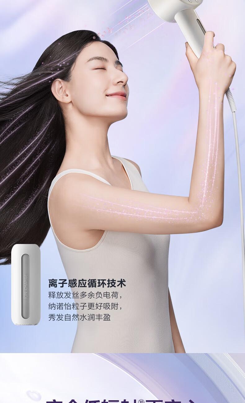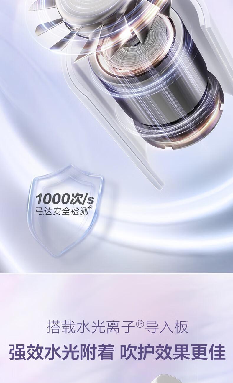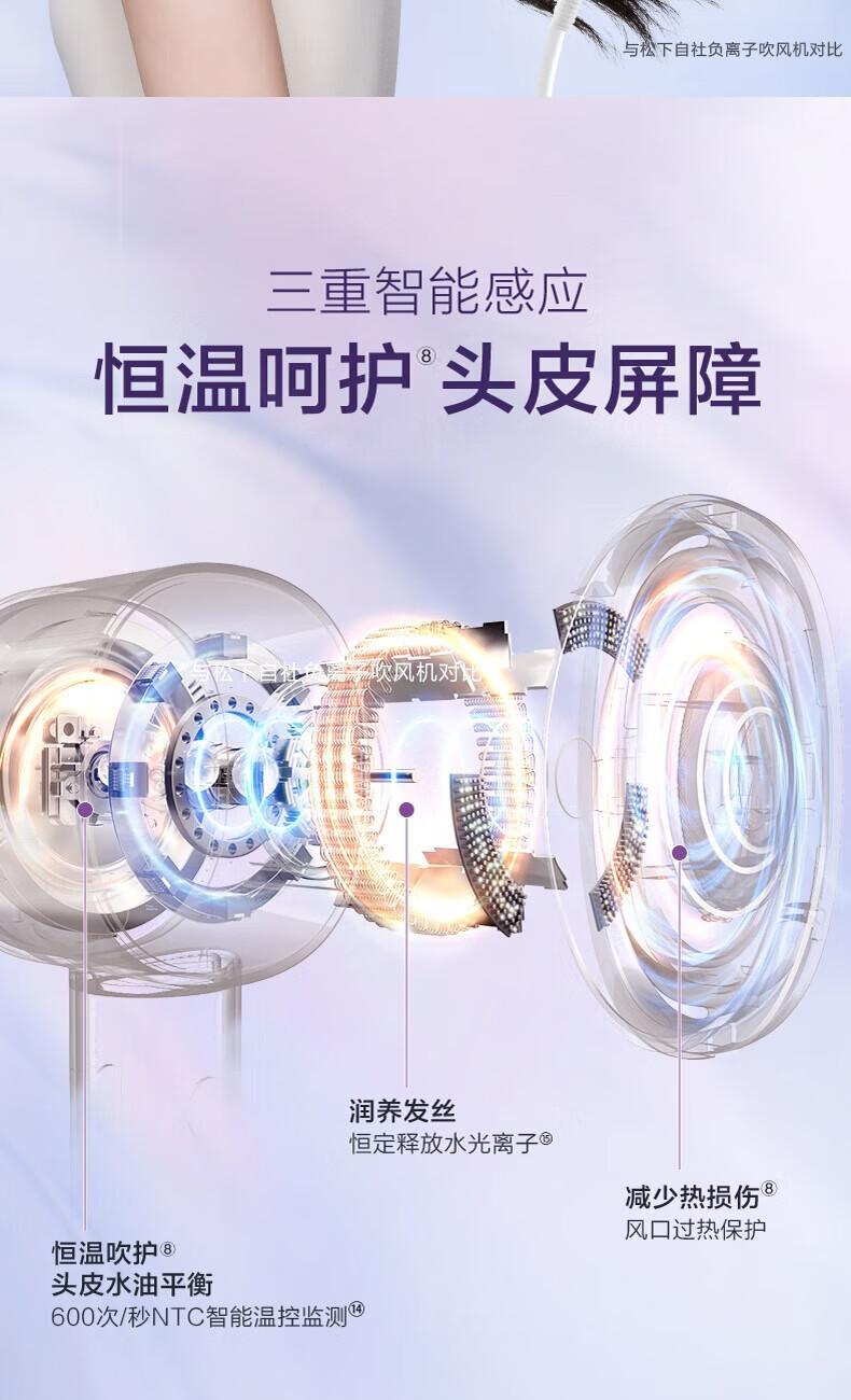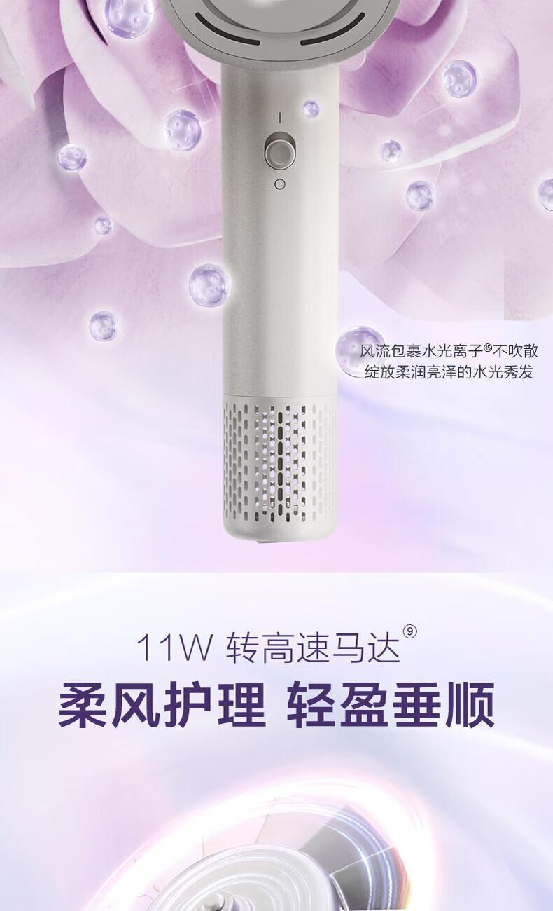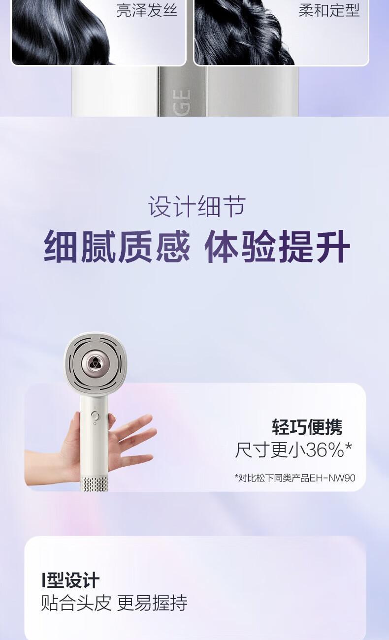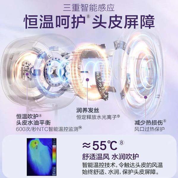 轻巧便捷,尺寸更小,机身轻盈在握; 亿级高浓度负离子,静电去无踪; 千倍水润、持久锁水、亮泽度提升; 三档风速,四挡温度 智能温控,舒适温风,水润吹护