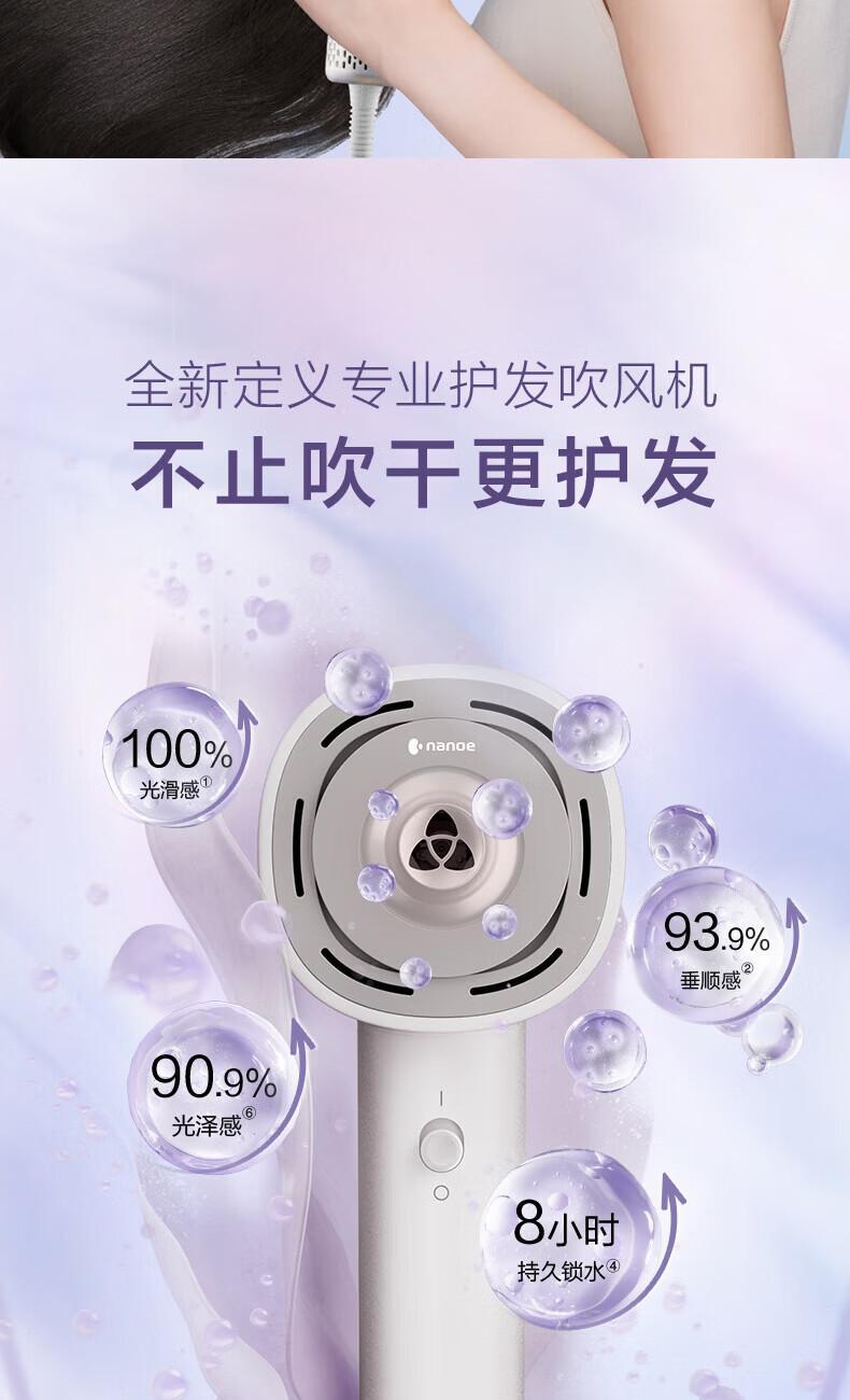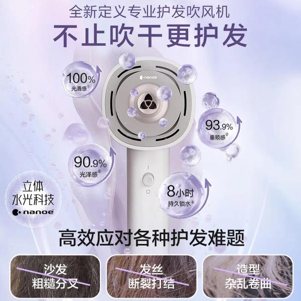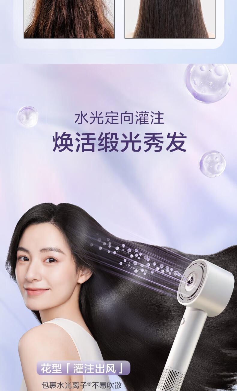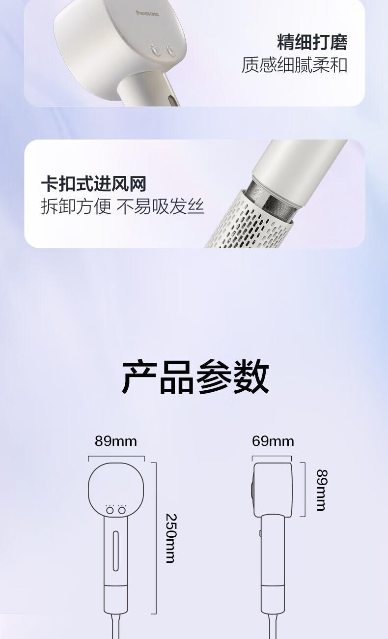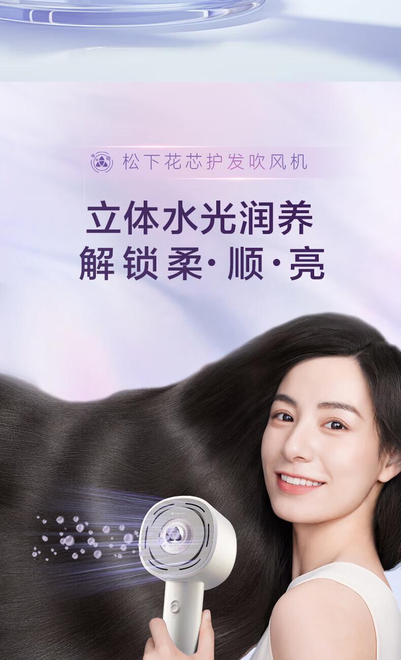 轻巧便捷,尺寸更小,机身轻盈在握; 亿级高浓度负离子,静电去无踪; 千倍水润、持久锁水、亮泽度提升; 三档风速,四挡温度 智能温控,舒适温风,水润吹护