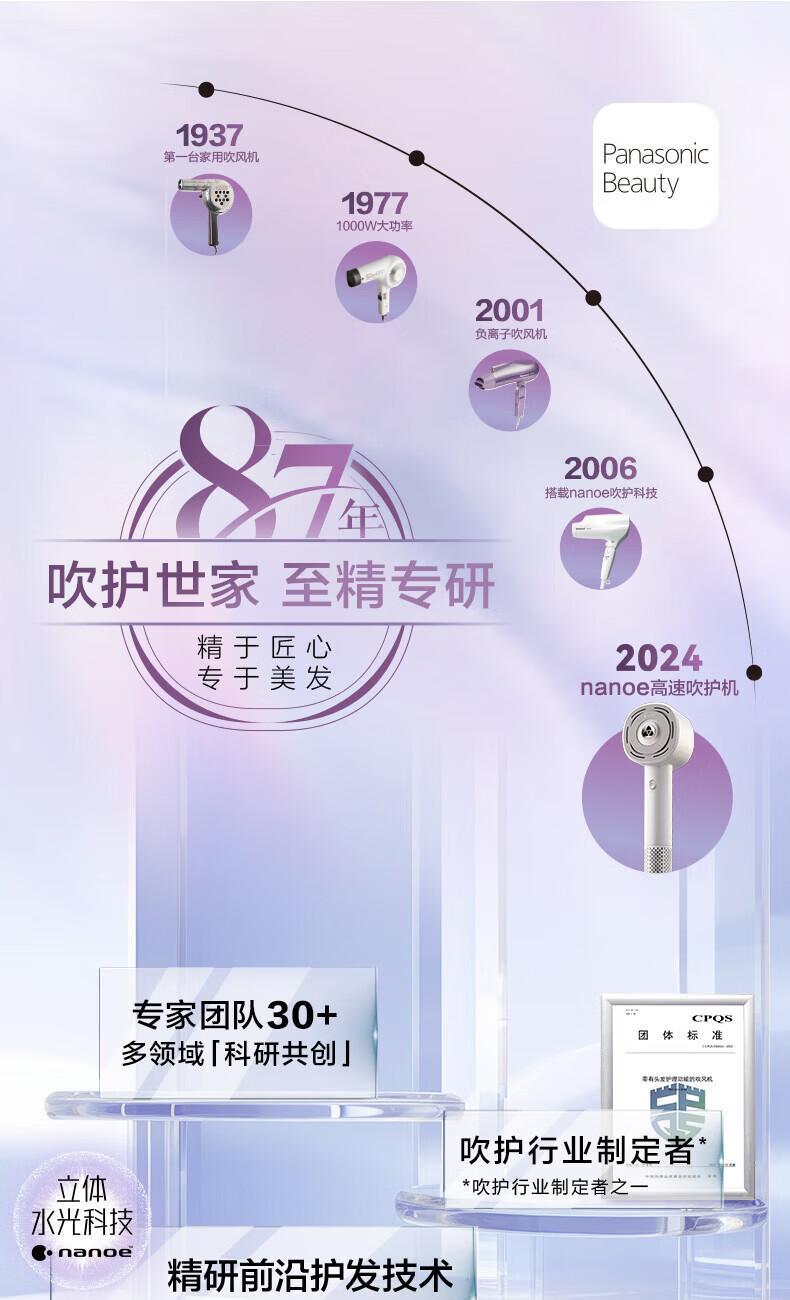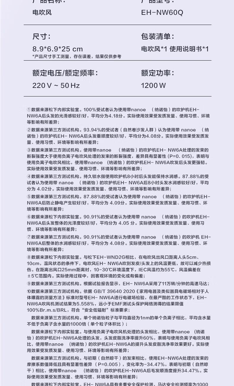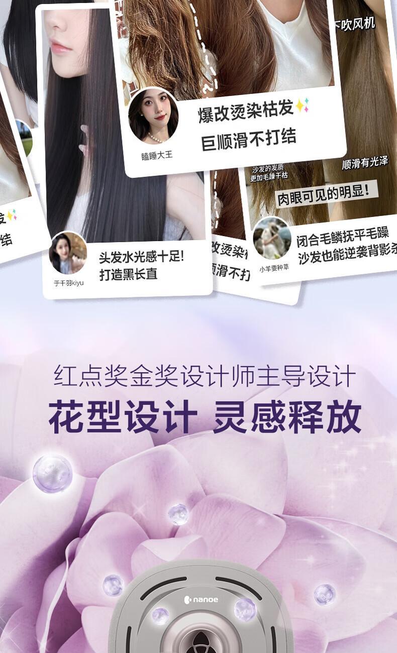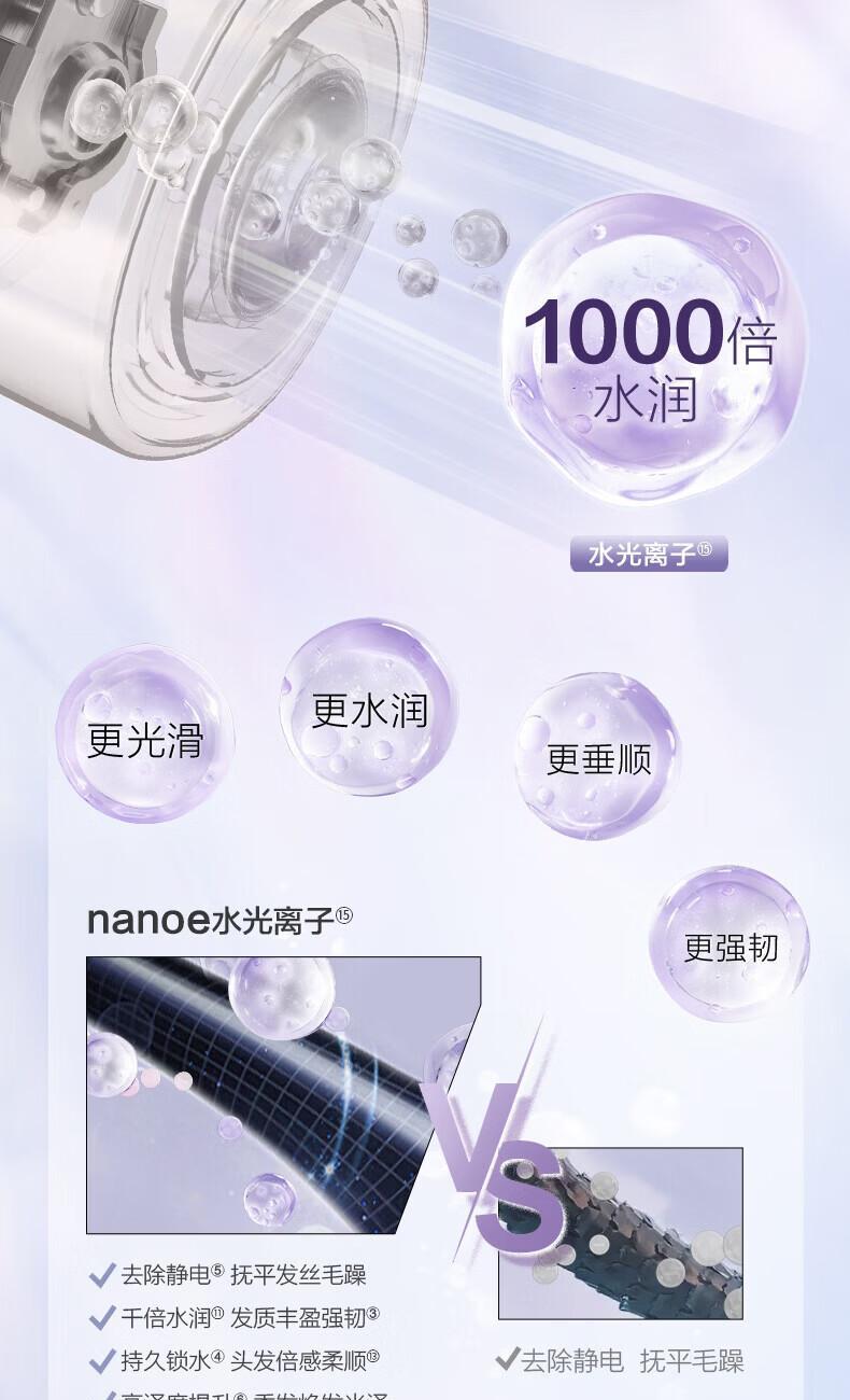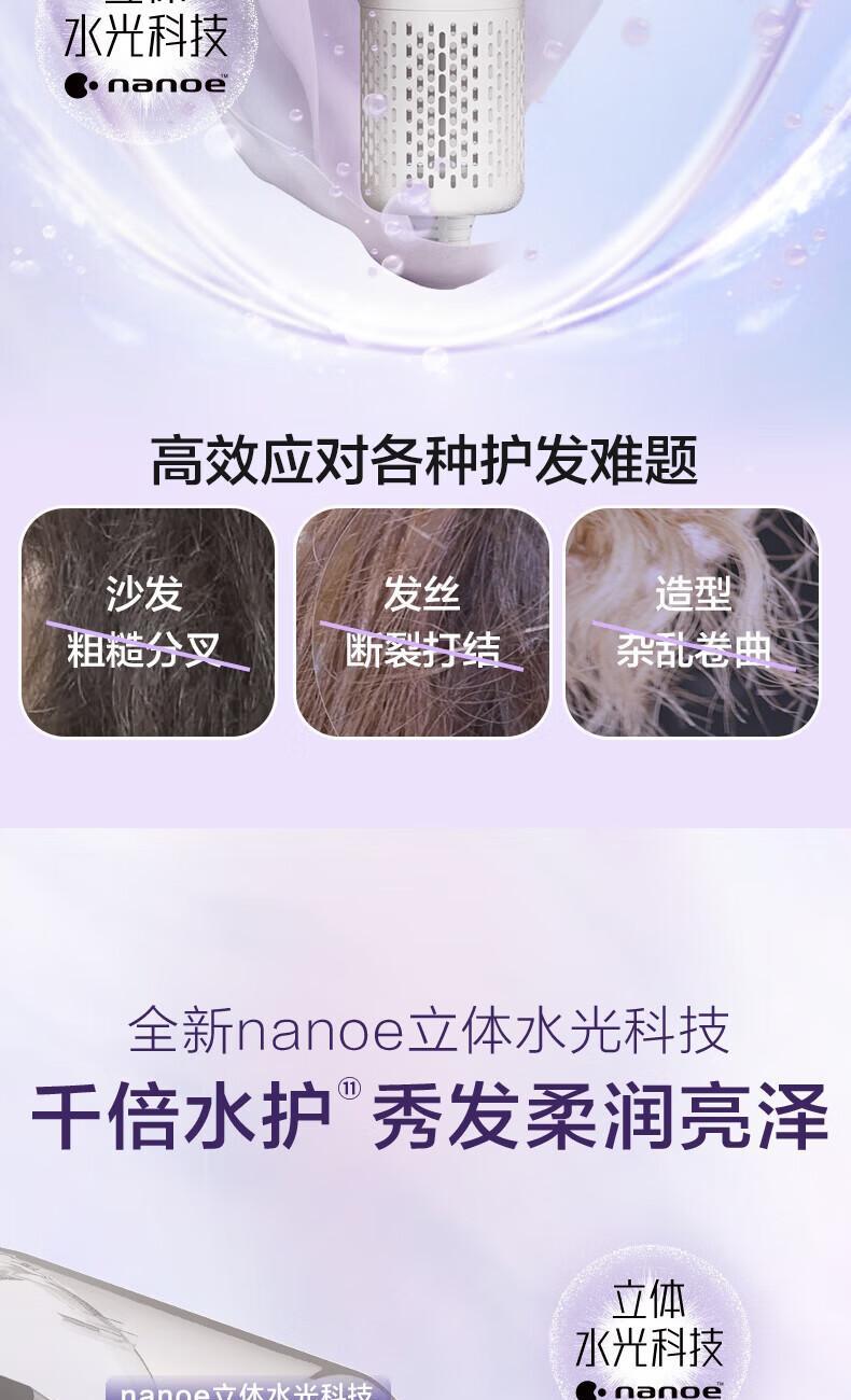 轻巧便捷,尺寸更小,机身轻盈在握; 亿级高浓度负离子,静电去无踪; 千倍水润、持久锁水、亮泽度提升; 三档风速,四挡温度 智能温控,舒适温风,水润吹护