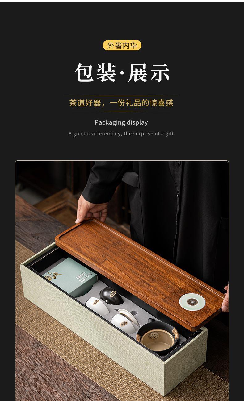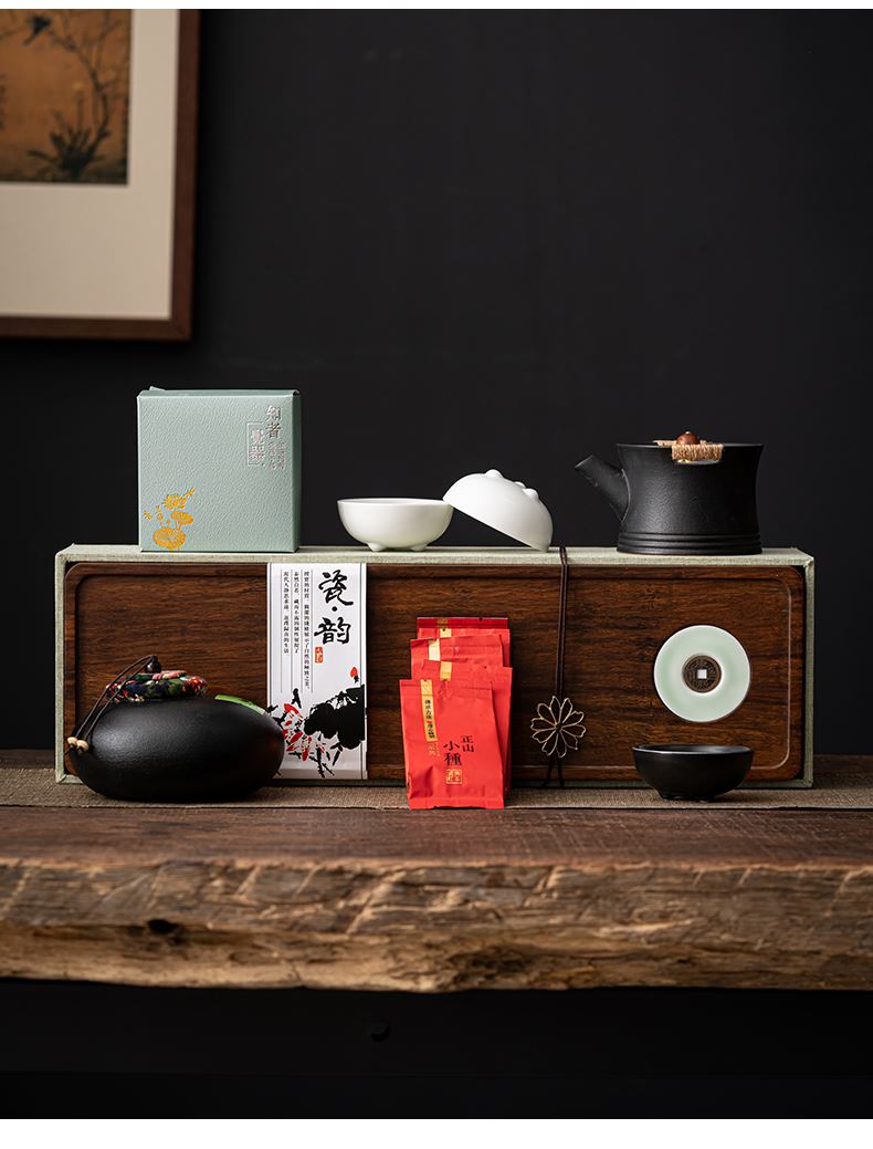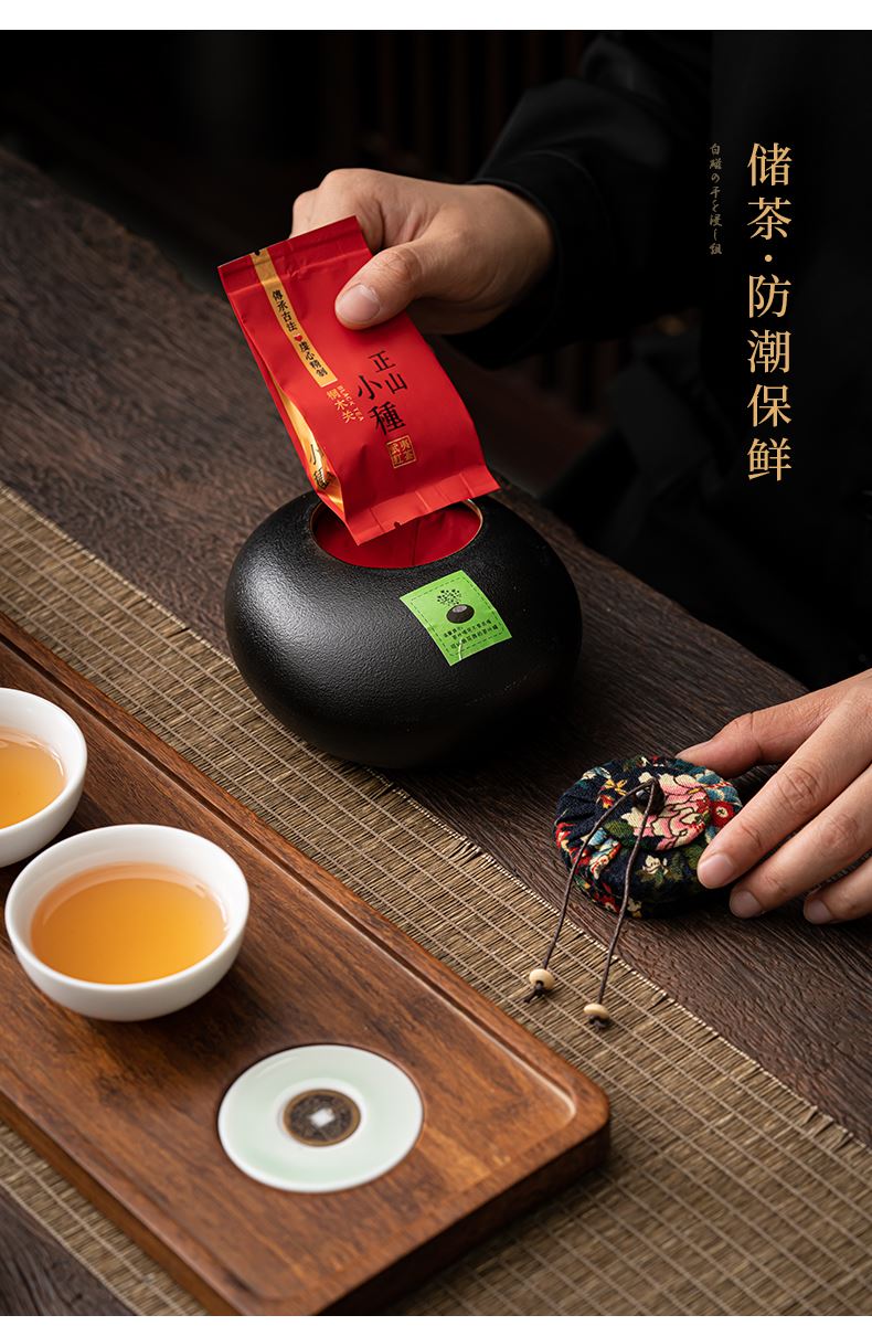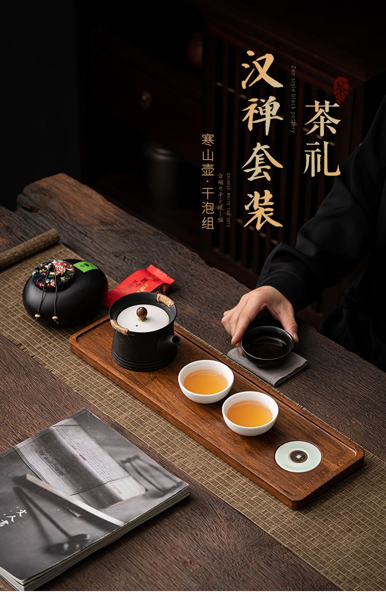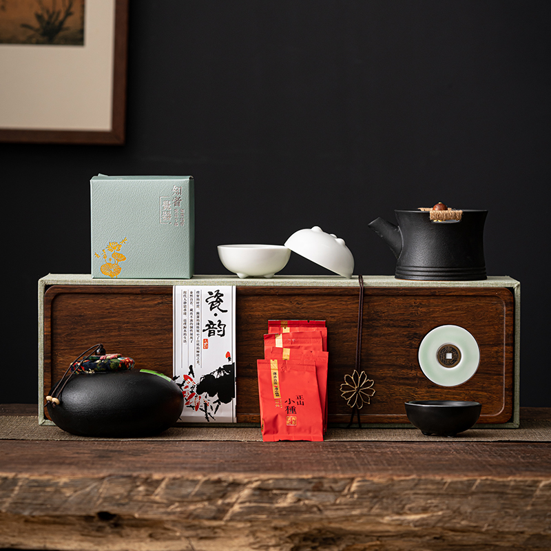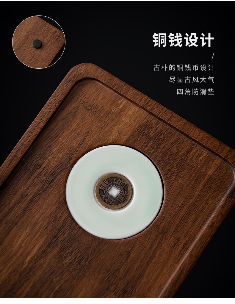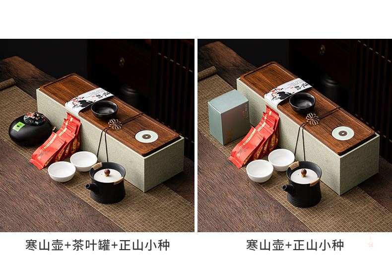 《金镶玉茶叶罐款》 茶盘采用重竹材质,铜钱镶嵌工艺,具有镇宅,招财美观,同时为包装盖,经济又环保。同时茶叶罐也可做为花插使用。 配置:茶壶*1+茶杯*3+茶盘*1+正山小种*5泡+茶叶罐*1+礼盒+手提袋 材质/工艺:茶杯:定窑陶瓷,茶壶/茶叶罐黑陶 茶盘:重竹 茶盘尺寸:45*14*1.5cm