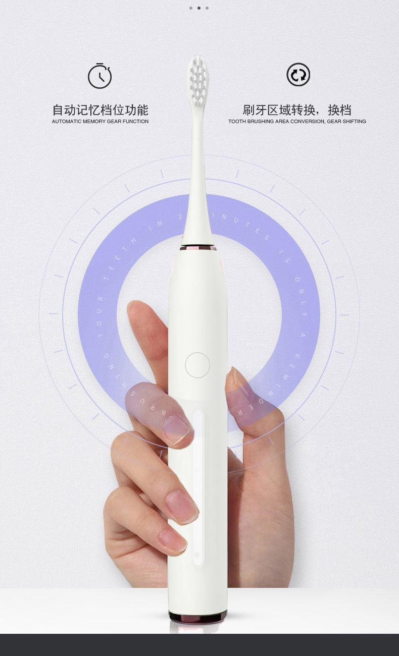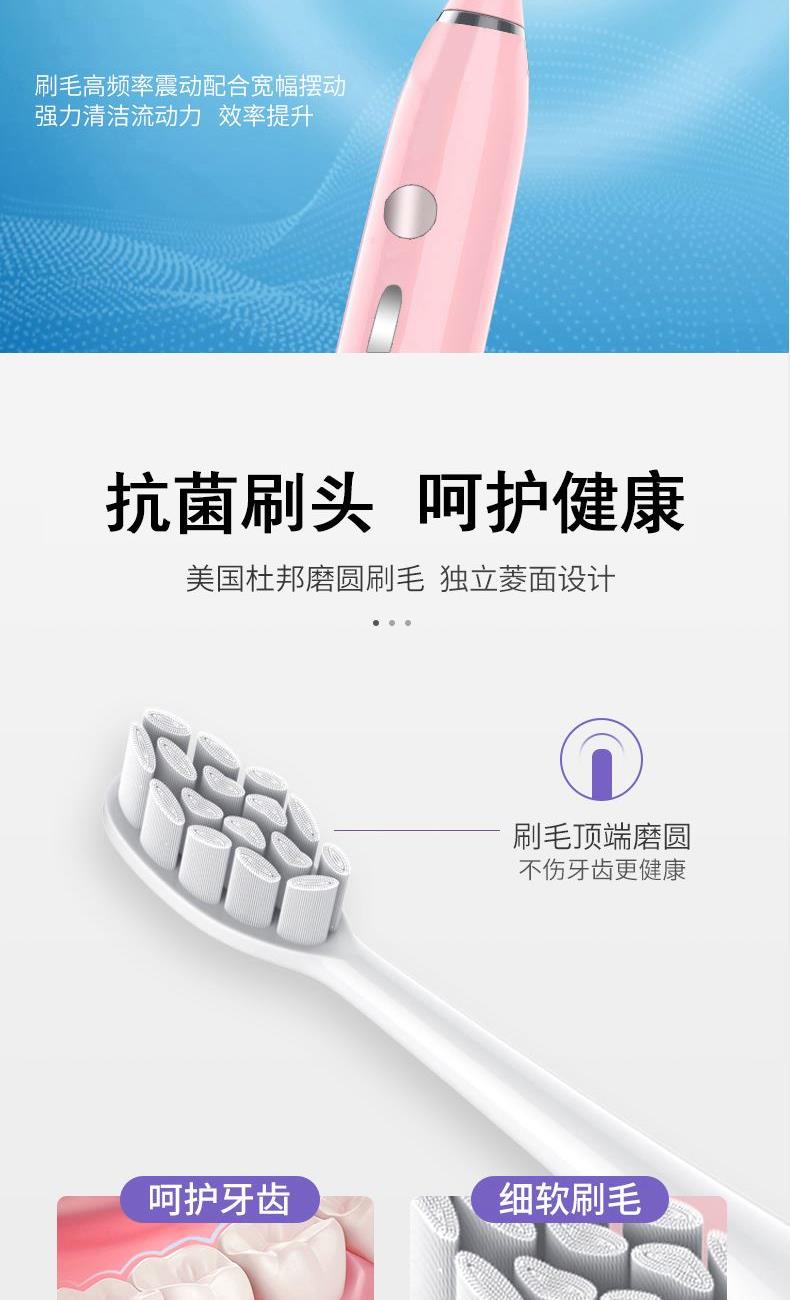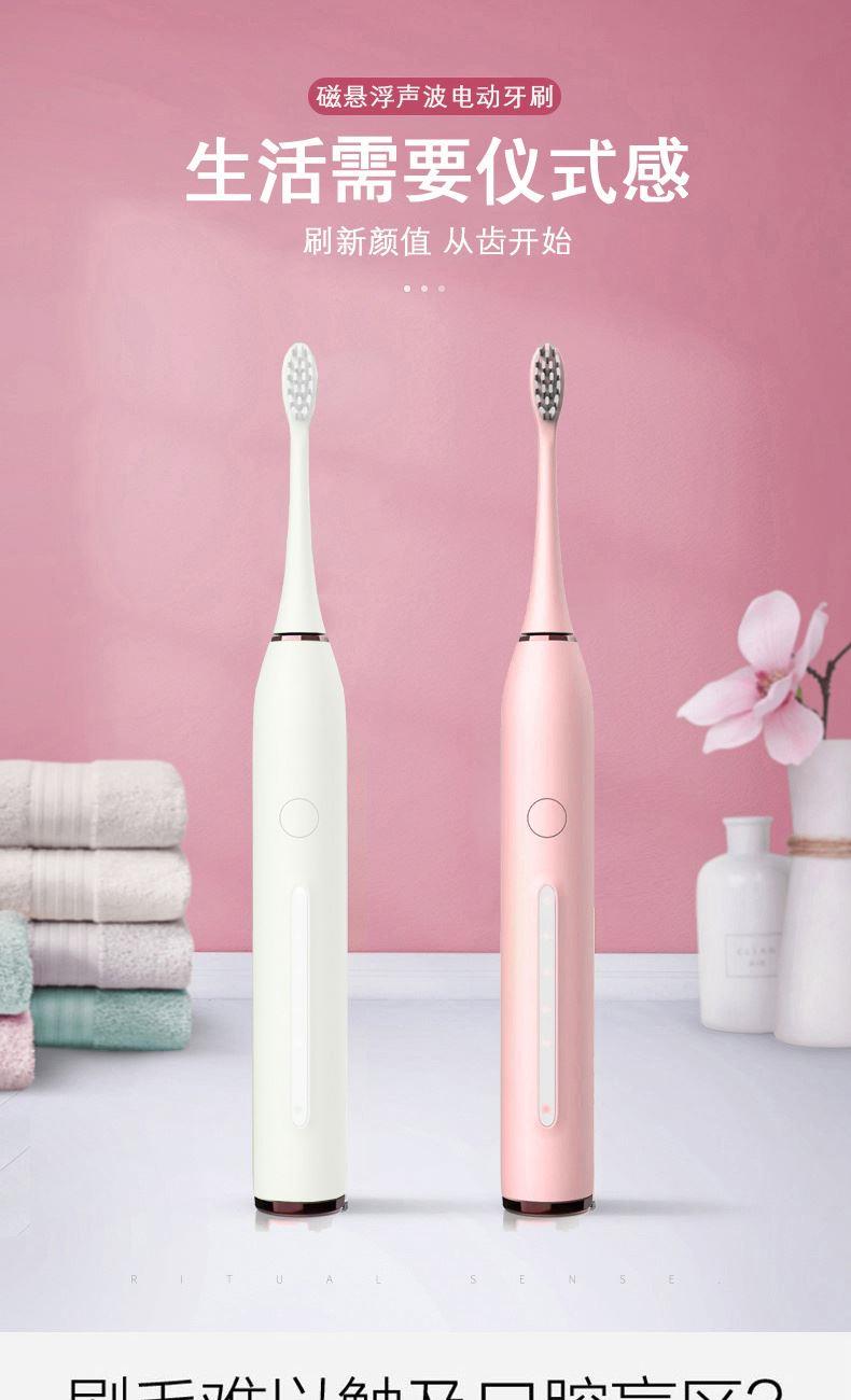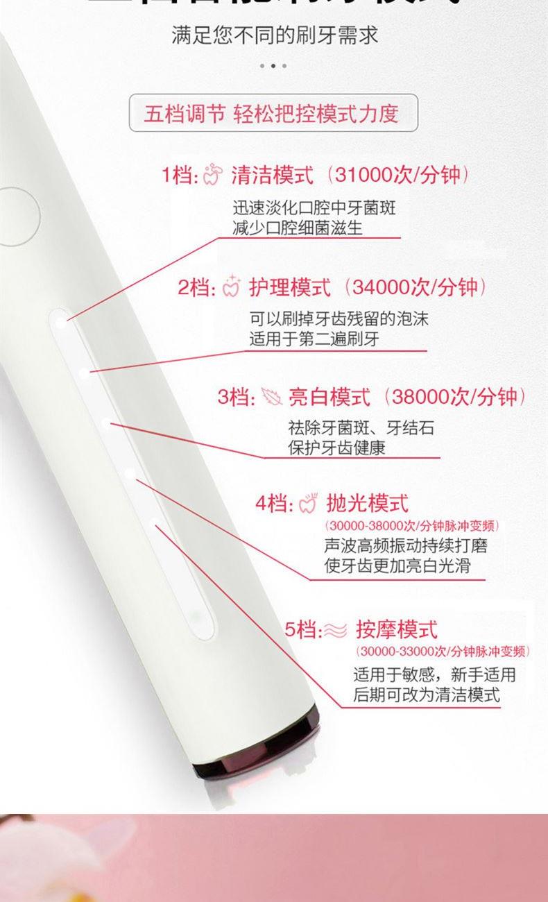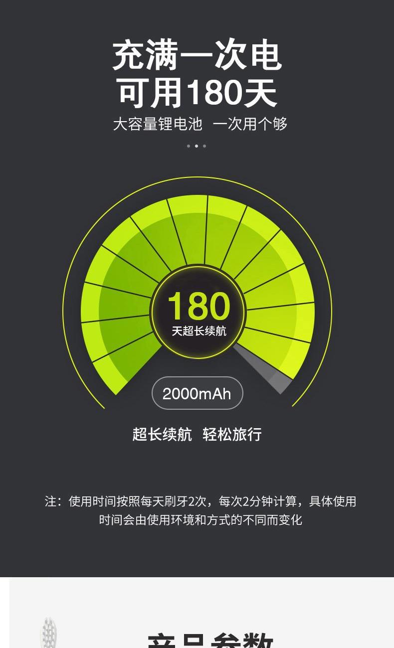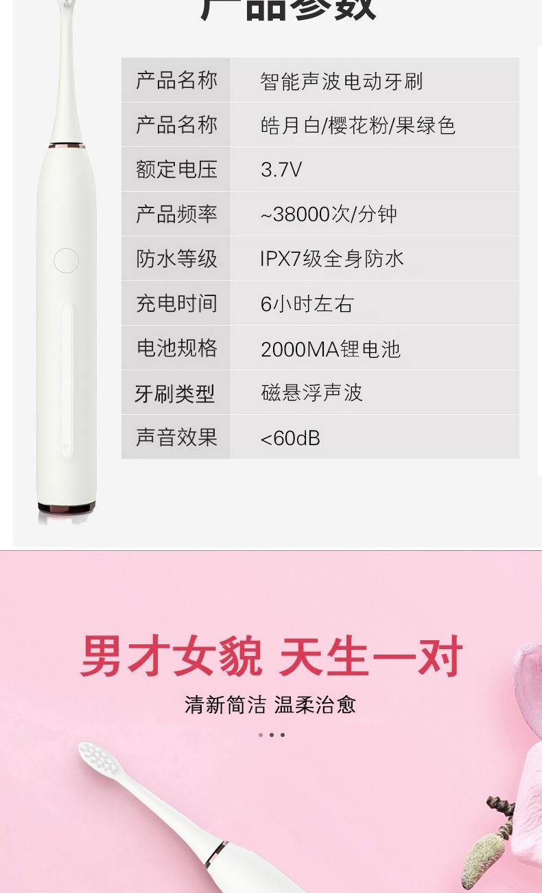 额定电压:3.7V 产品频率:~38000次/分钟 防水等级:IPXT级全身防水 充电时间:6小时左右 电池规格:2000MA锂电池 牙刷类型:磁悬浮声波 声音效果:<60dB 尺寸270*270*248mm 1.五档洁齿模式,磁悬浮声波电机,每分钟38000次/震动,配置两个档脉冲变频震动,针对不同口腔护理人士需要,达到更加有效清洁牙齿污垢,清除牙菌斑效果 2.超长续航,一次充电续航180天  3.采用USB充电,设有防止过充,自动断电功能,安全方便。  4.机身采用纳米覆膜工艺处理,防潮防霉.  5. 二分钟智能计时刷牙,自动记忆档位功能;刷牙区域转换,换档,低电量提醒 6.刷头3D高密度植毛,刷毛磨圆工艺处理,  优质的刷毛不但耐用,清洁效果好,刷毛磨圆工艺呵护牙龈    7.全身精密工艺打造防潮防水,IPX7防水级别认证