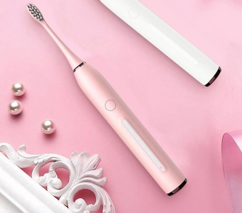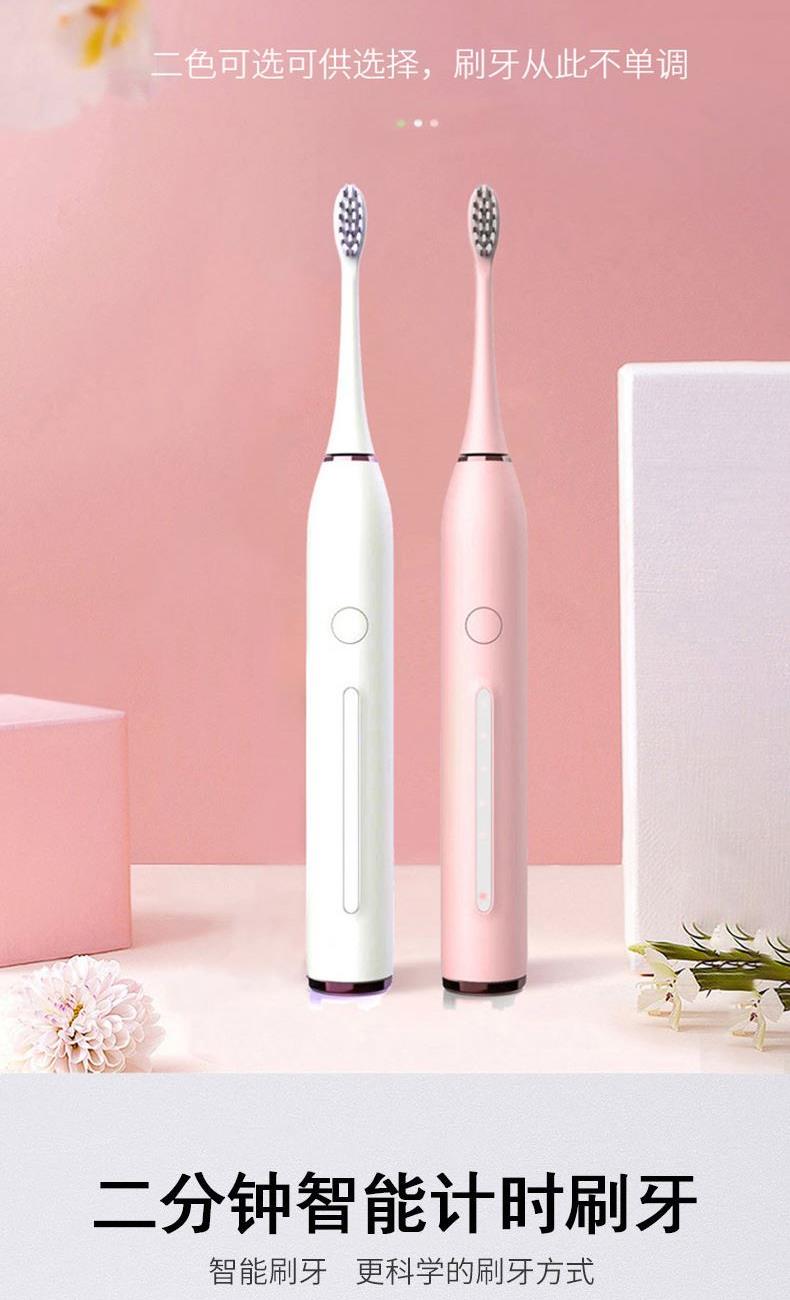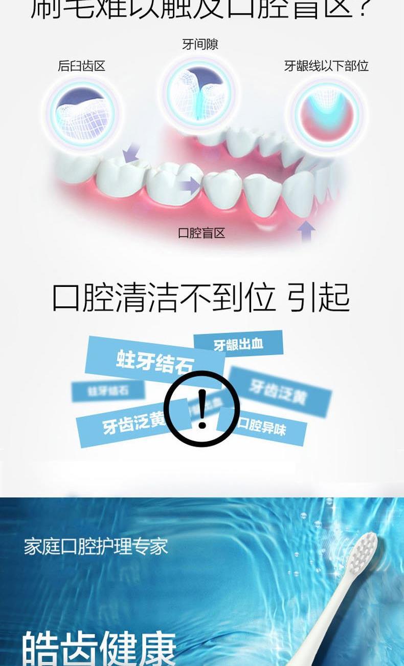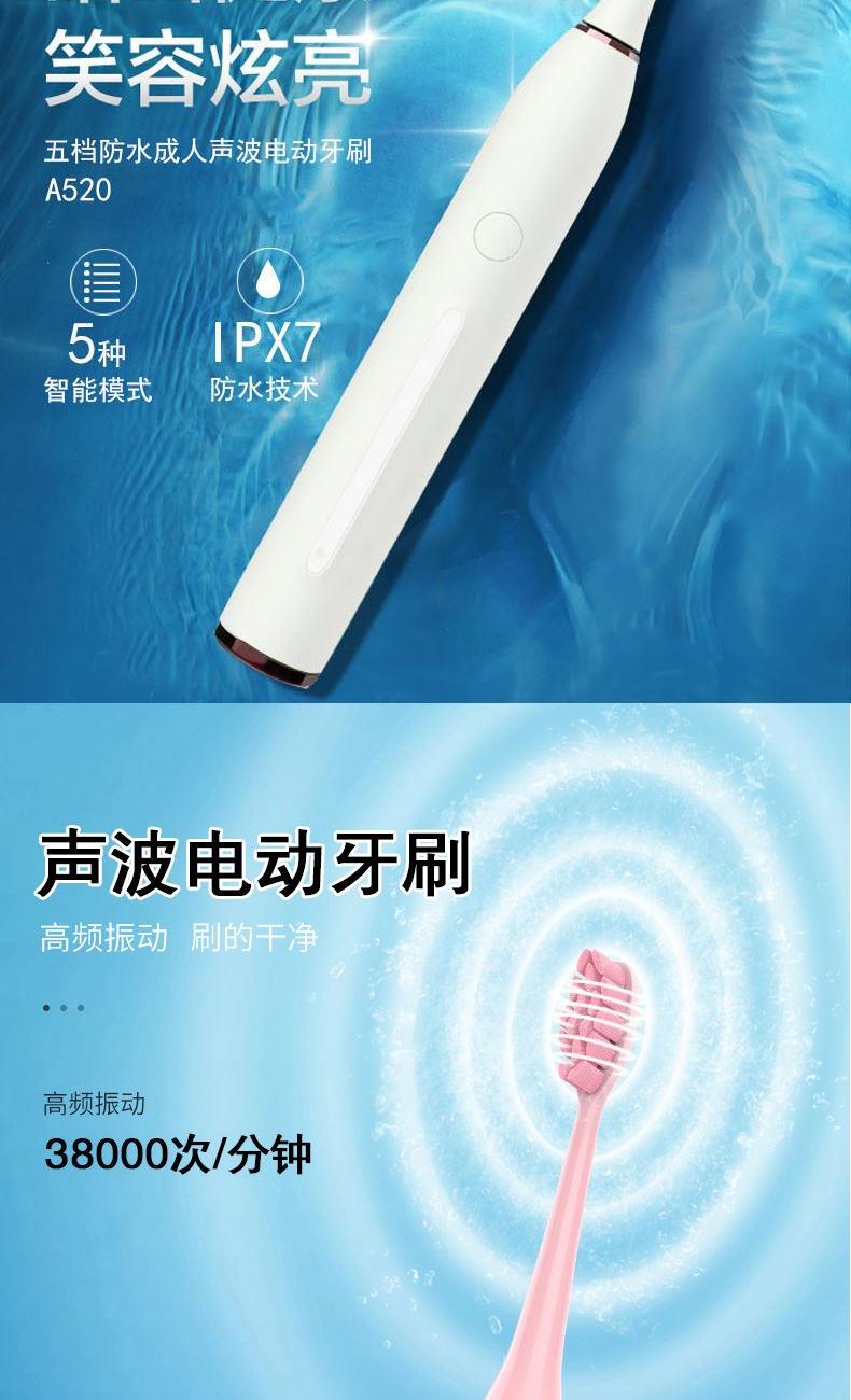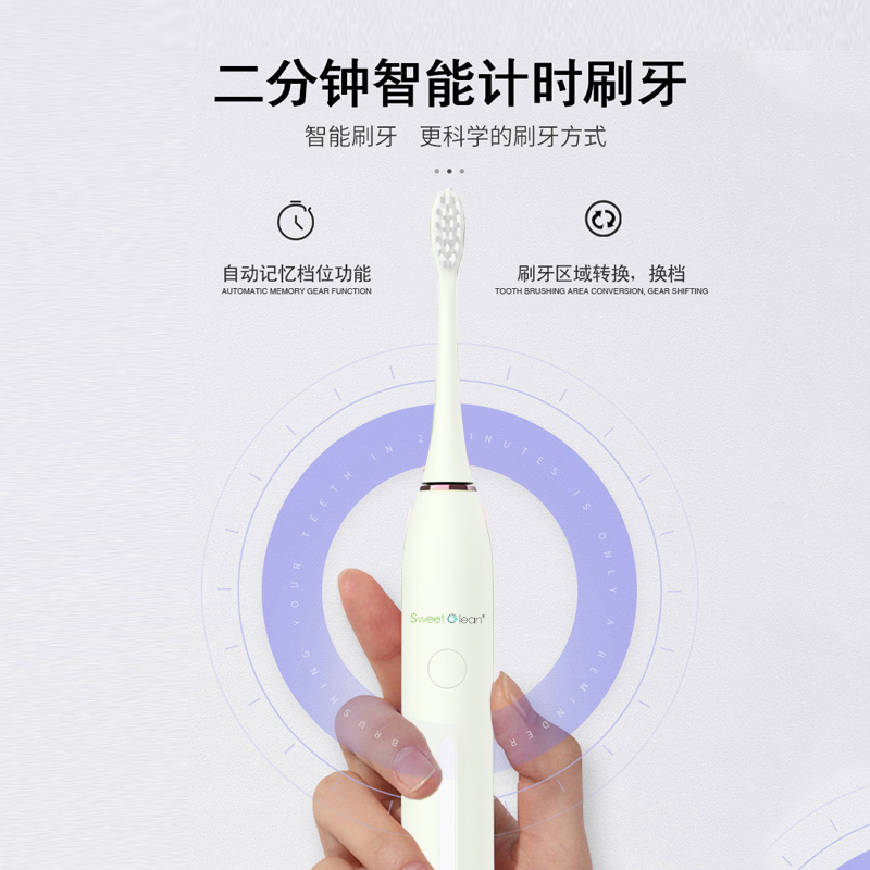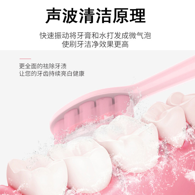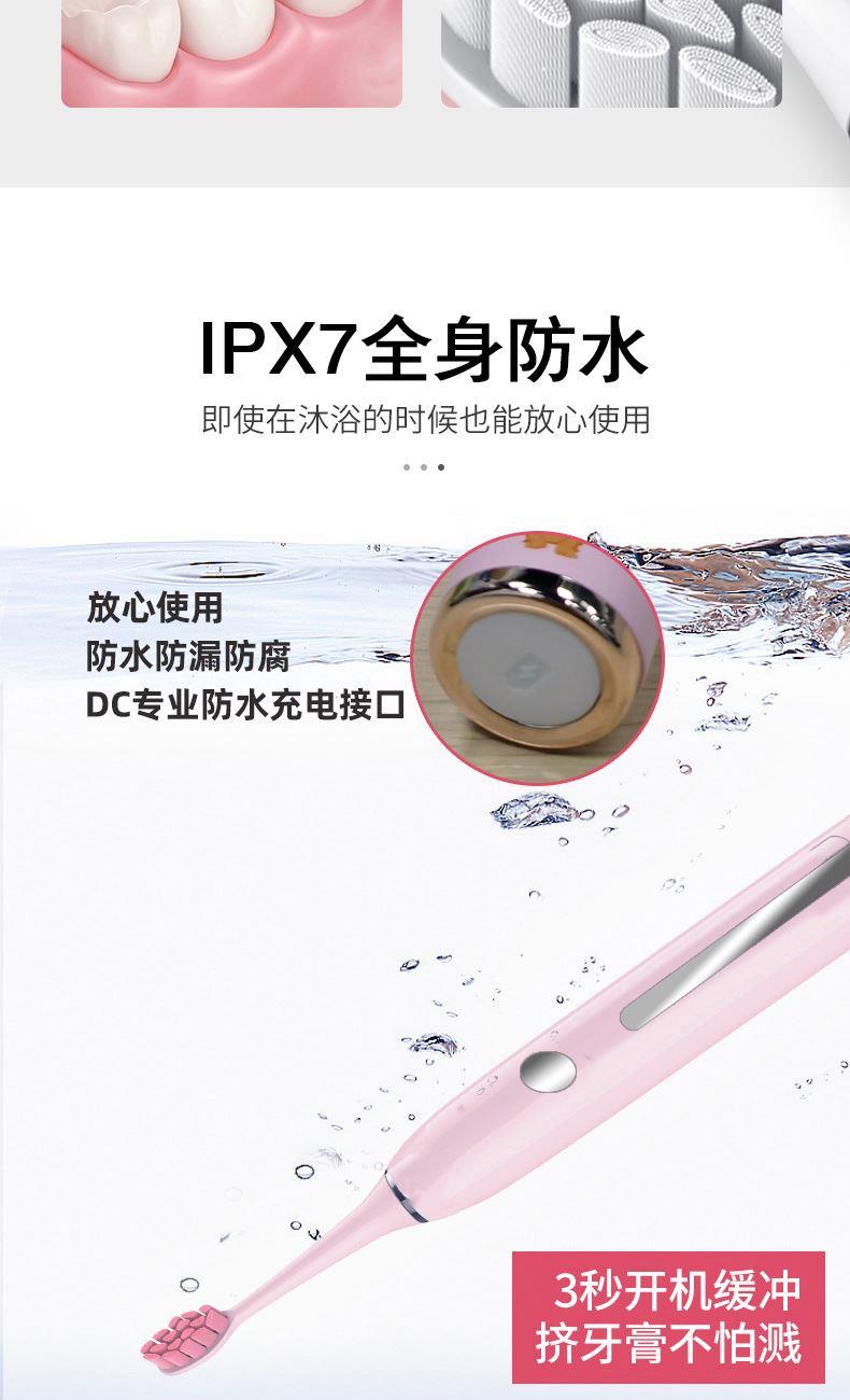 额定电压:3.7V 产品频率:~38000次/分钟 防水等级:IPXT级全身防水 充电时间:6小时左右 电池规格:2000MA锂电池 牙刷类型:磁悬浮声波 声音效果:<60dB 尺寸270*270*248mm 1.五档洁齿模式,磁悬浮声波电机,每分钟38000次/震动,配置两个档脉冲变频震动,针对不同口腔护理人士需要,达到更加有效清洁牙齿污垢,清除牙菌斑效果 2.超长续航,一次充电续航180天  3.采用USB充电,设有防止过充,自动断电功能,安全方便。  4.机身采用纳米覆膜工艺处理,防潮防霉.  5. 二分钟智能计时刷牙,自动记忆档位功能;刷牙区域转换,换档,低电量提醒 6.刷头3D高密度植毛,刷毛磨圆工艺处理,  优质的刷毛不但耐用,清洁效果好,刷毛磨圆工艺呵护牙龈    7.全身精密工艺打造防潮防水,IPX7防水级别认证