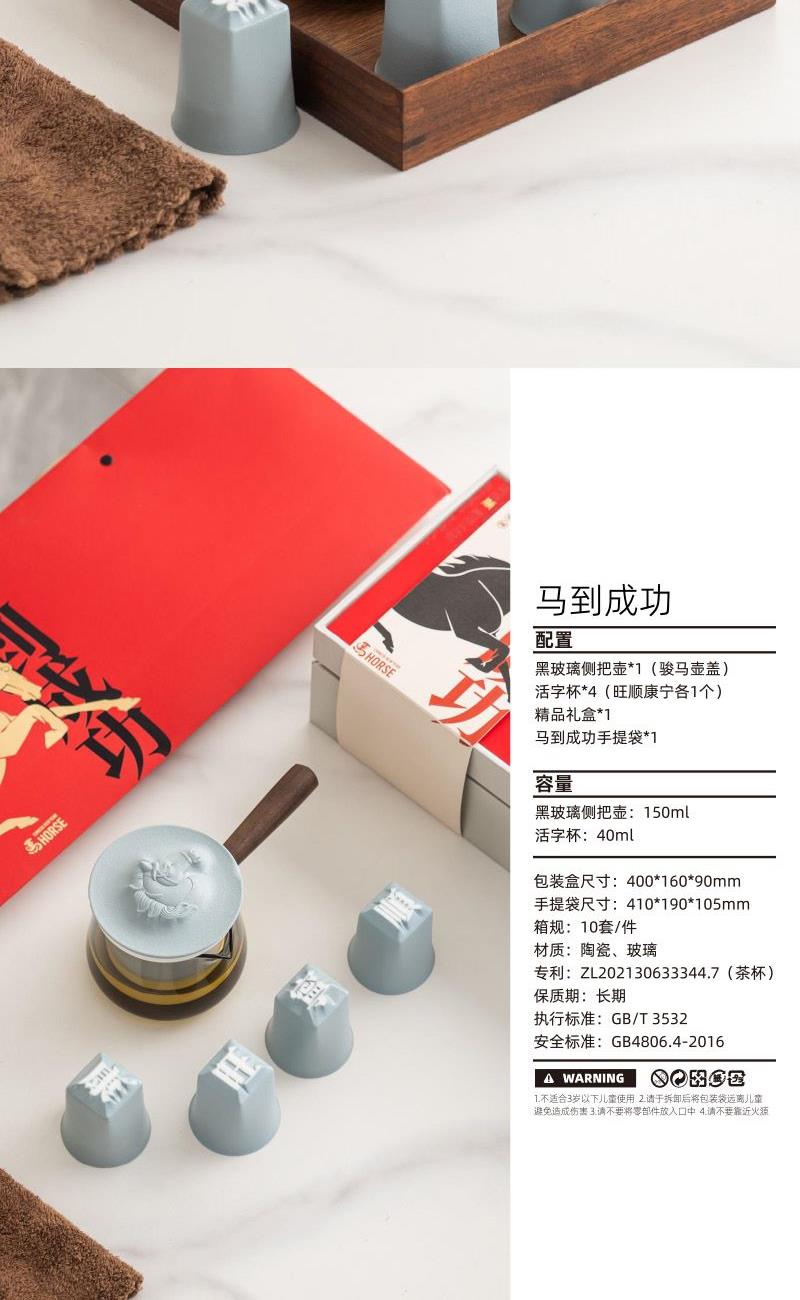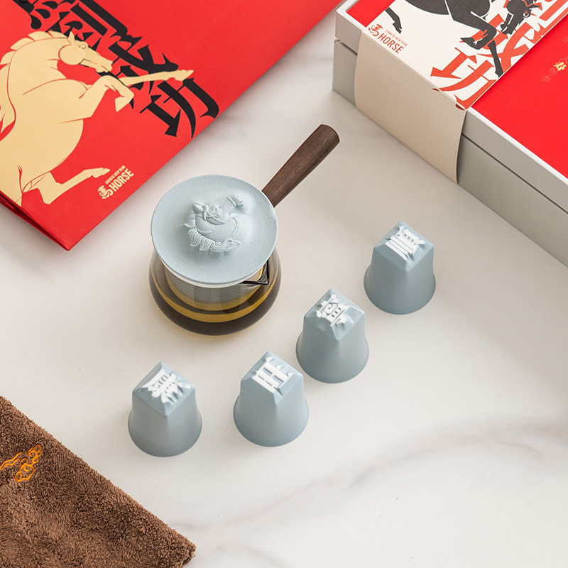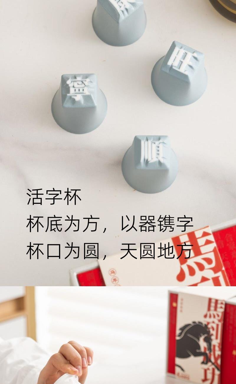 1:汉字杯历经1300度以上高温烧制,不含铅和镉等重金属。 2:杯底为方,杯口为圆,结合中国传统祝福文字,一字一模,手工塑形。 3:黑玻璃+实木手柄,实用美观,简洁易用。 4:中式包装,LOGO定制精美。 配置:活字杯*4(旺顺康宁各1) 黑玻侧把壶*1(立体马头纹) 材质:白玉瓷胎 颜色:玉石灰 尺寸:包装400*160*90mm 容量:壶150ml 杯40ml