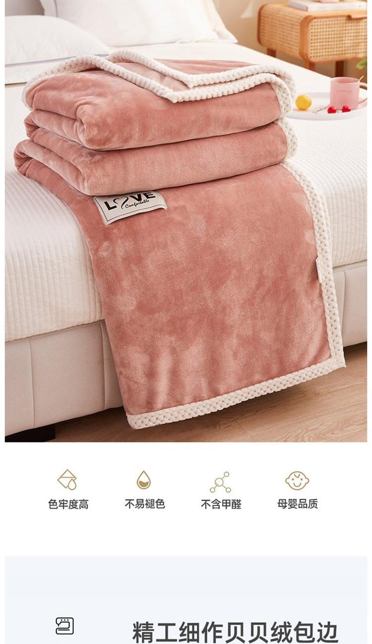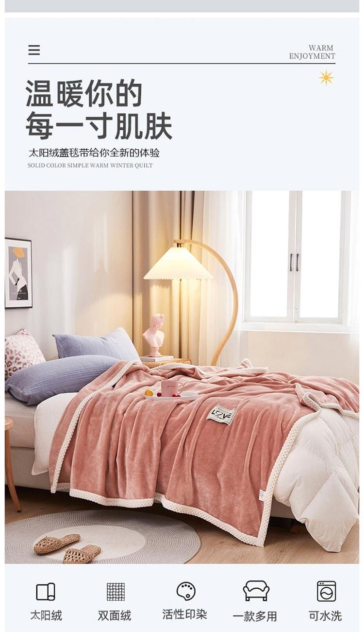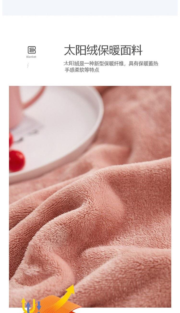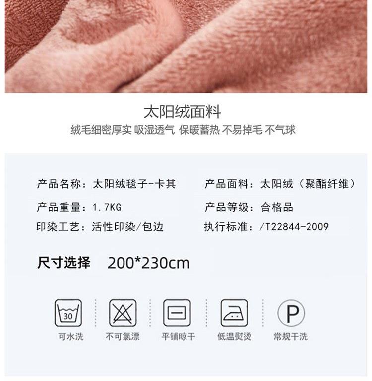 规格:200*230cm 面料:太阳绒(聚酯纤维) 重量:1.7KG 1.采用高克重太阳绒,能将人体皮肤呼吸出的湿气转换成热能来达到保暖的效果,让冬天不再冷飕飕 2.表面丰满的细腻绒毛覆盖不露织纹,比普通毛毯保暖性更强 3.采用新一代活性印染技术,久洗如新,不易褪色,不易掉毛