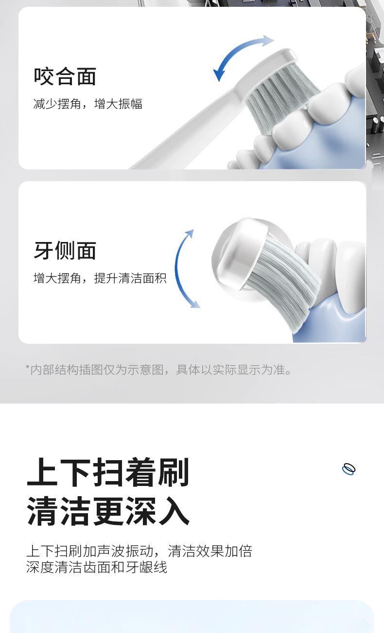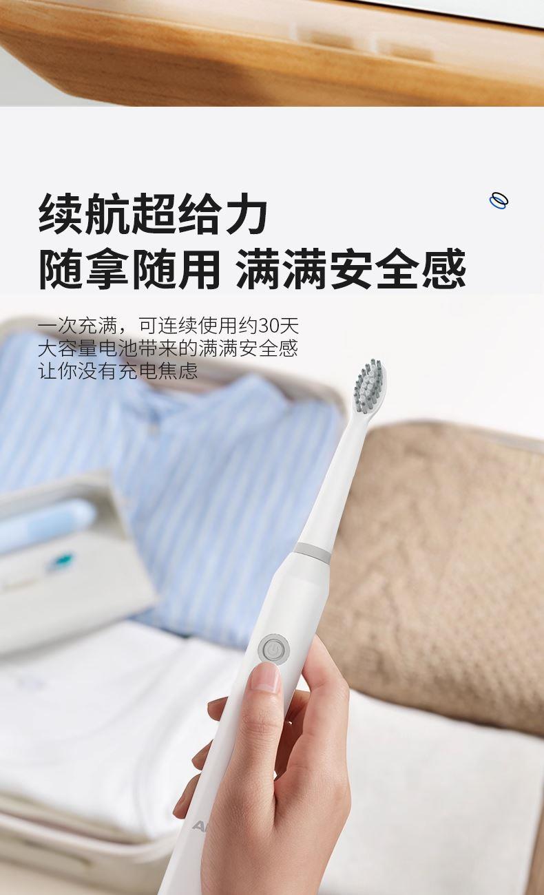 额定电压:3.7V⎓ 额定功率:0.5W 额定输入:5V~1A 电池容量:14500-500mAh 充电方式:Type-C直充充电 防水等级:IPX7 材质:手柄:ABS ,刷头:PP ,刷毛:PBT 精巧型刷头,柔韧软毛深入口腔 3种震动模式,多重选择,轻松洁齿 满电可持续使用30天,长续航更省心 高频率振幅,模拟人体刷牙习惯 IPX7全身防水,全身可放心水洗