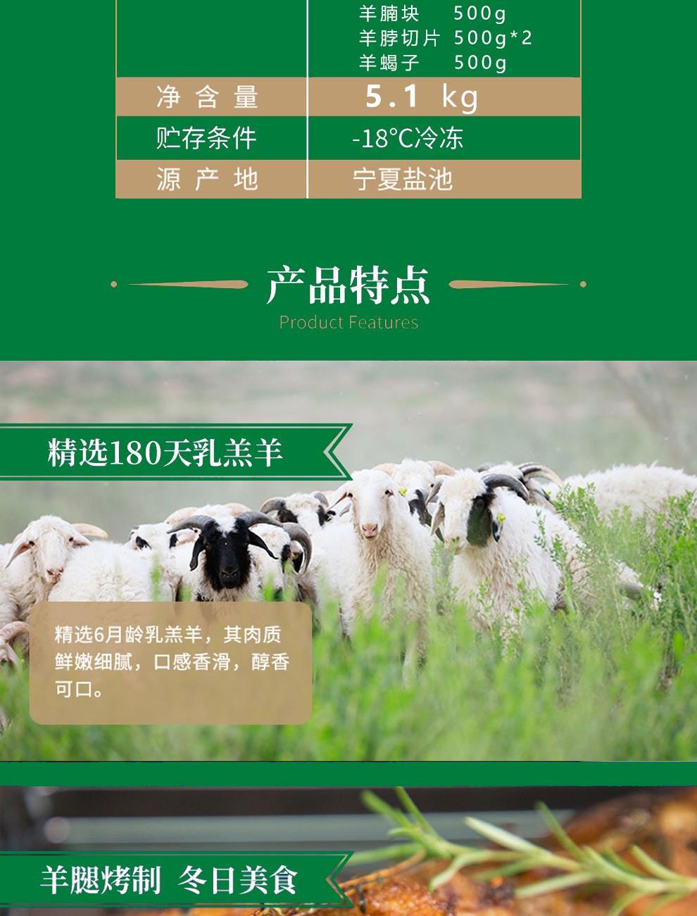 配置: 羊 排 1750g 羊前腿 1350g 羊腩块 500g 羊脖切片 500g*2 羊蝎子 500g 一方水土,养育一方特色滩羊盐池滩羊食百草 “吃中草药 (甘草、苦豆子)喝弱碱水"长大的羊。 中和体内酸性,使得肉质鲜嫩细腻,脂肪分布均匀原切滩羊羊肉不腥不膻。 宁夏盐池县 自然环境优异,气候冬长夏短 日照充足, 土地呈盐碱化,使得水源呈弱碱性, 盐池草原呈半沙漠化,其中含名贵中草药约110种左右 新鲜屠宰,保证肉质鲜美!