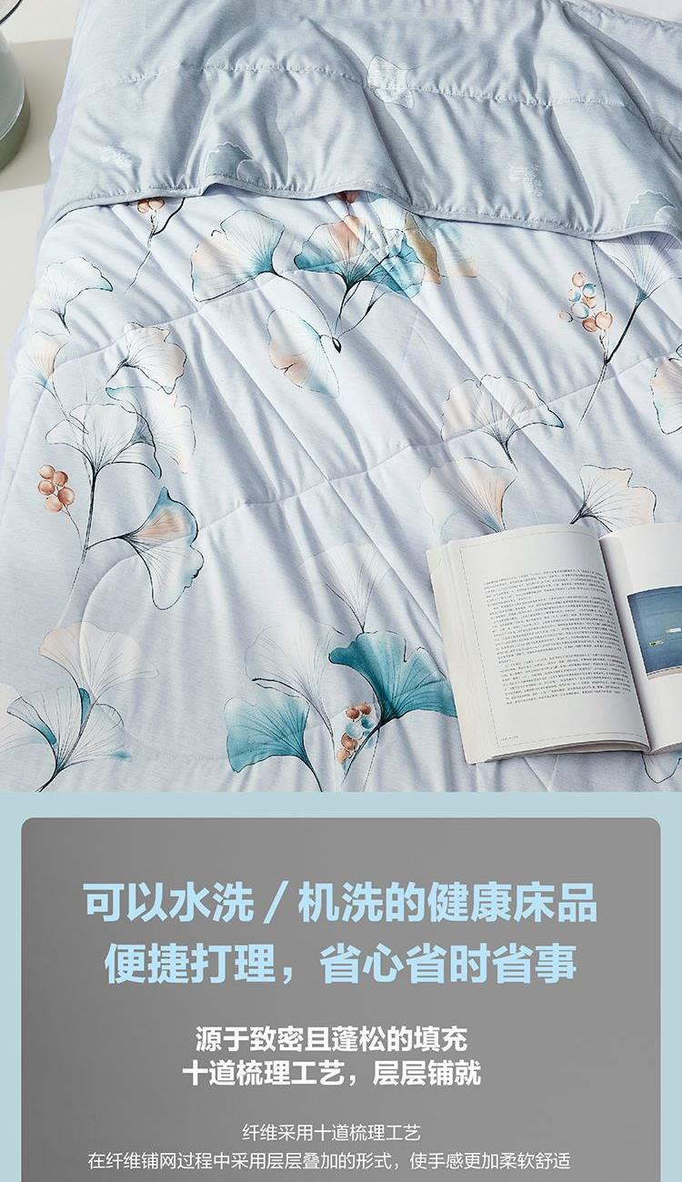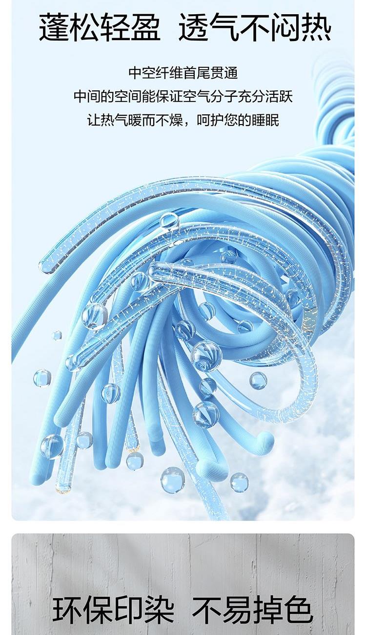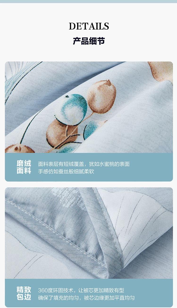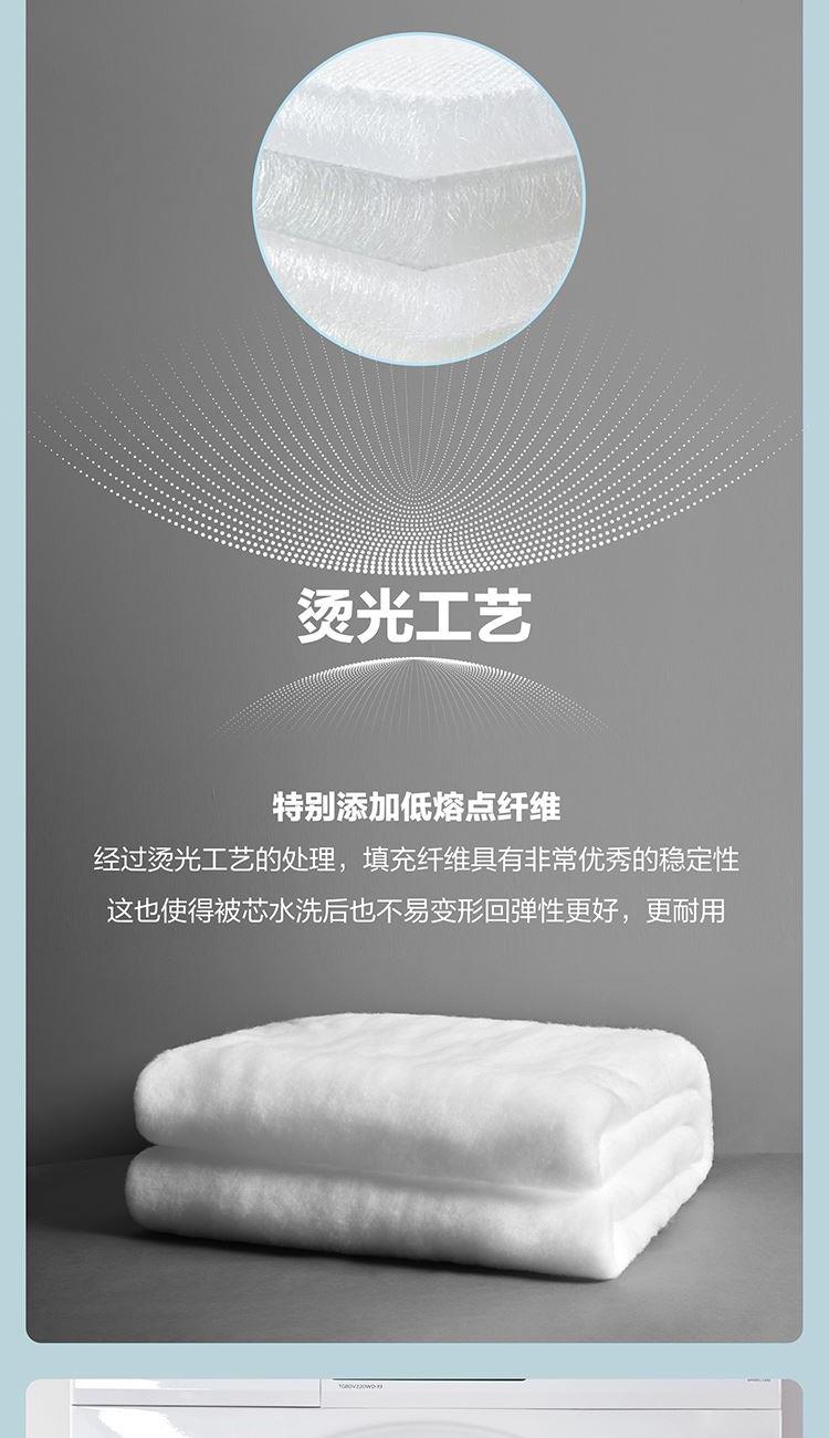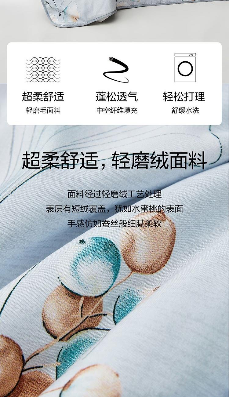面料材质: 聚酯纤维 填充材质: 聚酯纤维 规格尺寸:150*200cm 填充重量:228g 采用桃皮绒面料,表面附有细密的绒毛,手感绵密,亲肤舒适; 填充中空纤维,经过精细配棉、开松、铺棉等多道工序加工而成,采用层层叠加的形式手感更加的柔软舒适,后道烫光工艺使得被芯更加不容易跑毛,更加经久耐用;