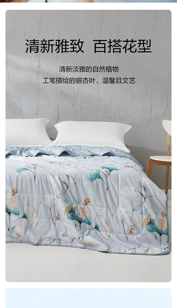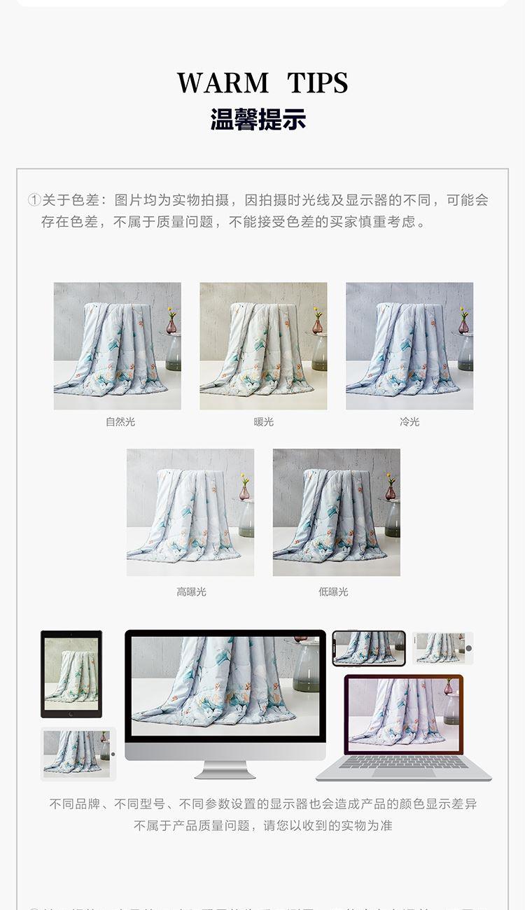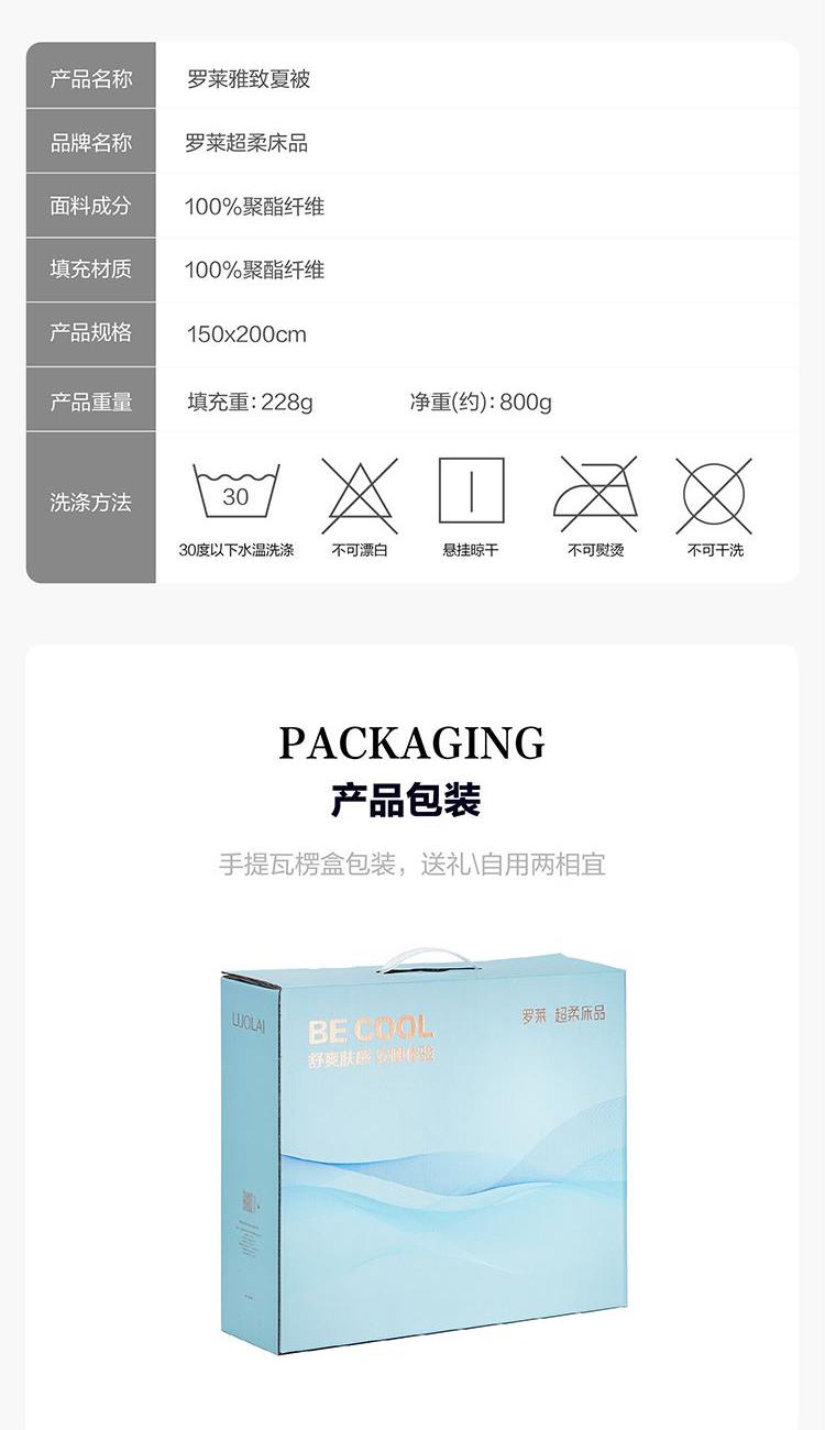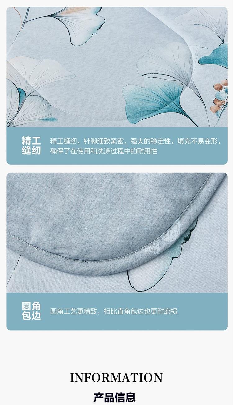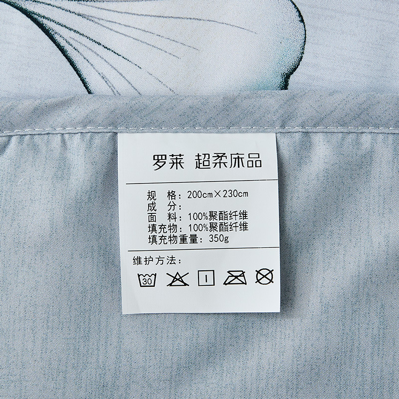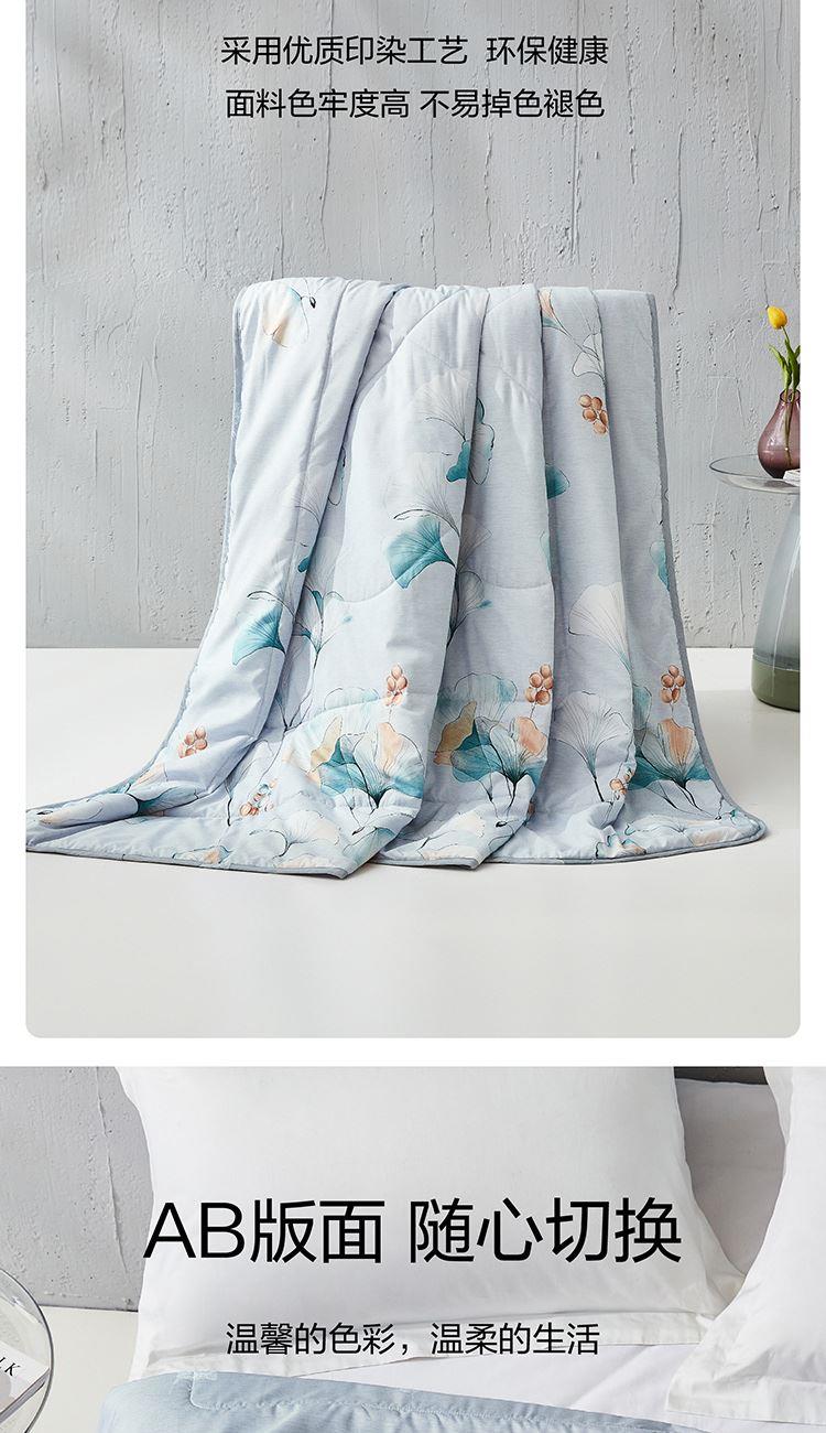 面料材质: 聚酯纤维 填充材质: 聚酯纤维 规格尺寸:150*200cm 填充重量:228g 采用桃皮绒面料,表面附有细密的绒毛,手感绵密,亲肤舒适; 填充中空纤维,经过精细配棉、开松、铺棉等多道工序加工而成,采用层层叠加的形式手感更加的柔软舒适,后道烫光工艺使得被芯更加不容易跑毛,更加经久耐用;