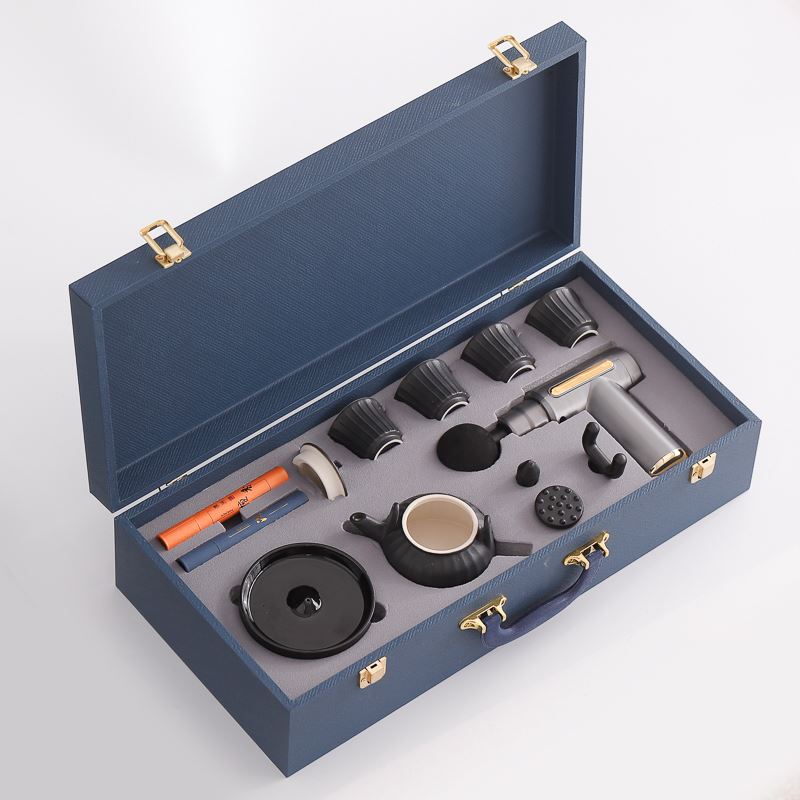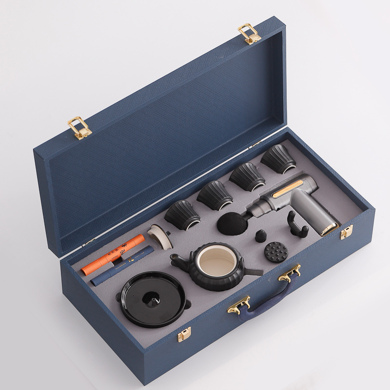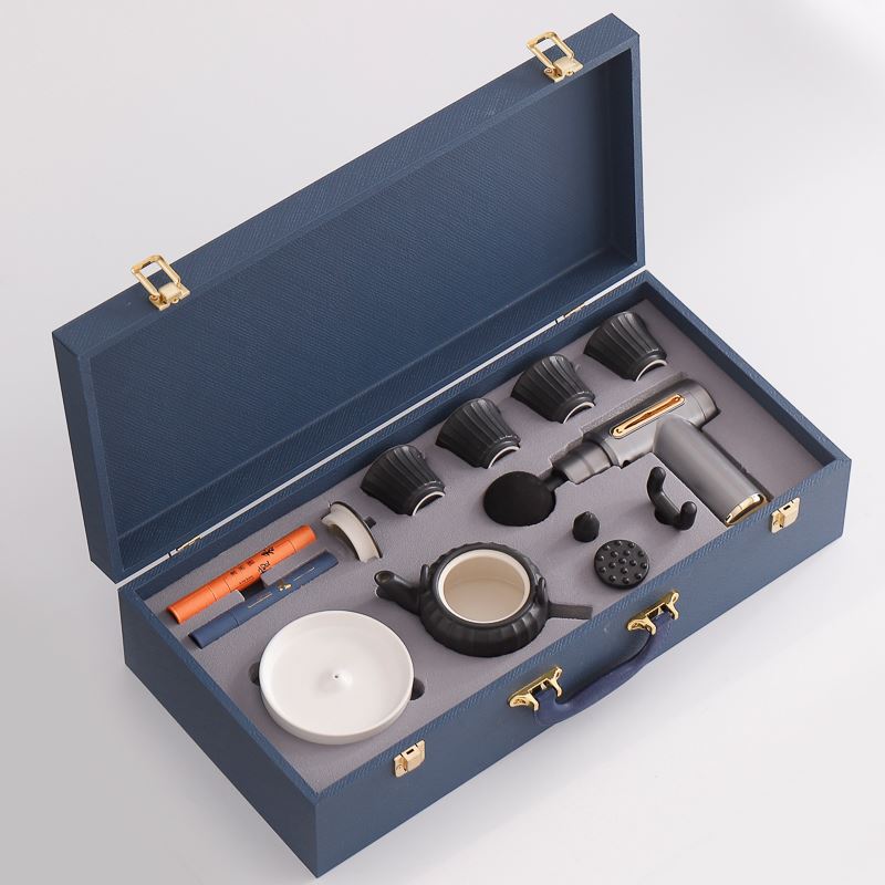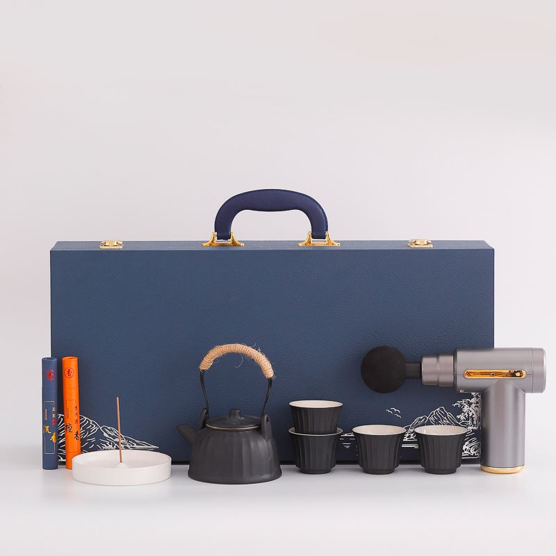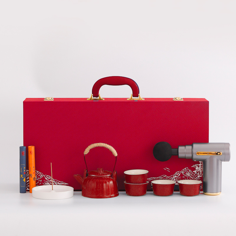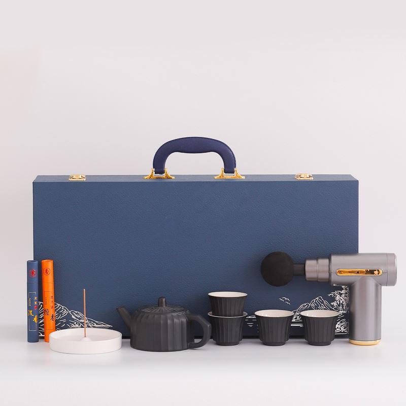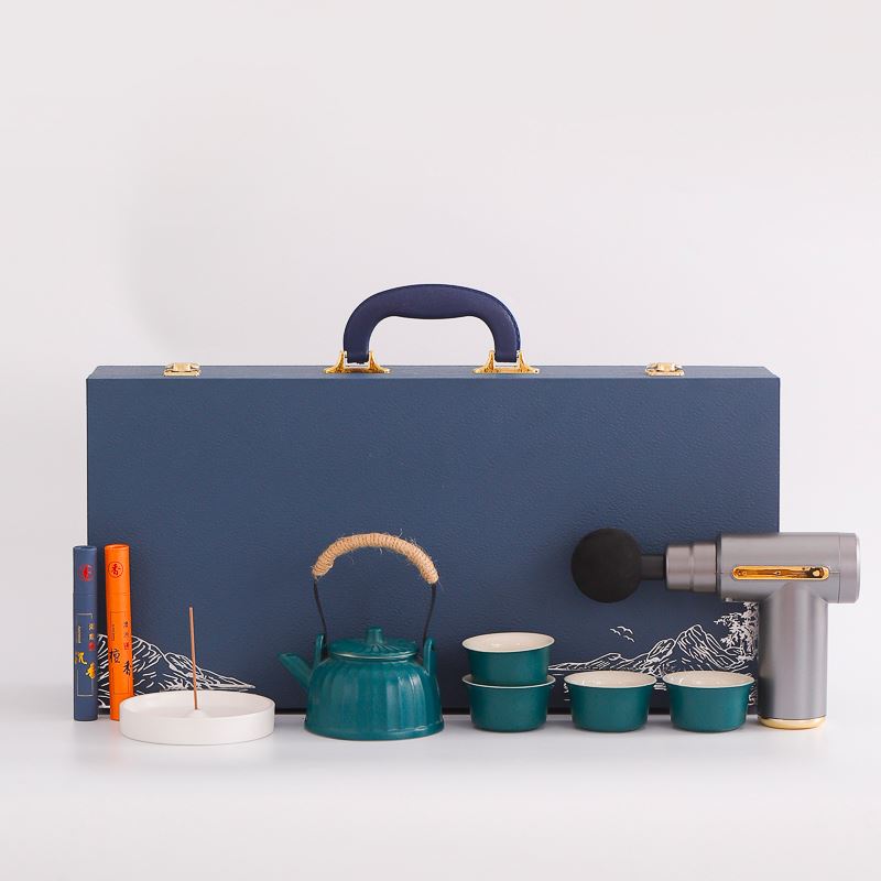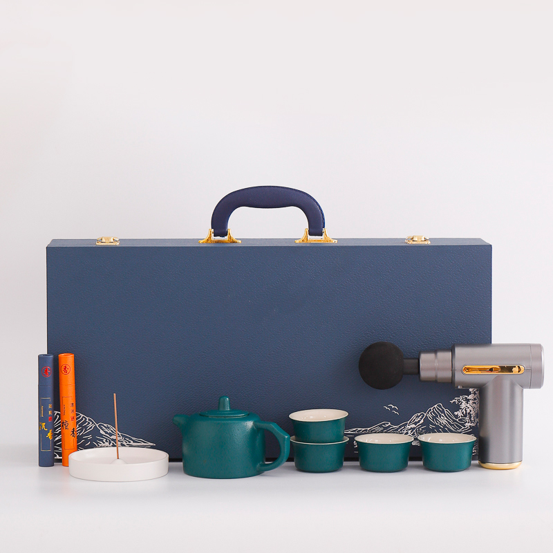 配 制: 1提梁壶4杯 1筋膜枪 1香盘 2条香 锦盒 规格: 办公杯14.5*10.4cm 筋膜枪:17.4*14cm 礼盒38.2*11cm 工艺:商务实用性礼品,上班族刚需产品。专业级筋膜枪,6档变速,4种按摩头,液晶触屏,深度缓解肌肉酸胀。