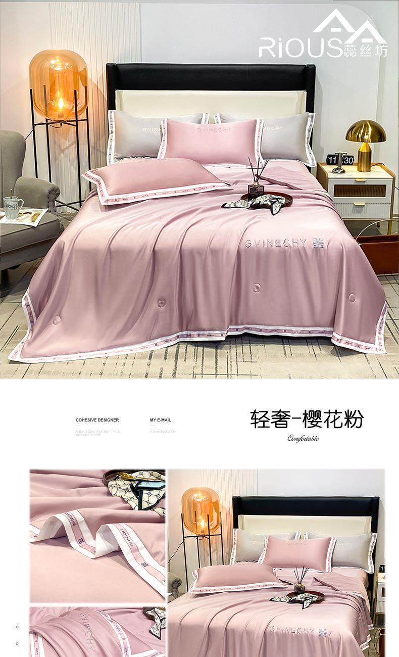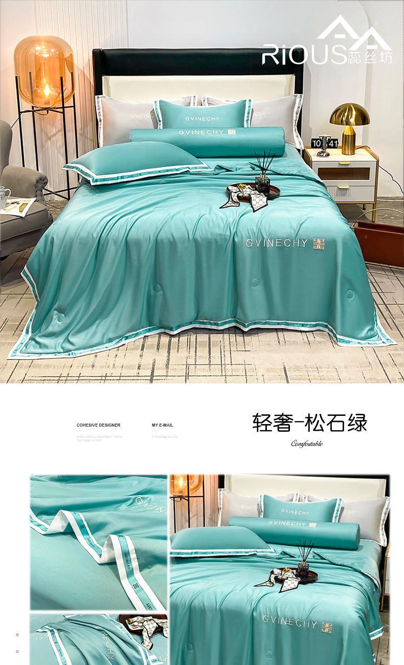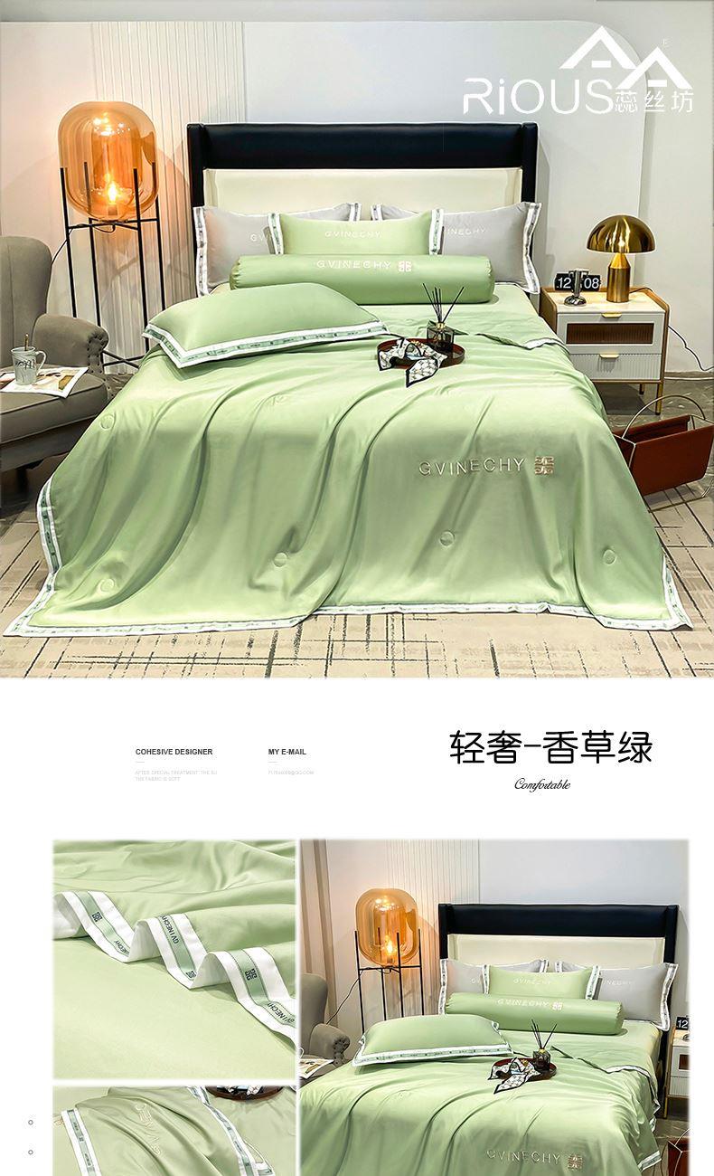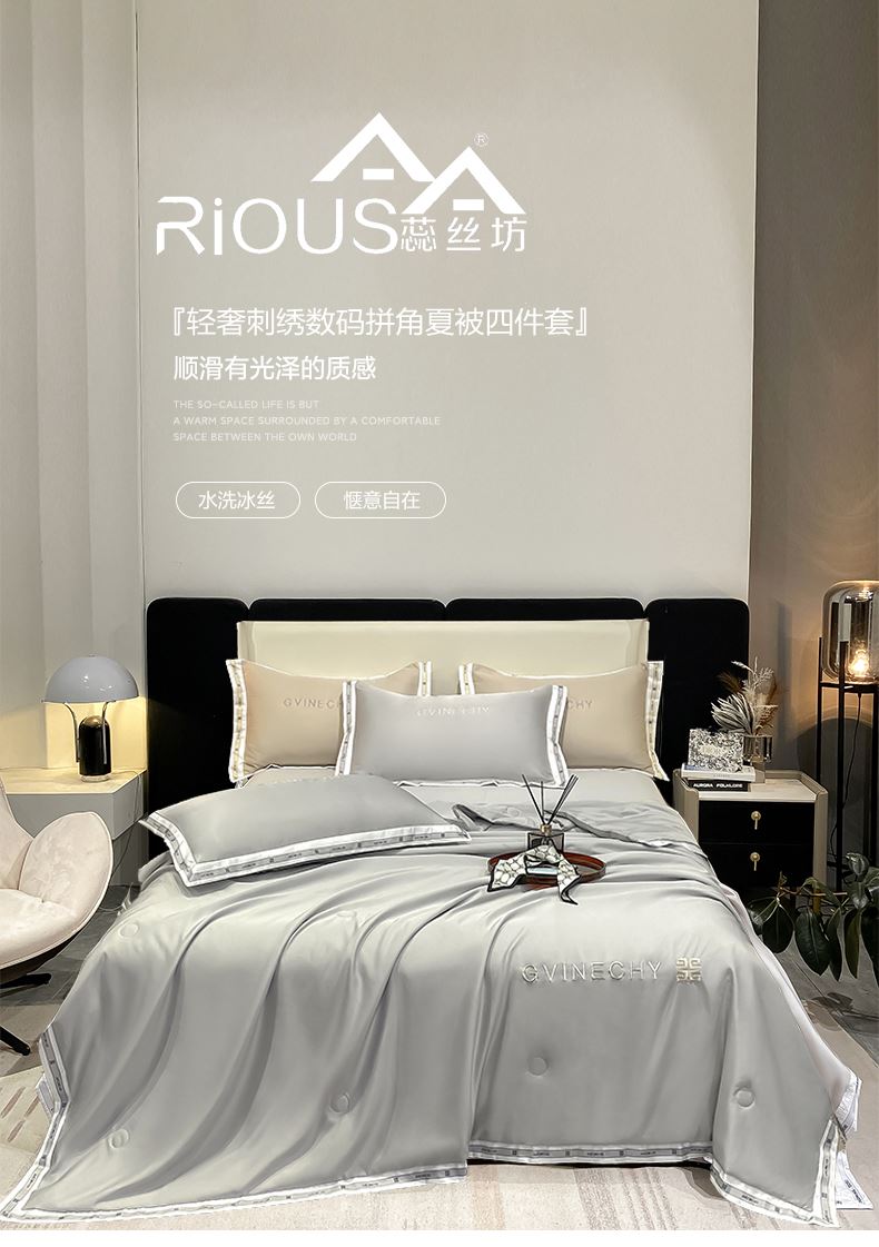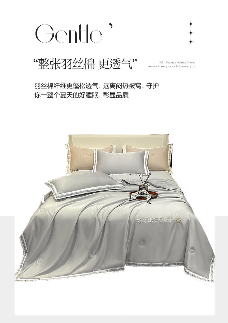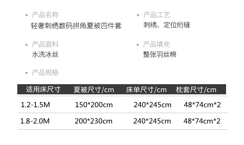 规格:夏被200*230cm 床单245*250cm 枕套48*74cm 面料:冰丝棉/聚酯纤维 花色:极光灰 / 优雅玉 / 香槟金 / 香草绿 / 樱花粉 / 松石绿 选用水洗冰丝面料,手感舒适光泽感强,爽滑舒适,整张羽丝棉填充,不结板蓬松透气,采用定位绗缝,防止跑棉,填充物更加均匀,精美刺绣,搭配宽边印花设计,可水洗机洗,活性印染,色彩靓丽,久用如新。