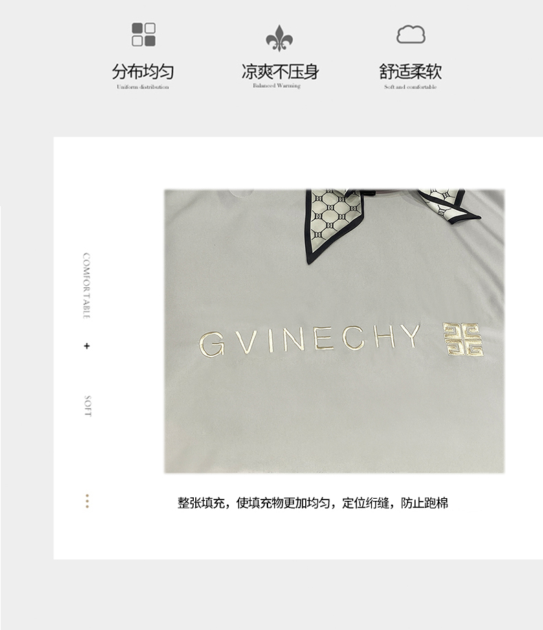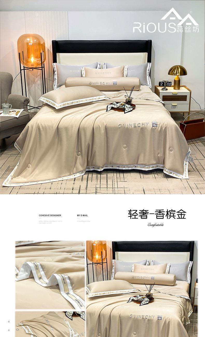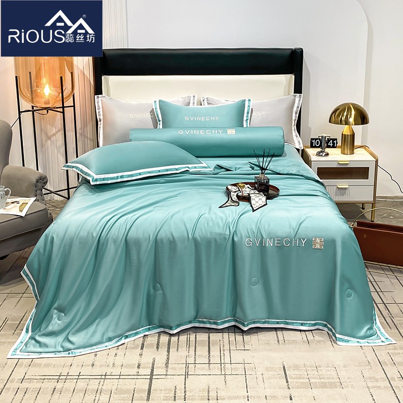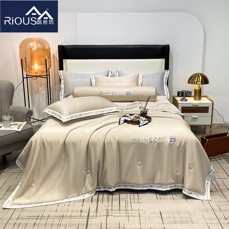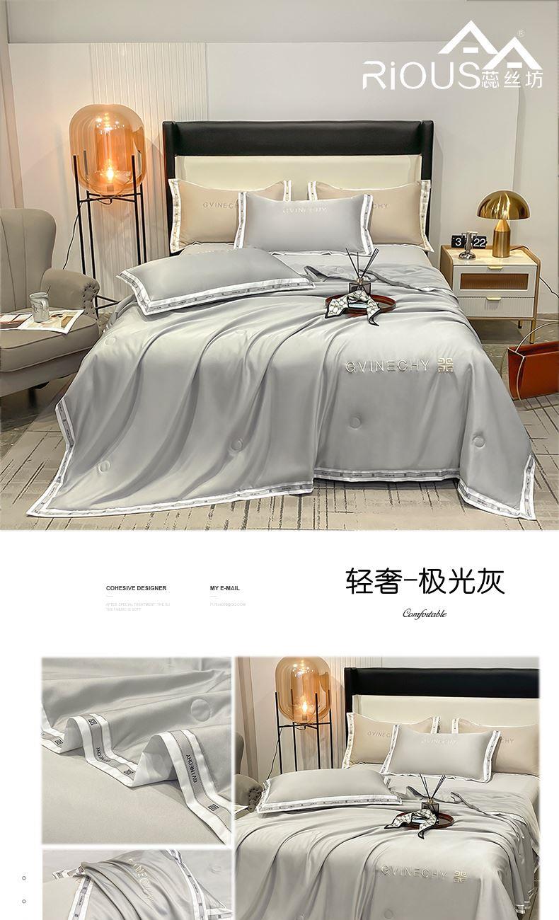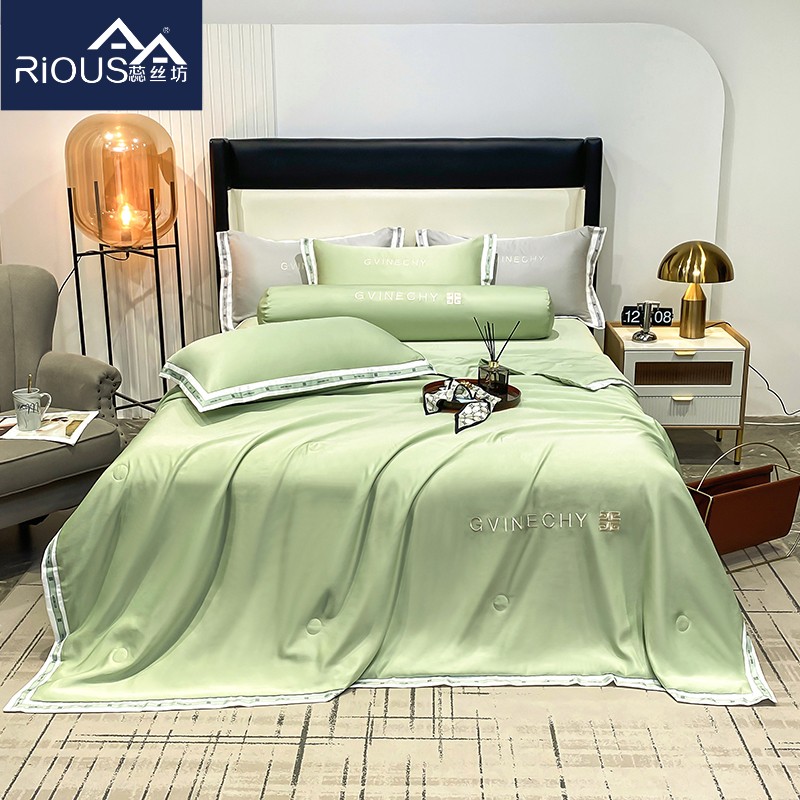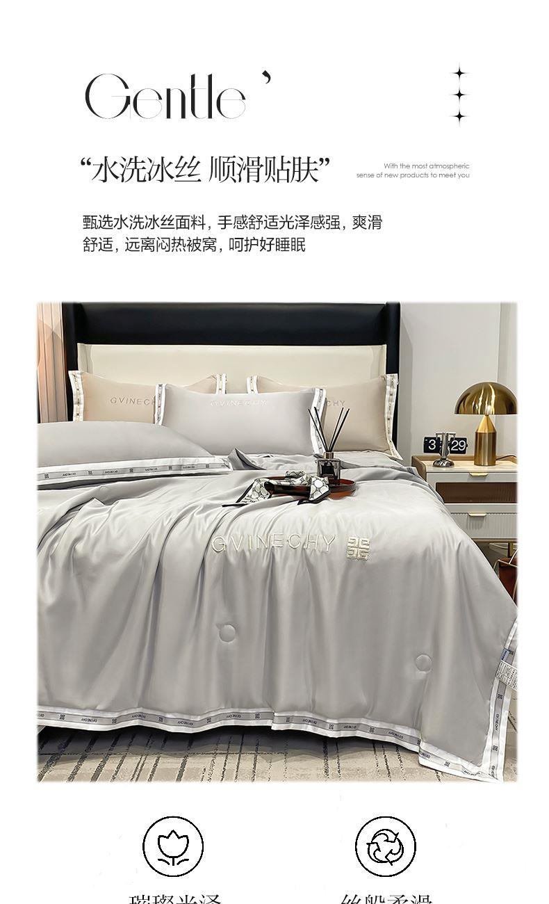 规格:夏被200*230cm 床单245*250cm 枕套48*74cm 面料:冰丝棉/聚酯纤维 花色:极光灰 / 优雅玉 / 香槟金 / 香草绿 / 樱花粉 / 松石绿 选用水洗冰丝面料,手感舒适光泽感强,爽滑舒适,整张羽丝棉填充,不结板蓬松透气,采用定位绗缝,防止跑棉,填充物更加均匀,精美刺绣,搭配宽边印花设计,可水洗机洗,活性印染,色彩靓丽,久用如新。