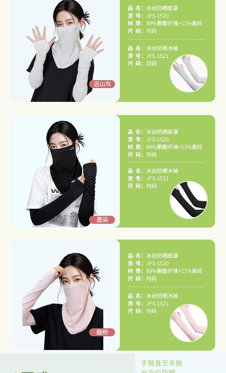 备 注 : 冰袖和面罩各有独立包装、可套装购买也可单独购买 货 号: JFS-1520+JFS-1521 颜 色: 远山灰、墨染、胭粉 材 质: 89%聚酯纤维+11%氨纶 防晒+++、水洗不减防晒力、凉感升级 持久冰爽、手臂直至手腕、全部防晒 轻量≈100g,双重又透气,云感防晒~ 四面高弹不紧绷,可选尺寸:F(均码)