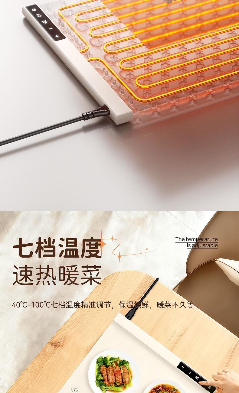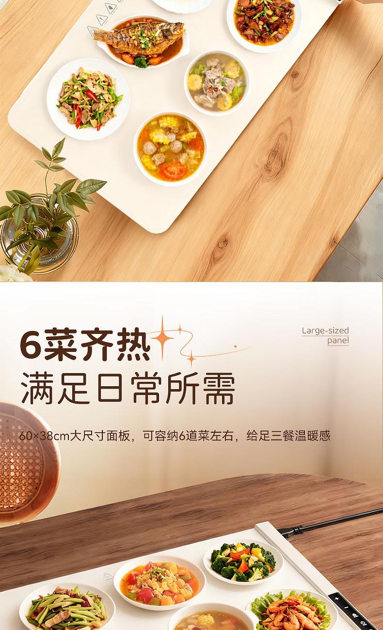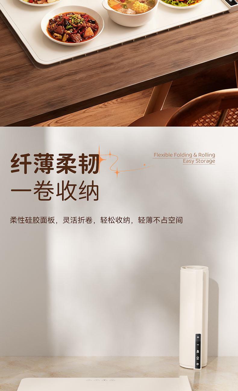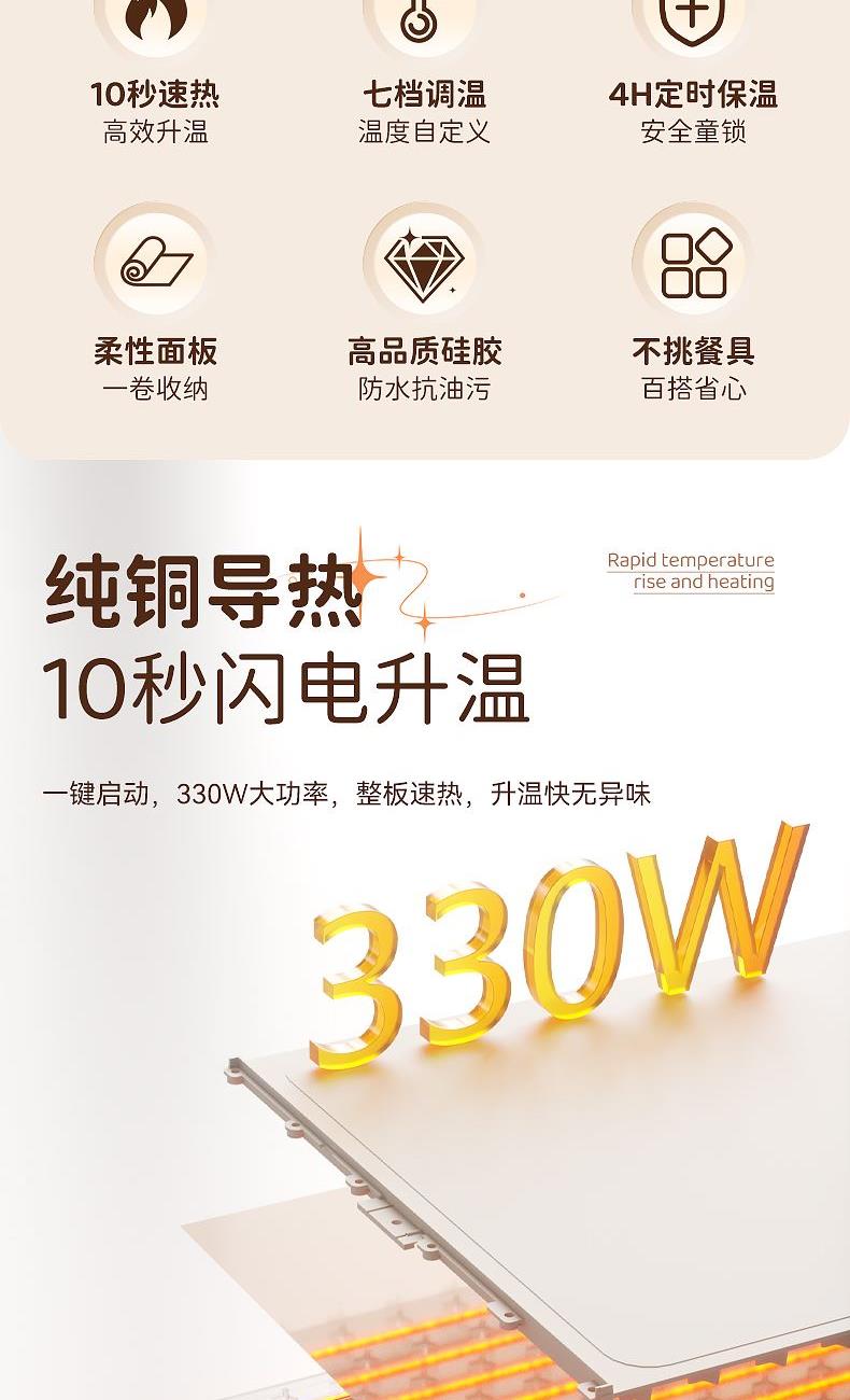 产品尺寸:600*380mm 包装尺寸:405*110*110mm 产品重量:1325g 输入:110-220V 功率:330W 定时功能:支持,1H、2H、3H、4H, 12小时自动关机 产品档位:7档,预热5-10分钟 附加功能:7档温度,40℃、50℃、60℃、70℃、80℃、90℃、100℃ 材质:PP+电子元件 颜色:米色 7档调温,定时通缩,整板速热,灵敏触控,一键启动,硅胶高脚柱, 隔热防止烫坏桌面,防烫边缘,误触不烫手,防滑硅胶柱,安稳置于桌面,高品质硅胶面板,重油污一擦即净, 发热铜线,10秒升温,速热锁温,升温无异味,容纳6盘左右,满足一家人日常所需, 1-4小时智能定时保温,柔性可卷,一卷收纳,不挑材质(玻璃陶瓷不锈钢锡纸奶瓶),无需专门餐具,摆上就加热