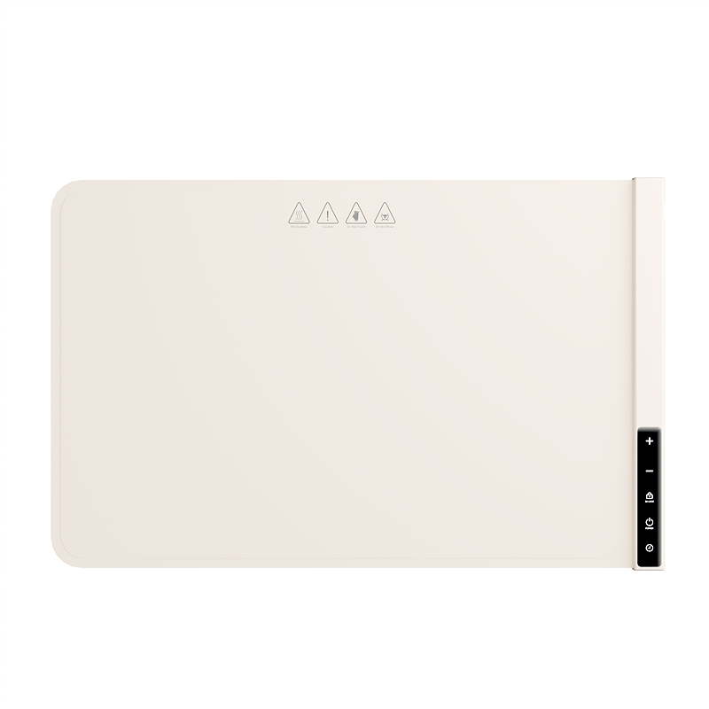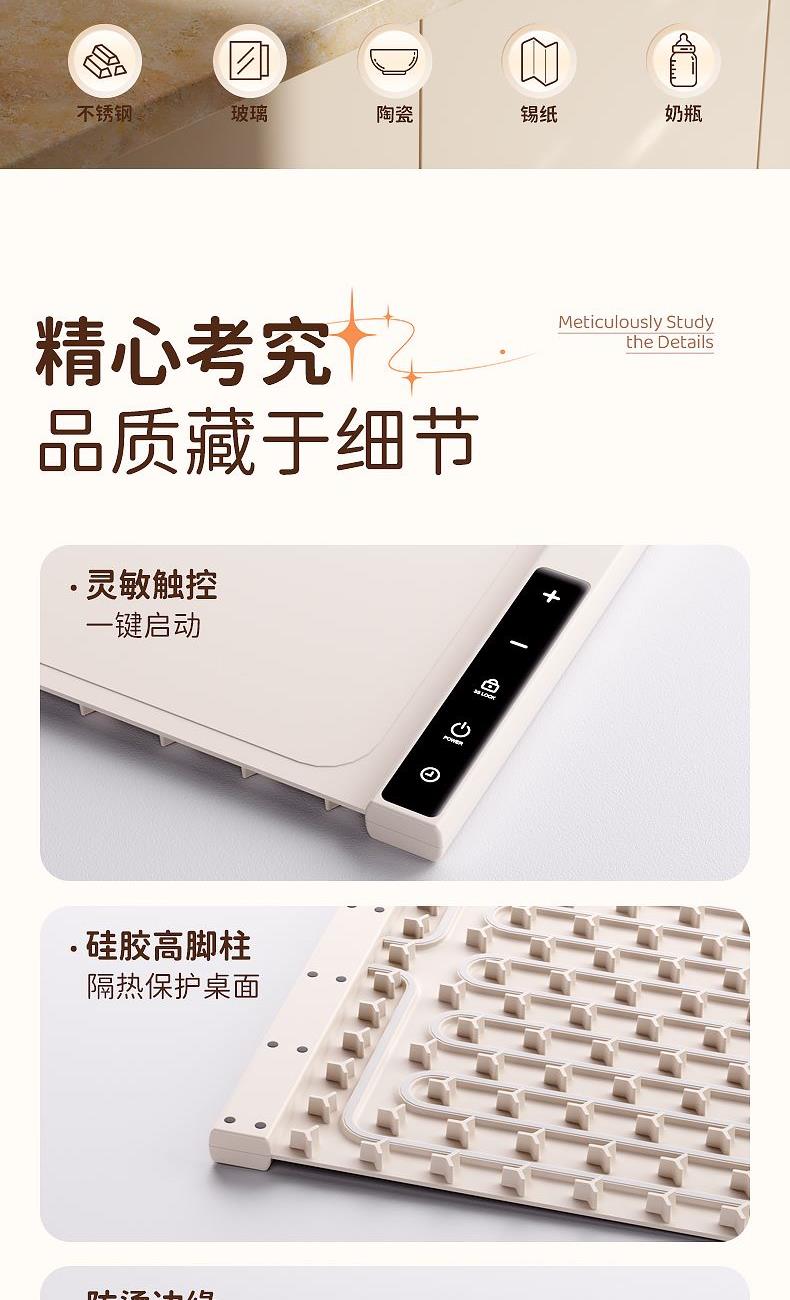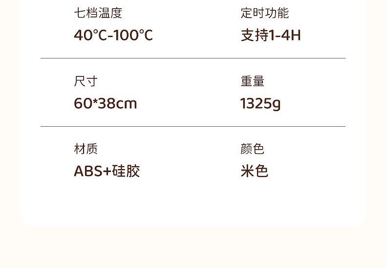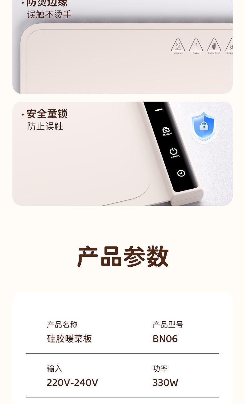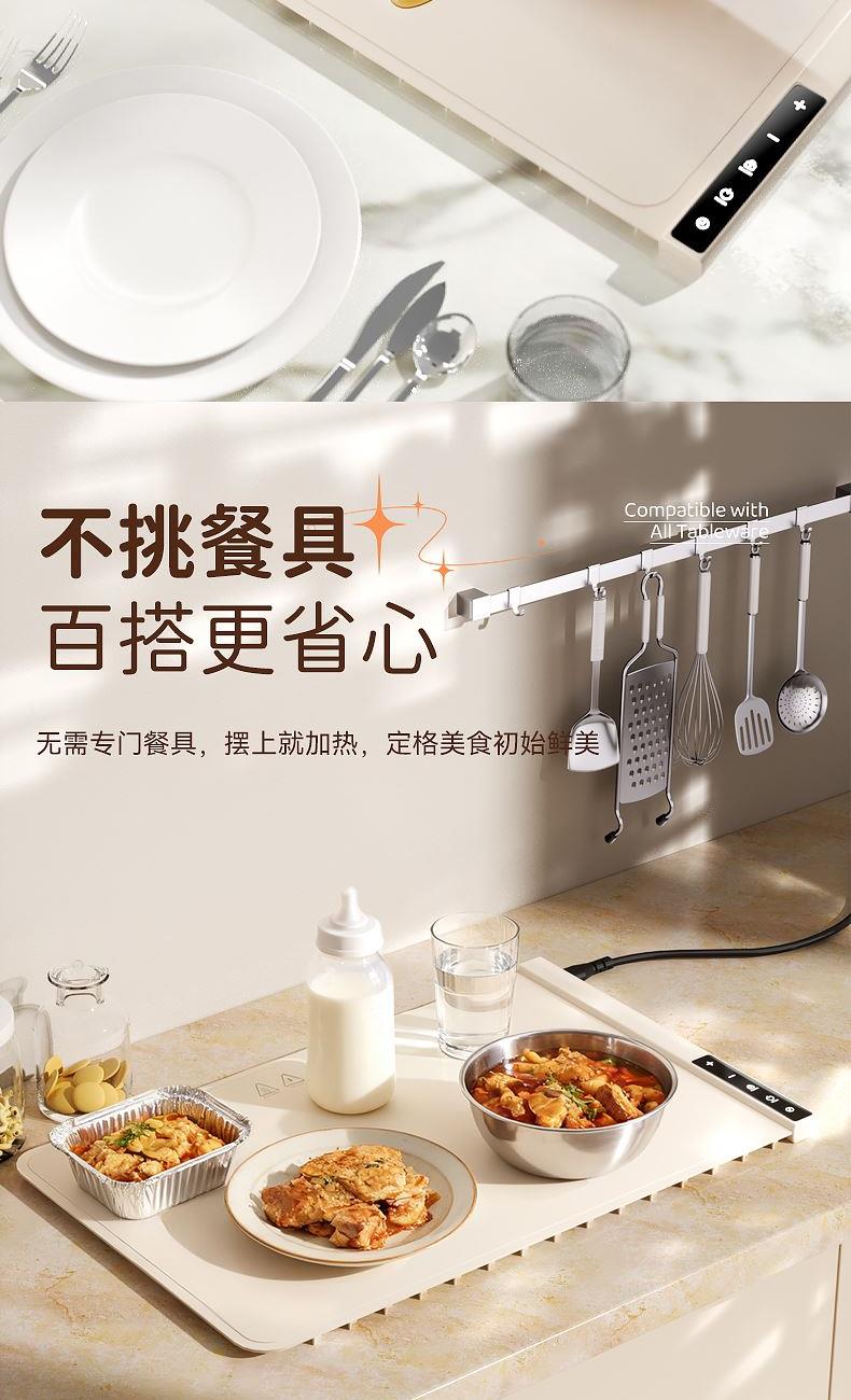产品尺寸:600*380mm 包装尺寸:405*110*110mm 产品重量:1325g 输入:110-220V 功率:330W 定时功能:支持,1H、2H、3H、4H, 12小时自动关机 产品档位:7档,预热5-10分钟 附加功能:7档温度,40℃、50℃、60℃、70℃、80℃、90℃、100℃ 材质:PP+电子元件 颜色:米色 7档调温,定时通缩,整板速热,灵敏触控,一键启动,硅胶高脚柱, 隔热防止烫坏桌面,防烫边缘,误触不烫手,防滑硅胶柱,安稳置于桌面,高品质硅胶面板,重油污一擦即净, 发热铜线,10秒升温,速热锁温,升温无异味,容纳6盘左右,满足一家人日常所需, 1-4小时智能定时保温,柔性可卷,一卷收纳,不挑材质(玻璃陶瓷不锈钢锡纸奶瓶),无需专门餐具,摆上就加热