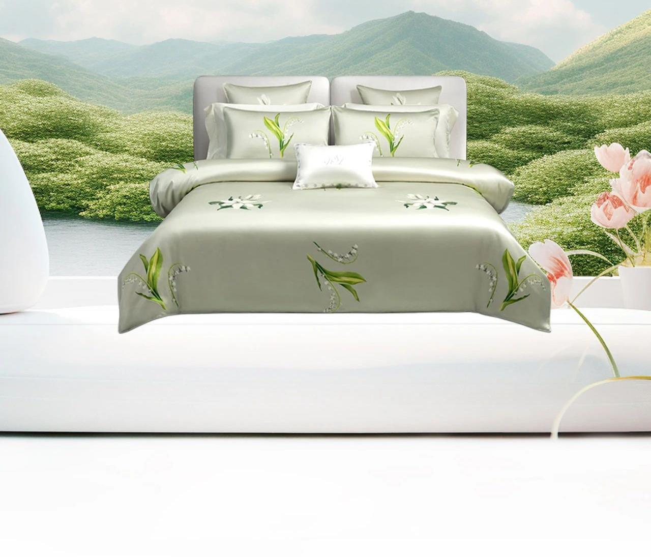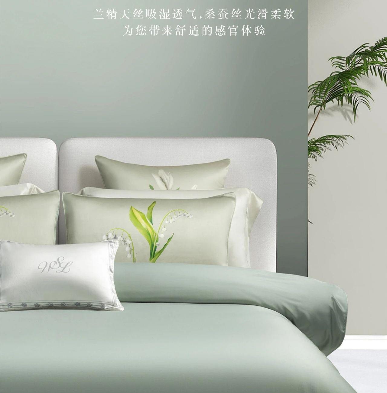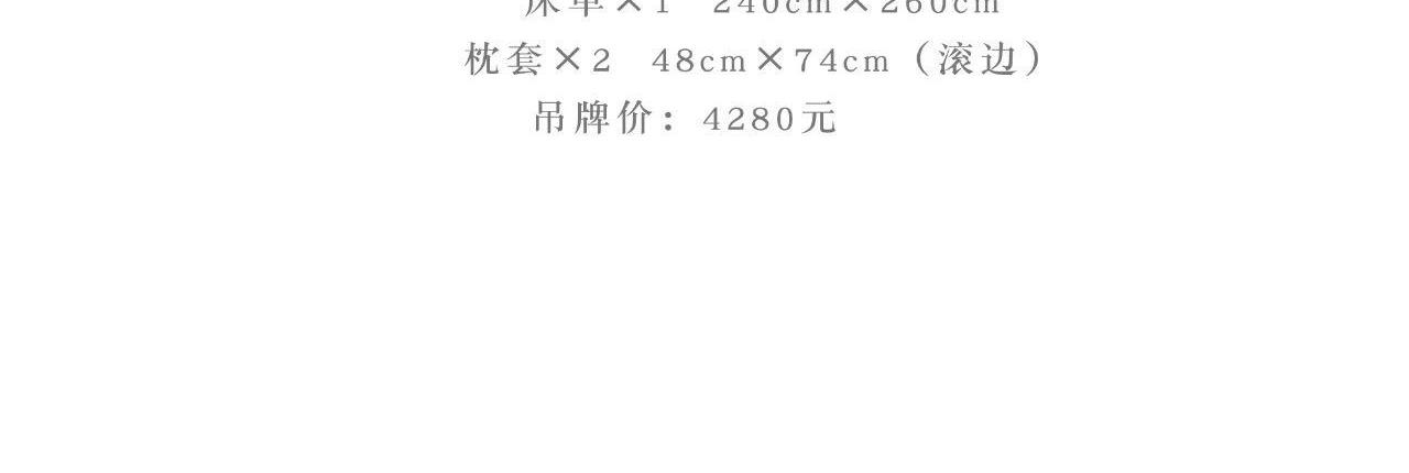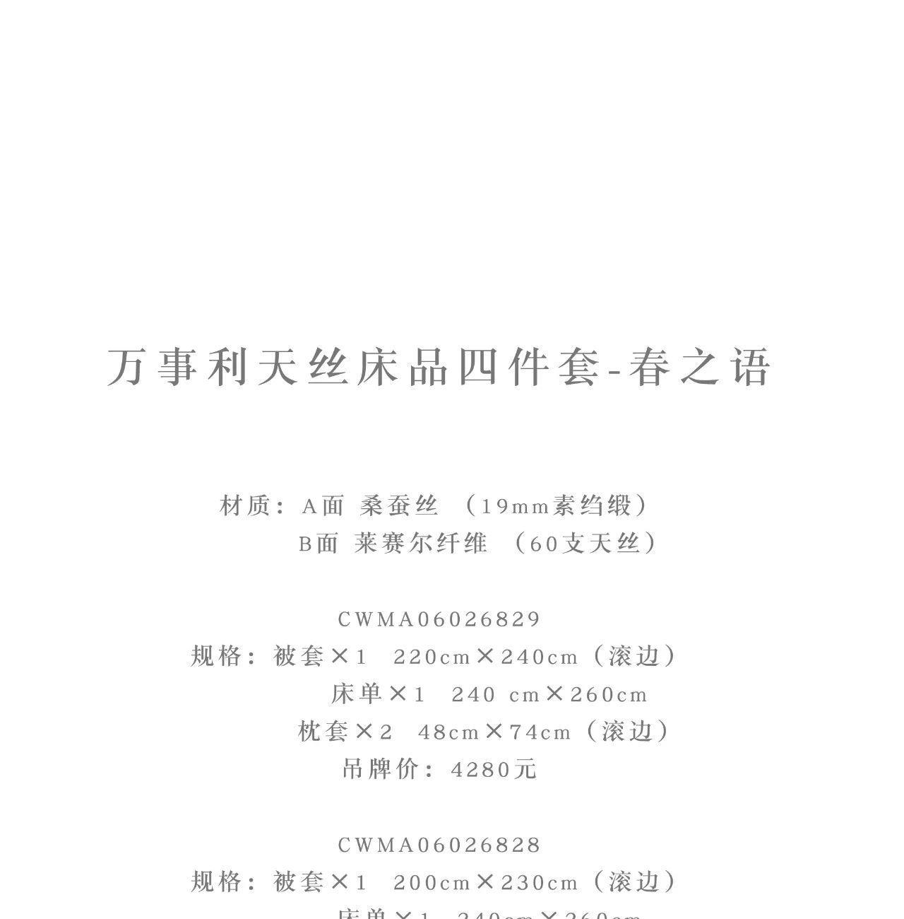 材质:A面桑蚕丝(19mm素绉缎) B面莱赛尔纤维 (60支天丝) CWMA06026829 规格:被套×1220cmX240cm(滚边) 床单X1240cmX260cm 枕套X248cmX74cm(滚边) CWMA06026828 规格:被套X1200cmX230cm(滚边) 床单X1240cmX260cm 枕套×248cmX74cm(滚边)
