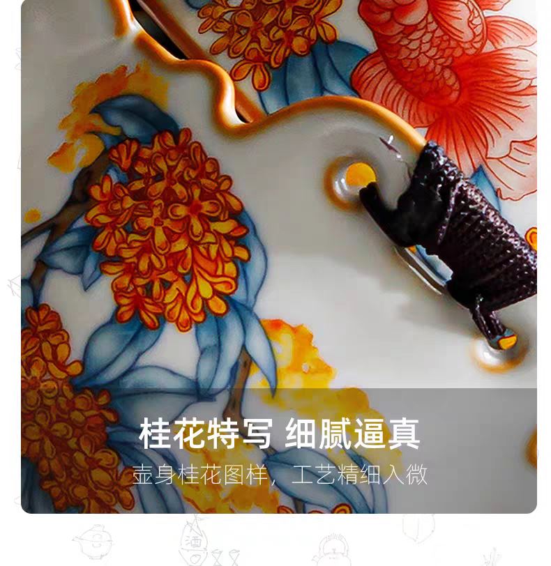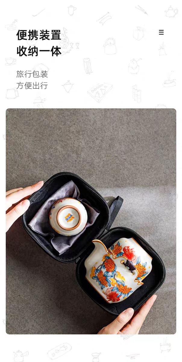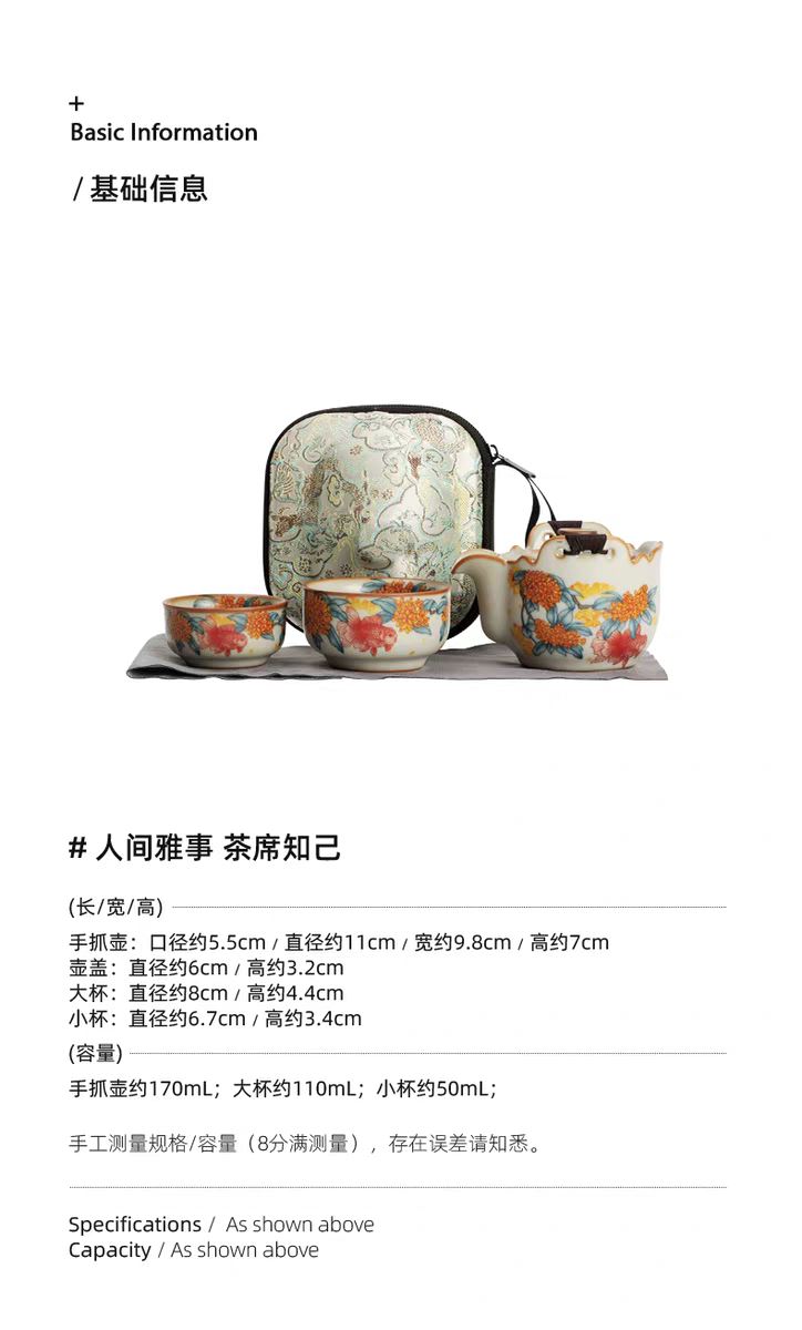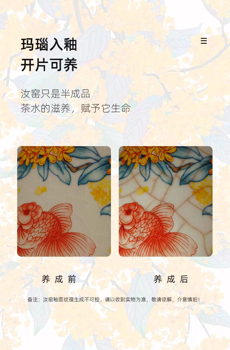 规 格:壶:11*9.8cm 大杯8*4.4cm 小杯6.7*3.4cm 配 制: 1壶2杯 1茶巾 1旅行包 材质:黄汝瓷 锦布 推荐说明:金鲤桂花,寓意金贵,连年有鱼。杯内外皆有画面。亚黄汝瓷,玛瑙入釉,蝉翼开片。技术新品,采用高价优质瓷土,紫口铁足。立体浮雕杯身。杯身开片,可养瓷。