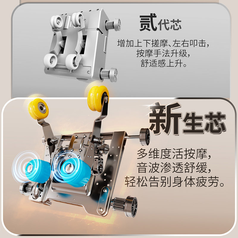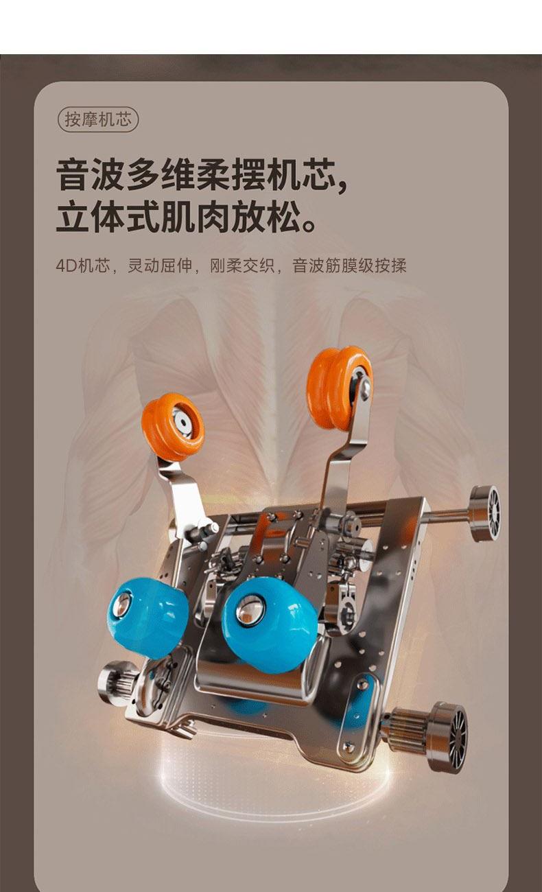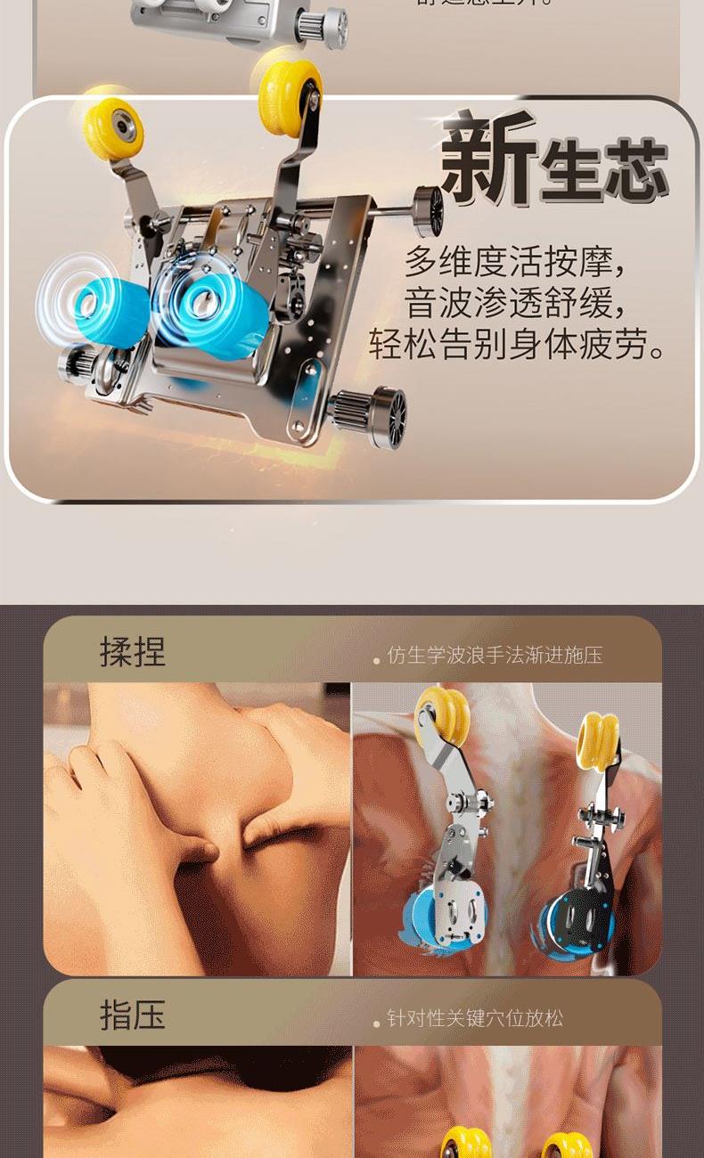 1、4D音波机芯,灵动屈伸,刚柔交织,音波筋膜级按揉 2、人体工学SL导轨,适配脊柱生理曲度,95%覆盖按摩 3、一体式头罩,降噪睡眠,头等舱体验沉浸式按摩 4、揉捏、指压、推拿、柔敲、敲打、气囊、热敷,卸下奔波的疲惫
