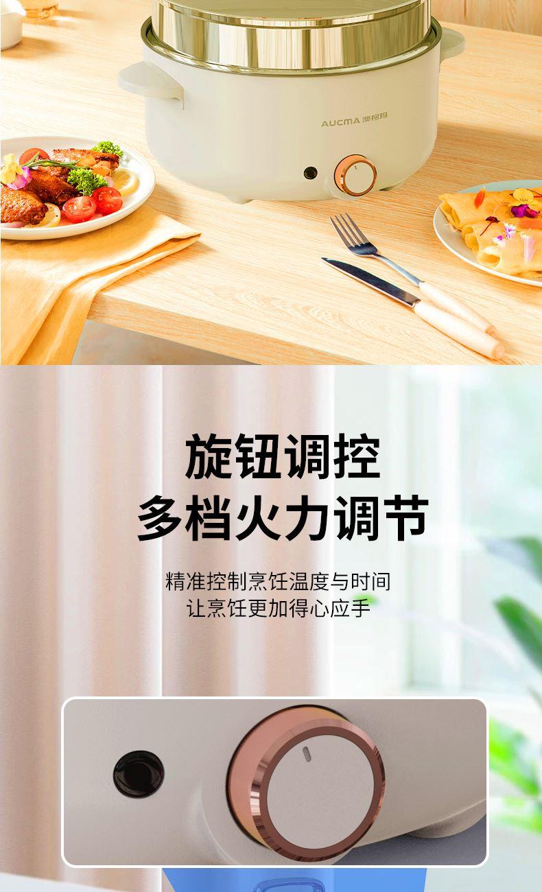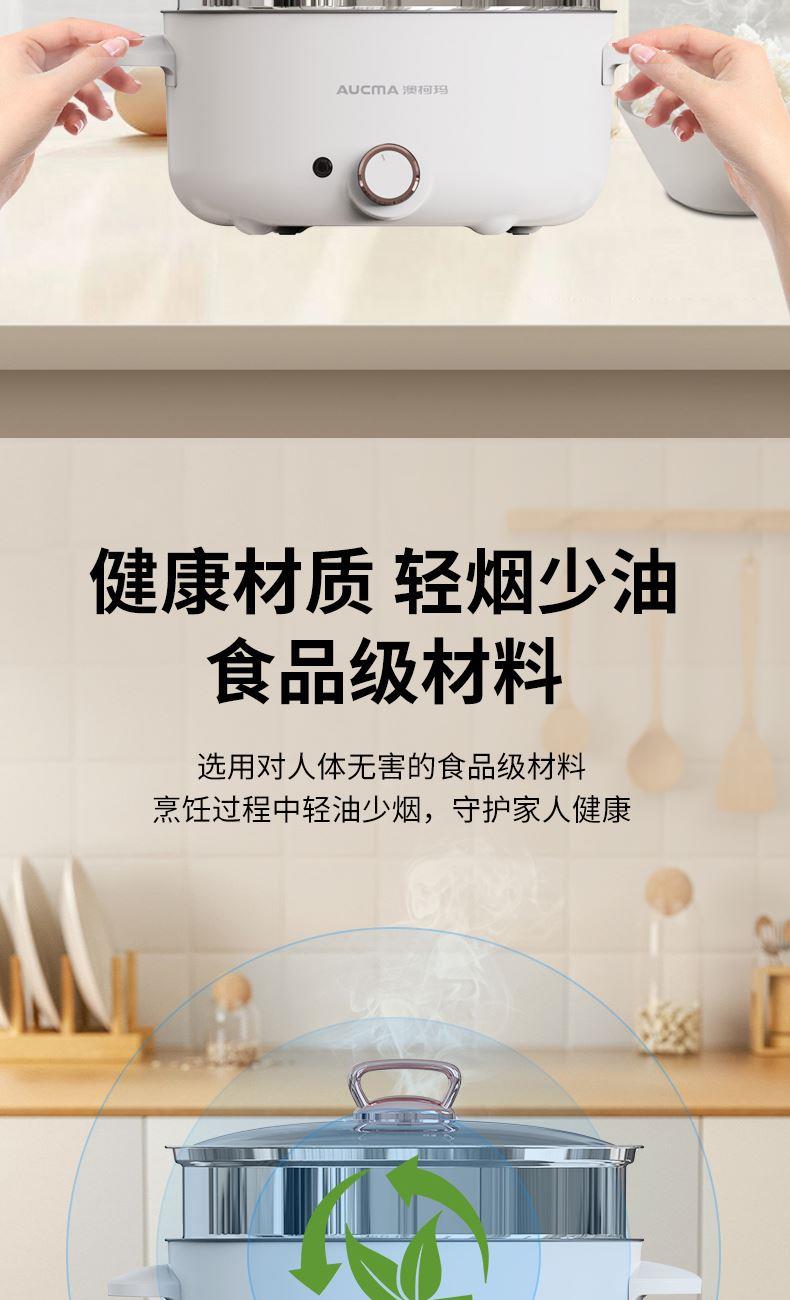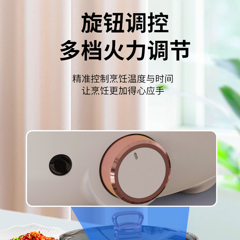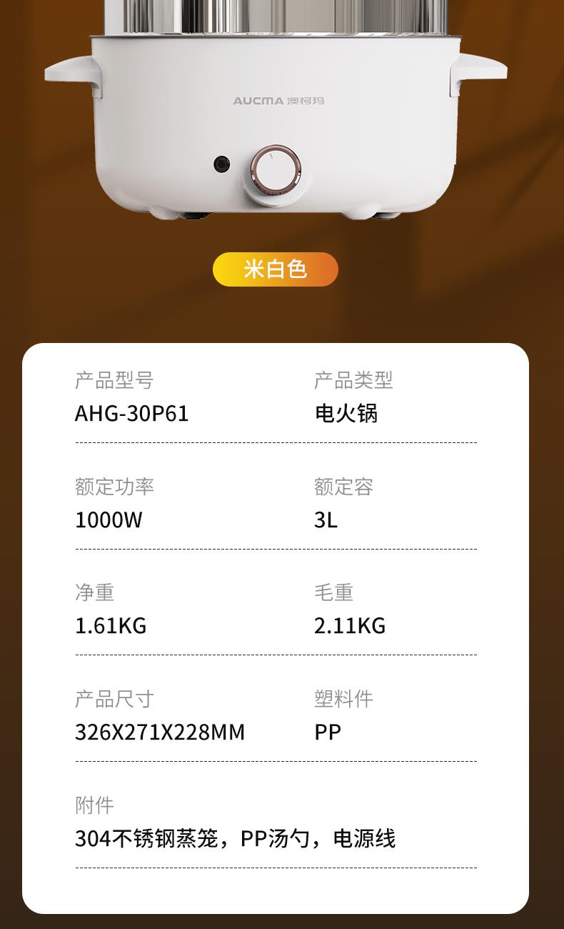 操控方式:旋钮式 额定功率:1000W 容量:3L 档位:2档 颜色:奶白色 内胆材质:特氟龙 一锅多用,产品蒸、煮、涮,轻食早餐,快手料理,美味同步 产品升级整圈发热管,效率高,加热更快 超温断电保护,控温多重防护 产品选用对人体健康安全食品级材料,轻油少烟,易清洗 产品采用防烫把手,操作快捷,双层锅体,隔热更耐用