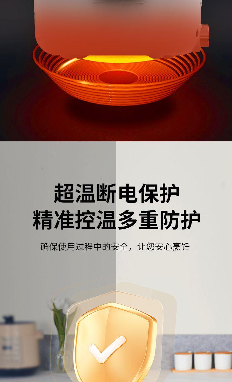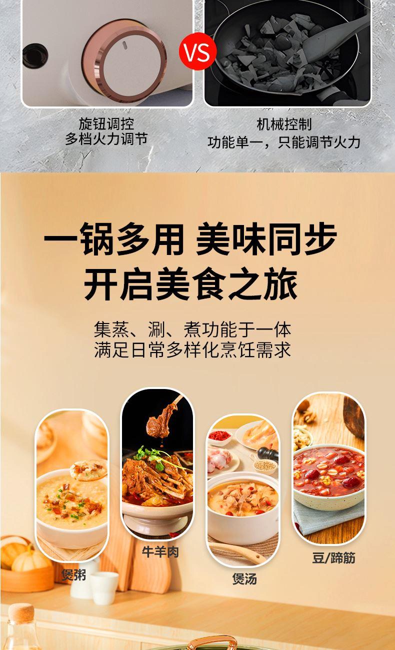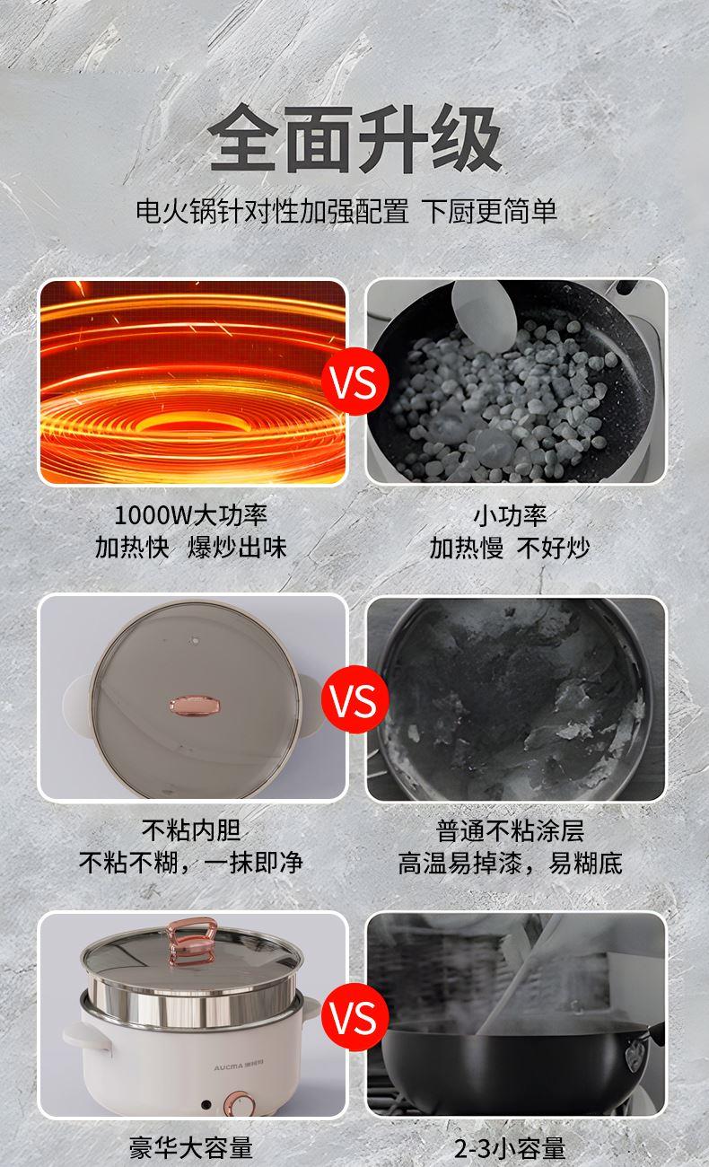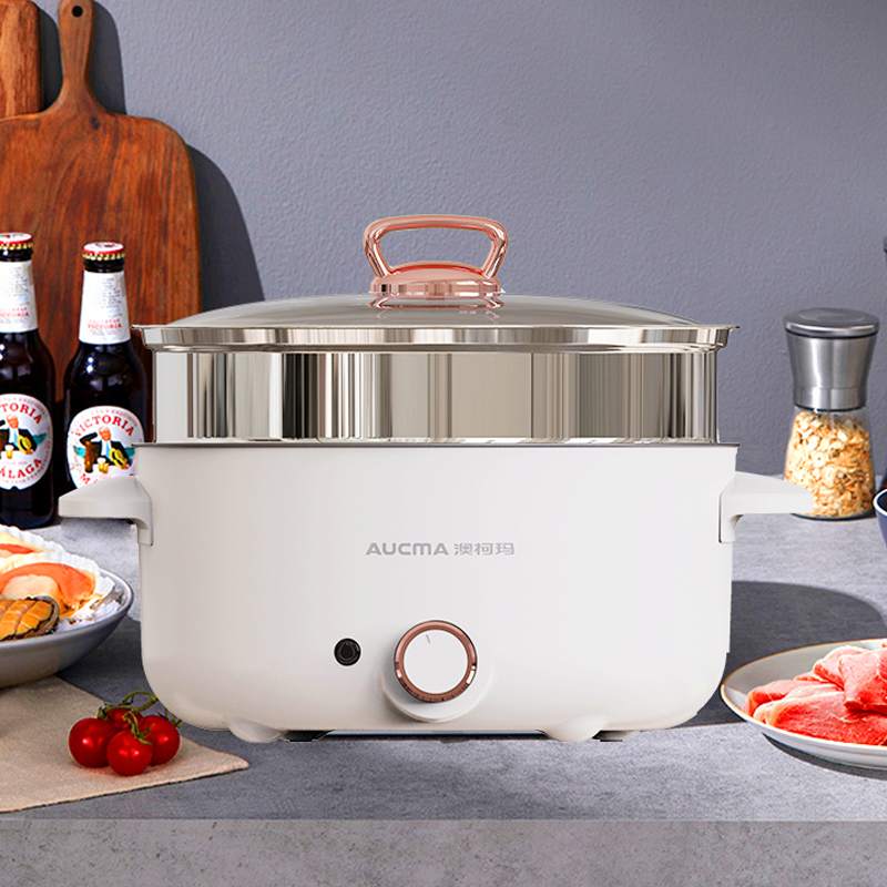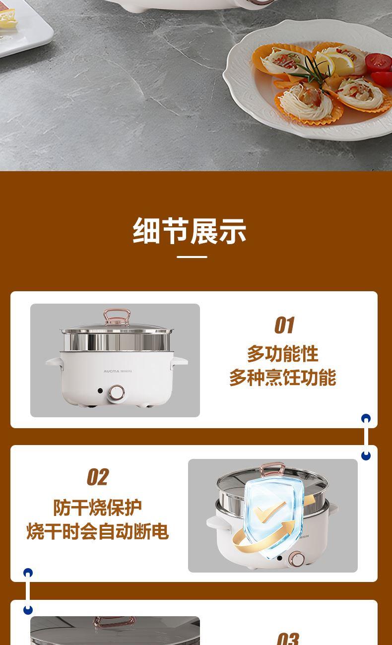 操控方式:旋钮式 额定功率:1000W 容量:3L 档位:2档 颜色:奶白色 内胆材质:特氟龙 一锅多用,产品蒸、煮、涮,轻食早餐,快手料理,美味同步 产品升级整圈发热管,效率高,加热更快 超温断电保护,控温多重防护 产品选用对人体健康安全食品级材料,轻油少烟,易清洗 产品采用防烫把手,操作快捷,双层锅体,隔热更耐用