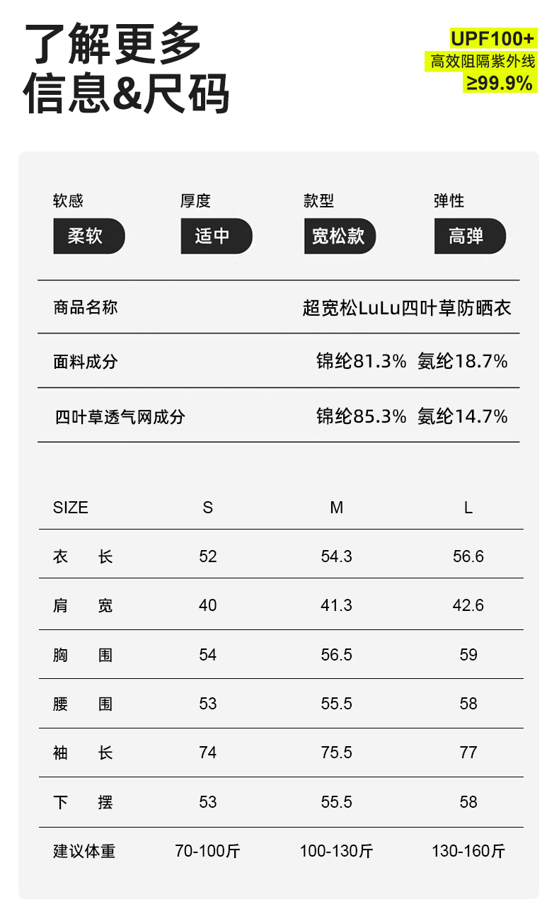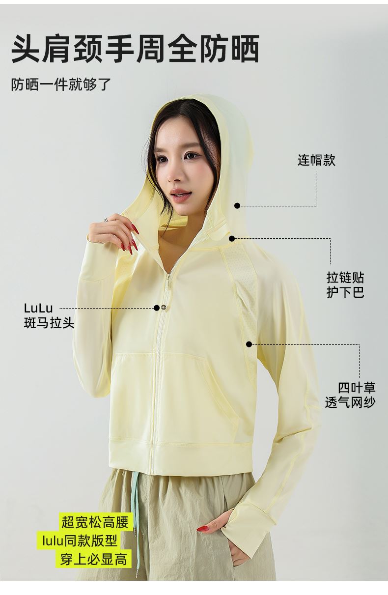 产品卖点: 1.超宽松高腰lulu同款版型,穿上它必显高 2.采用三针五线平整大线条设计工艺 3.采用UPF+双经平锦纶冰感面料,不勾丝,不起球,机洗不变形 4.全系配有lulu同款拉链斑马拉绳+太阳圆拉头 5.四叶草菱形透气网既美观,又透气,快速散热不闷热 产品面料:主料:25%氨纶 75%锦纶产品尺寸: S .M.L