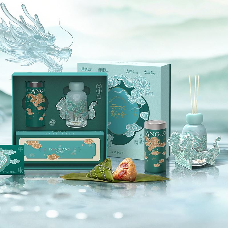 配置 · ① 无火香氛液×1瓶(200ml-乌木沉香) ② 龙舟纸框景×4片 ③ 香液扩香棒×1套 ④ MiNi保温杯×1只(SUS316内胆丨200ml) ⑤ 发芽糙米粽×2只(100g/只) ⑥ 端午礼卡×1份 ⑦ 云水龙吟礼盒×1套(含袋) 尺寸 · 290×290×95mm