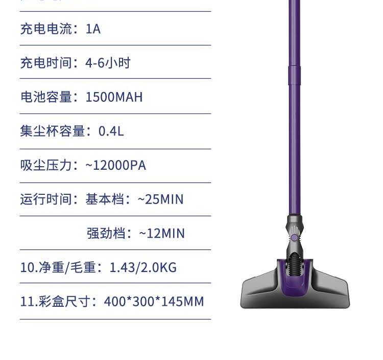 1.额定电压:14.8V 2.额定功率:120W 3.充电电压:5V 4.充电电流:1A 5.充电时间:4-6小时 6.电池容量: 1500mAh 7.集尘杯容量: 0.4L 8.吸尘压力:满电(强劲档)约12000Pa 9.运行时间:基本档:约25min/强劲档:约12min 10.净重/毛重:1.43/2.0kg 彩盒尺寸:390*284*128mm 邮购箱尺寸:400*300*145mm 1.12000帕强劲吸力 2.5重尘气过滤 3.两档吸力可调 4.轻量级主机清洁省力