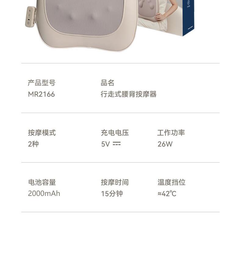 型号 MR2166 69码 6975660321663 产地 福建厦门 净重 1855g 毛重 2000g 包装尺寸 39X10.4X41.8cm 大箱尺寸 48.4x41.5x45.4cm 续航:约7个循环 默认工作时间:15min(自动关闭) 充电时间:3.5小时±0.5小时 充电电压:5V/2A 额定功率:10w 充电接口:Type-C 电池容量:2000毫安 执行标准:GB4706.1-2005/GB4706.10-2008 配件:主机*1,充电线*1,说明书*1