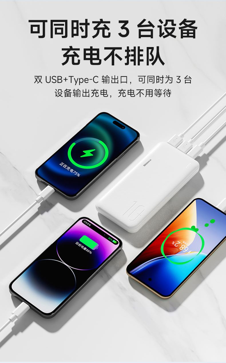 1、可同时充3台设备、充电不排队、双USB+Type-C输出口,可同时为3台设备输出充电,充电不用等待