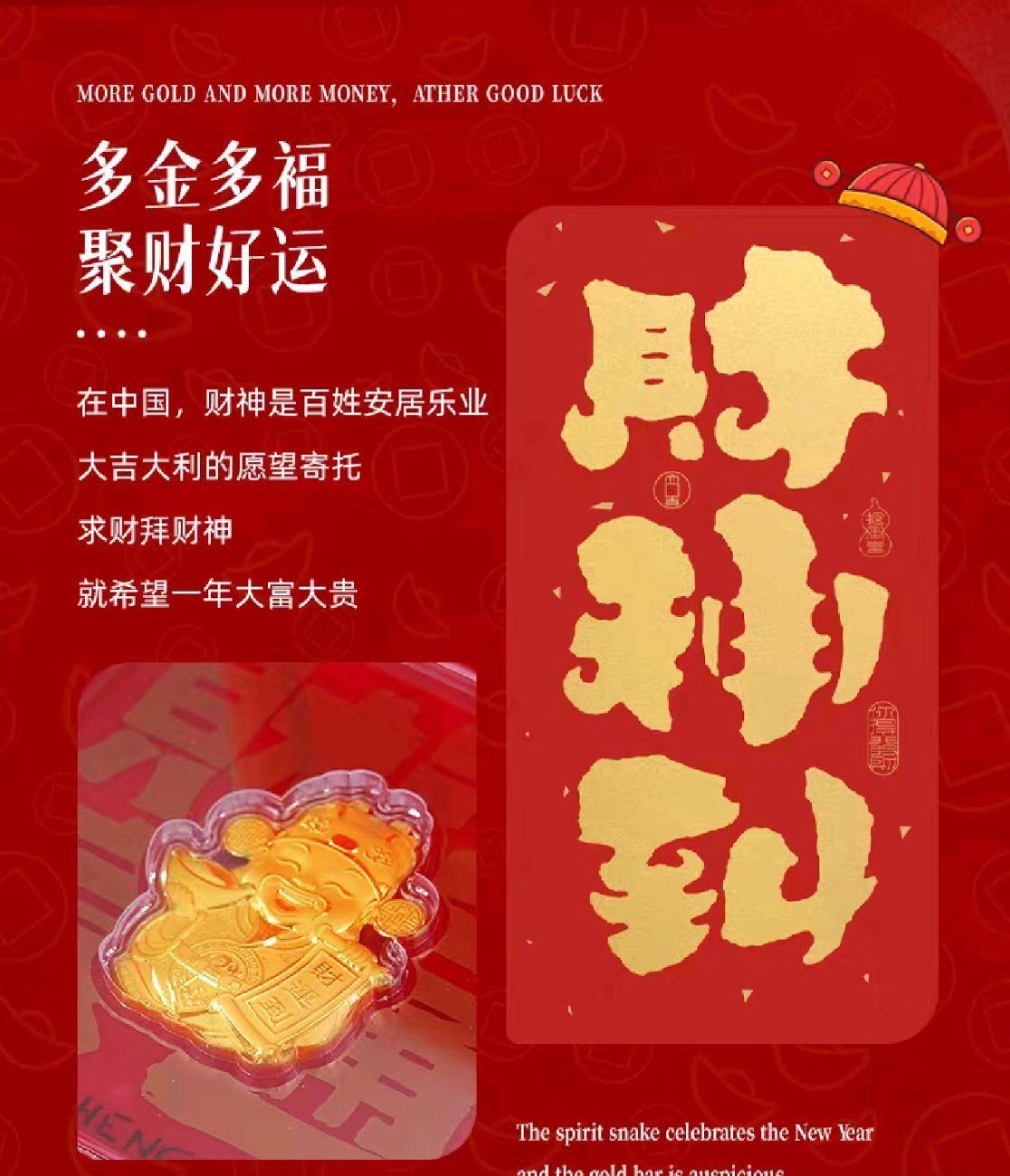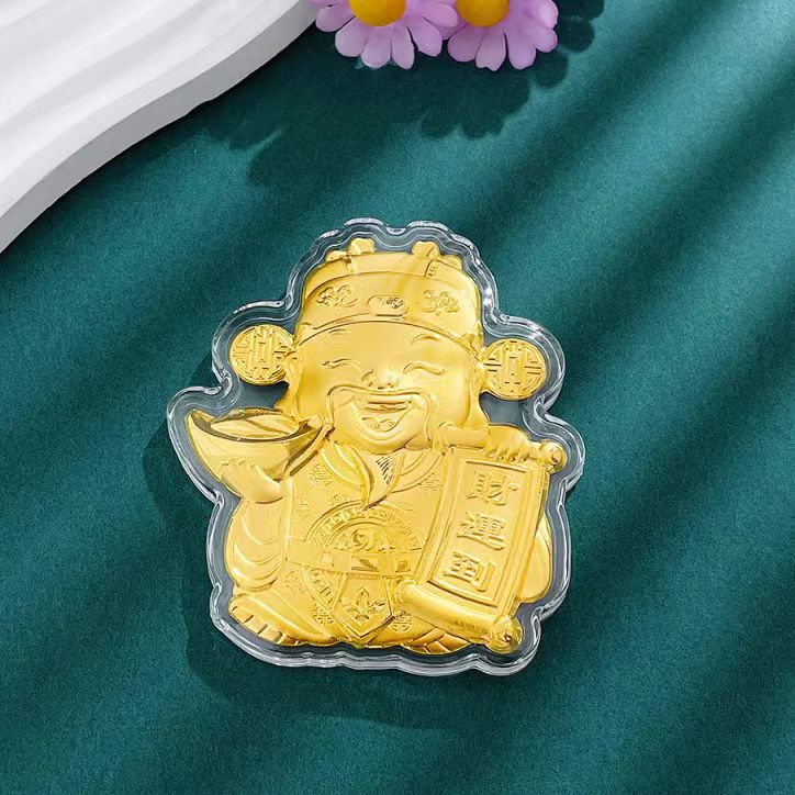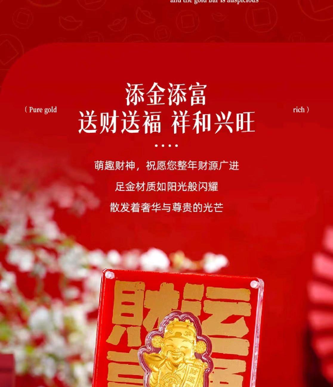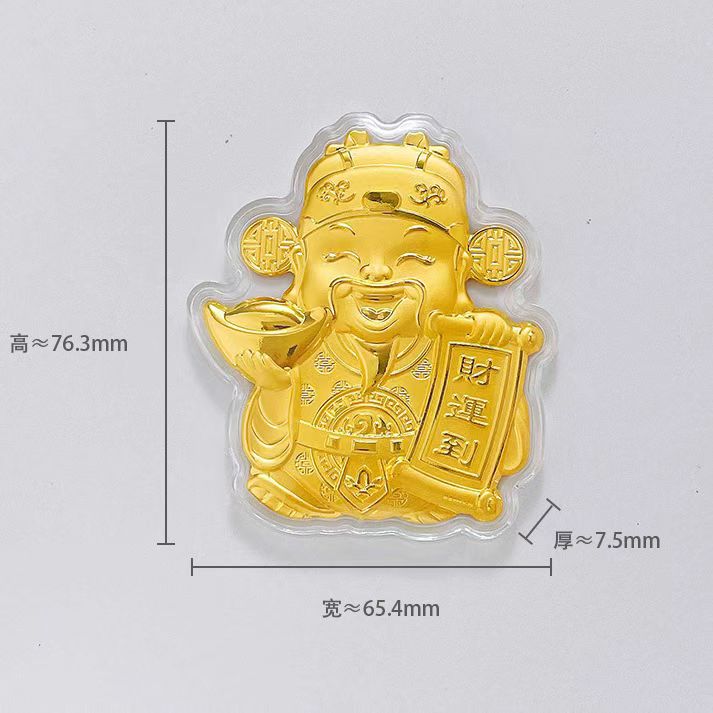 产品配置: 克重:999足金 0.5g ①财神摆件×1个 ②检测证书×1份 ③精致礼盒×1个 材质:黄金 添金添富 送财送褔 祥和兴旺 萌趣财神,祝愿您整年财源广进 足金材质如阳光般闪耀散发着奢华与尊贵的光芒 融合了现代的审美和需求,黄金般的富贵。 足金材质加上油压工艺 黄金色泽亮丽,层次感满满 用来送礼亦是一份非常有意义的礼物