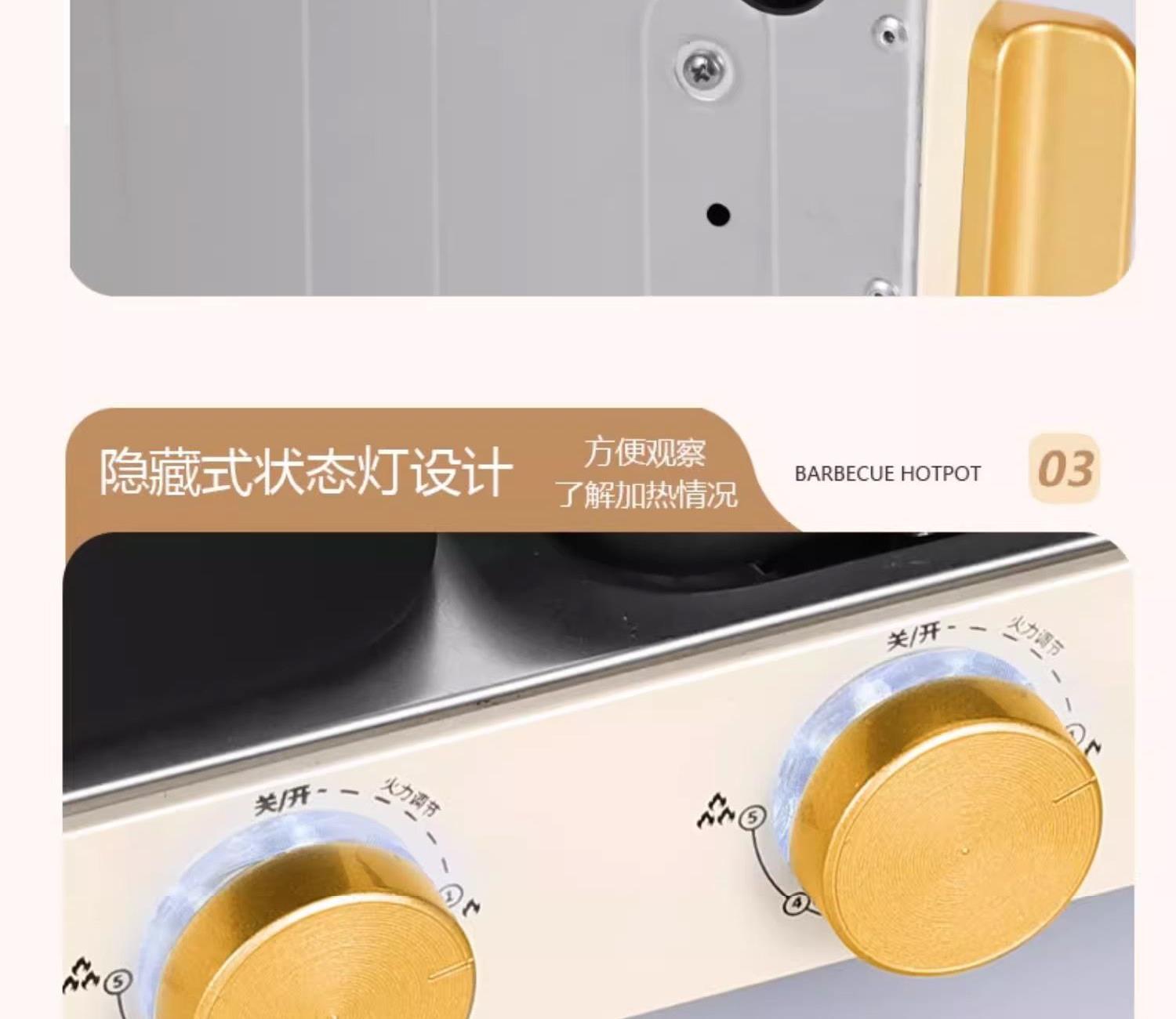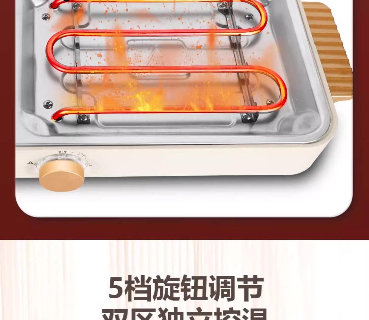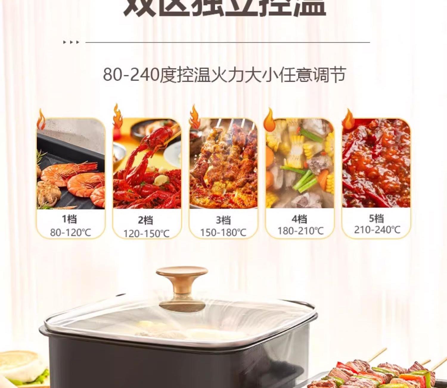 5档旋钮调节, 双区独立控温,80-240度控温火力大小任意调节