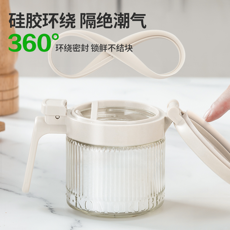 美东 一按即开密封翻盖调料盒 内外兼修好产品好结构 PP盖子+加厚硅胶圈+定量勺子+钠钙玻璃 每日2g,定量精致生活,防滑手握处理 超强密封无惧回南天,调料不受潮不结块强密封 加厚硅胶圈。防护瓶内的调料
