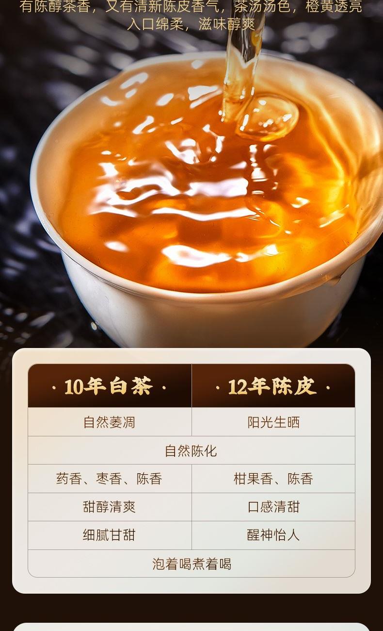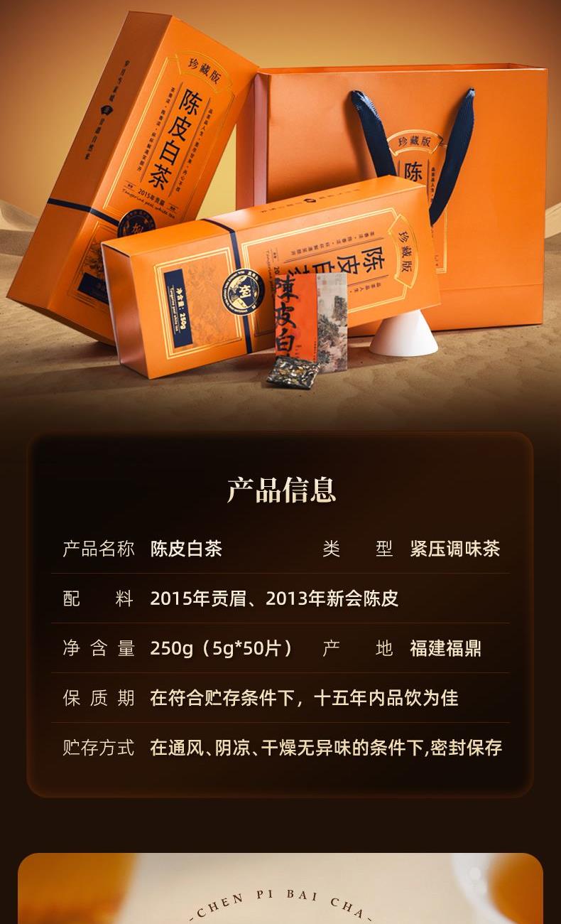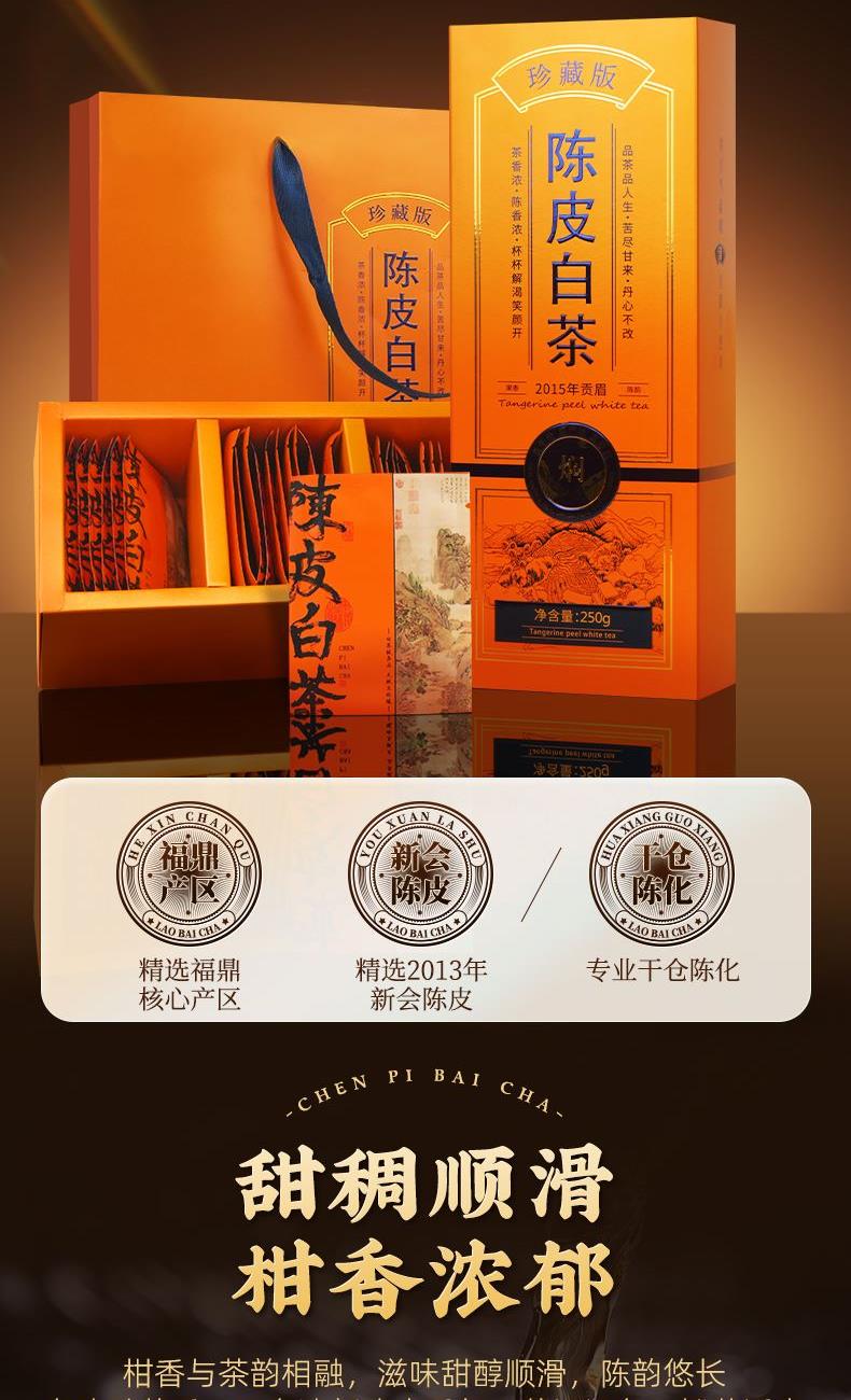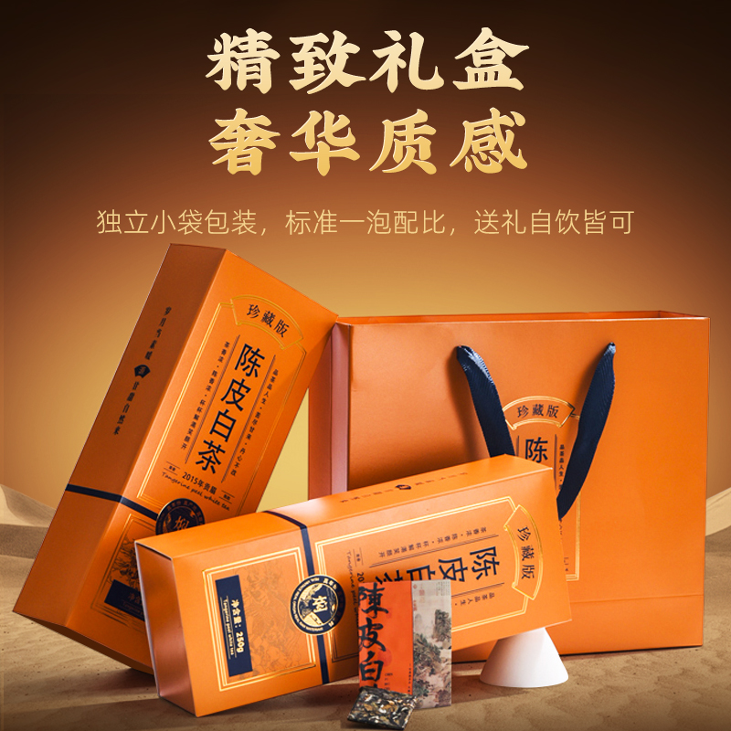 类别:核心产区福鼎陈皮白茶 规格:250g 包装:内置独立包装,礼盒装配手提袋 产品介绍: 1、选自 “美丽茶乡” 福建福鼎,地理标志产品 2、2015 年贡眉老白茶、2013 年陈皮为原料,2015 年地理标志产品茶种 3、独特干燥工艺,茶与陈皮互吸精华,内含物质丰富,耐泡度高 4、茶汤滋味醇和饱满,细腻甜爽,兼具白茶醇厚与陈皮香气