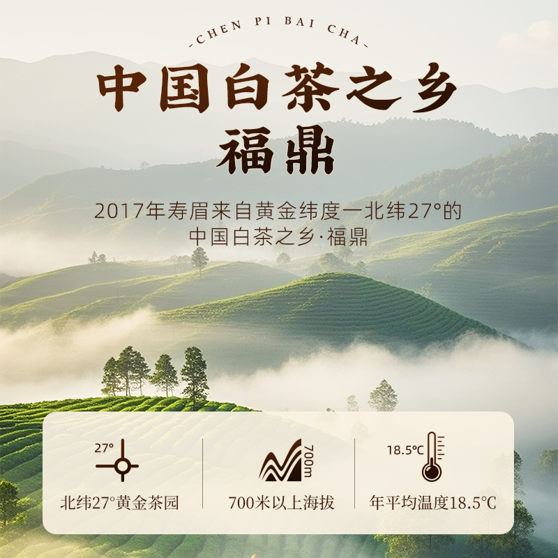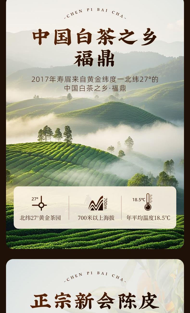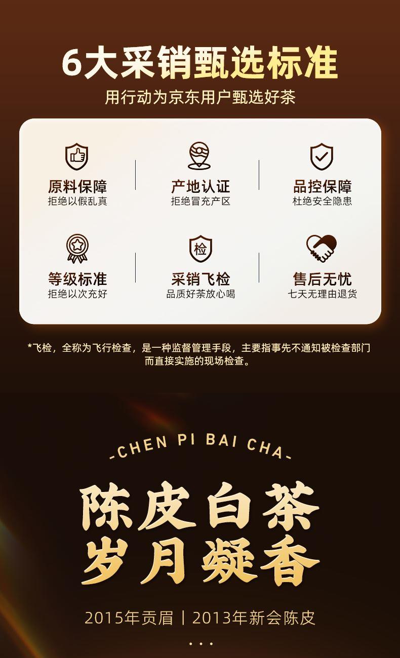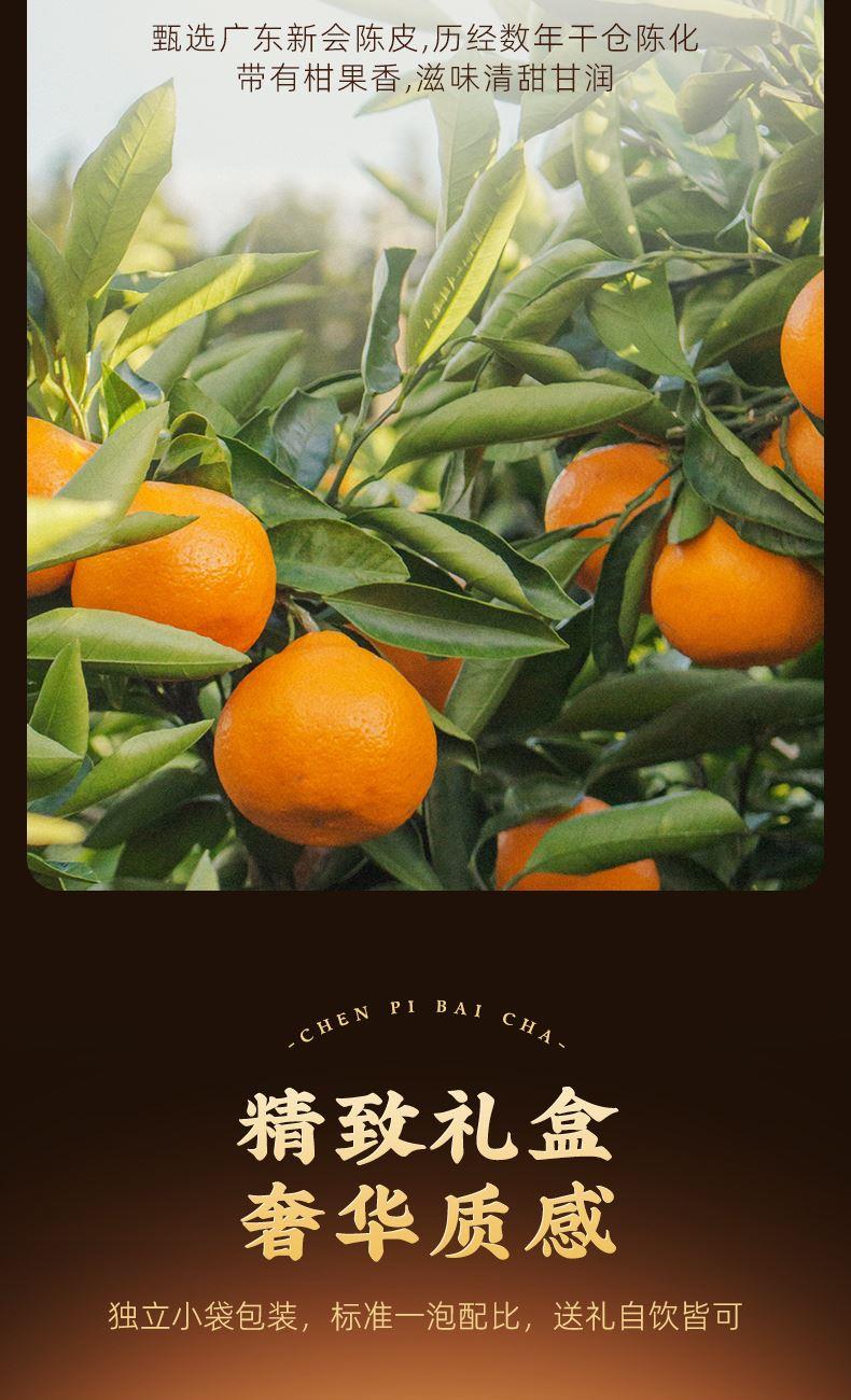 类别:核心产区福鼎陈皮白茶 规格:250g 包装:内置独立包装,礼盒装配手提袋 产品介绍: 1、选自 “美丽茶乡” 福建福鼎,地理标志产品 2、2015 年贡眉老白茶、2013 年陈皮为原料,2015 年地理标志产品茶种 3、独特干燥工艺,茶与陈皮互吸精华,内含物质丰富,耐泡度高 4、茶汤滋味醇和饱满,细腻甜爽,兼具白茶醇厚与陈皮香气