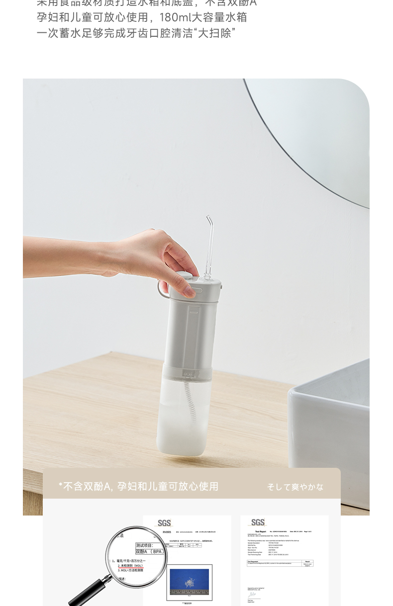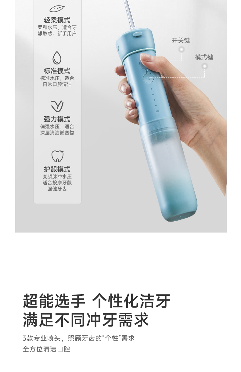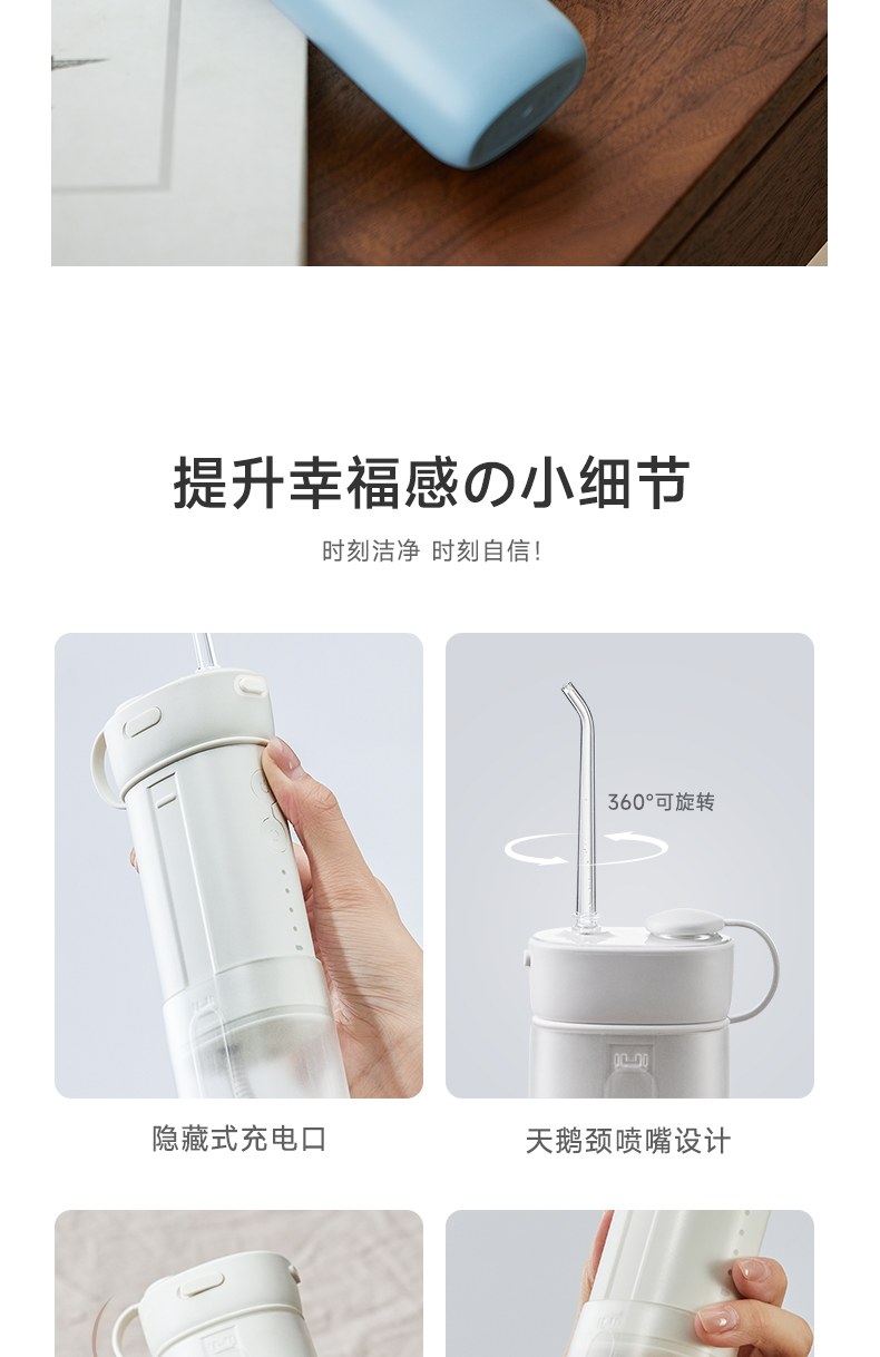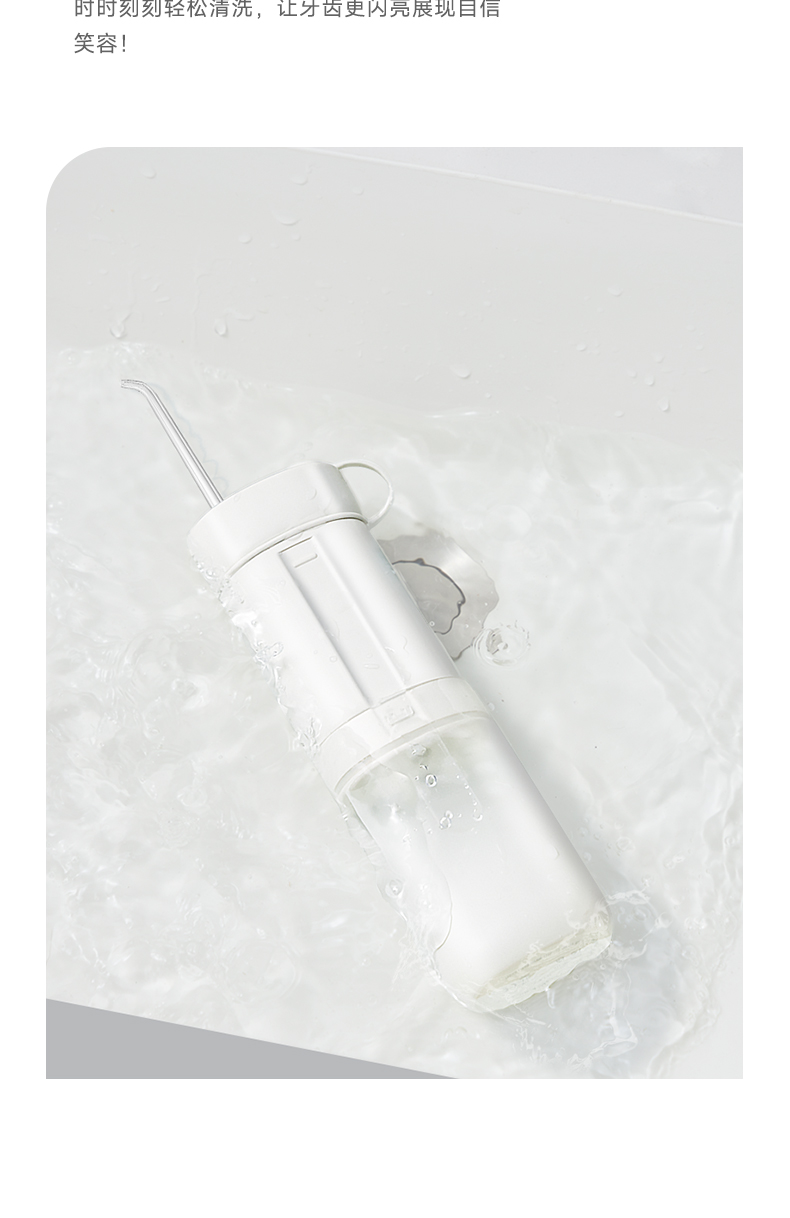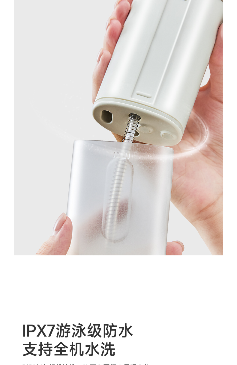 产品型号:CBH-J020 额定电压:5V =-= 额定功率: 12W 防水等级:IPX7 额定输入:5V =-=1A 伸缩式设计,商务出差、旅游、户外活动等场景轻松搞定 Ipx7防水,随心所“浴”清洗可以毫不费力 专业水脉冲,清洗更洁净 4种冲洗模式,应对不同强度需求