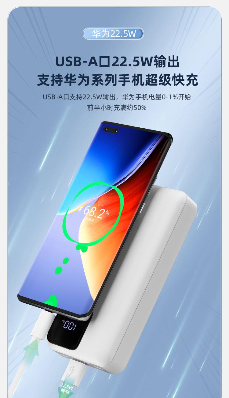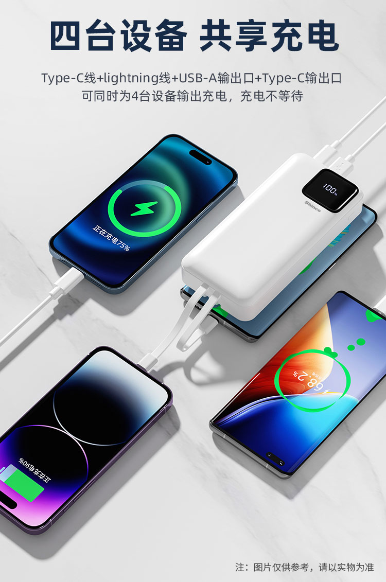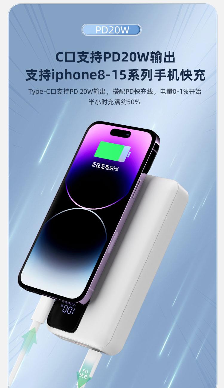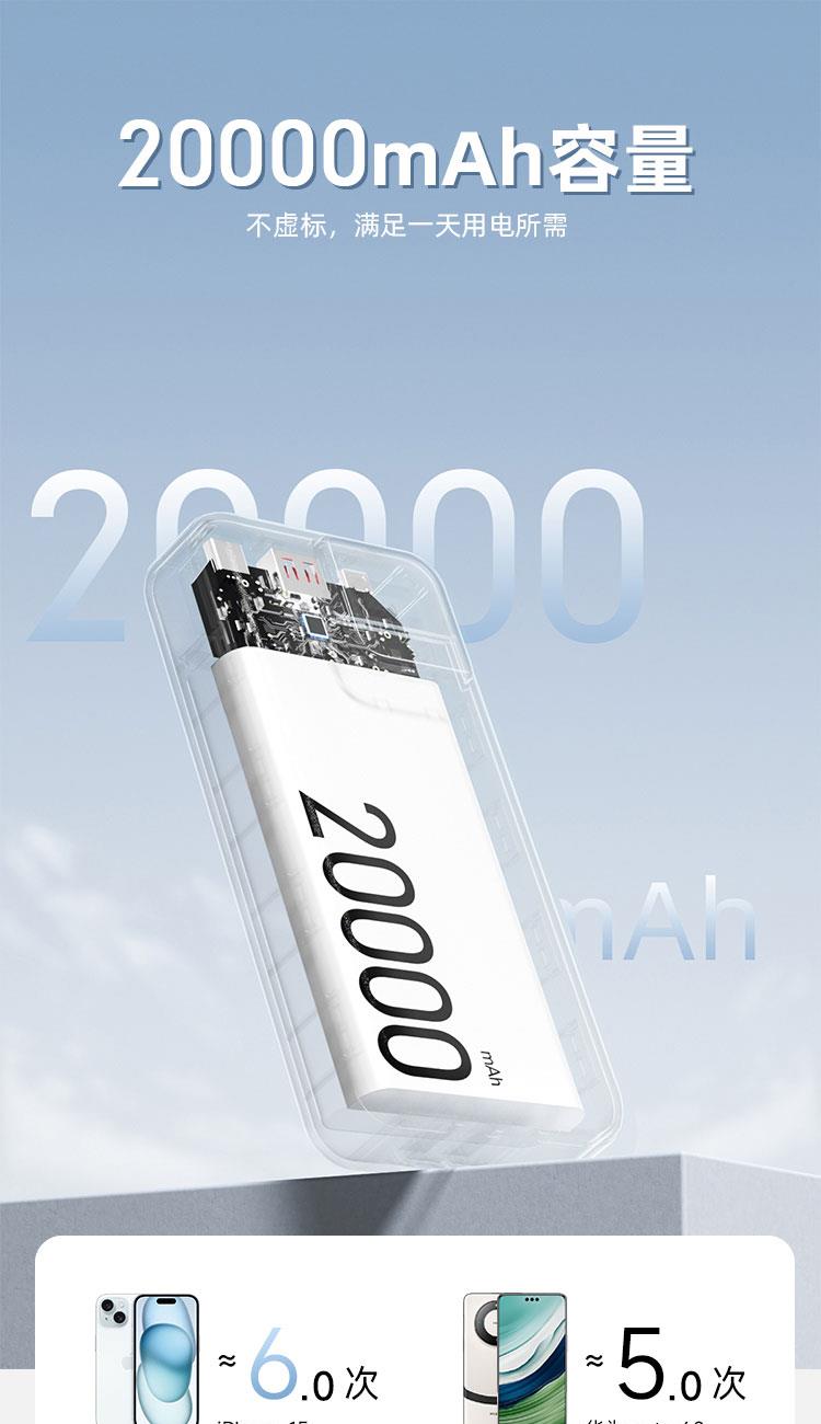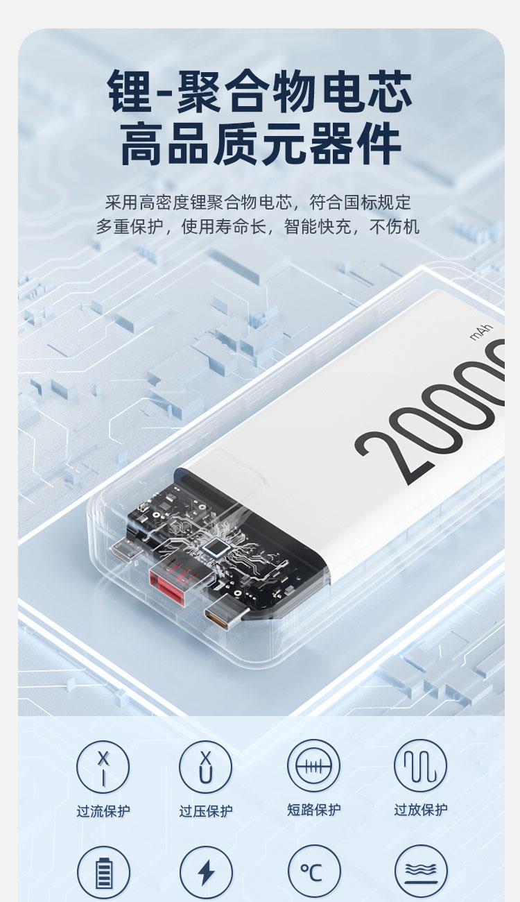 电芯容量:20000mAh(74Wh) 额定容量:11000mAh 输入(Type-C):5V-3A 9V-2A 12V-1.5A 输入(Micro-USB):5V-2A 9V-2A 12V -1.5A 输出(USB-A):10V- 2.25A 9V - 2A 12V- 1.5A 5V-3A 电芯类型:锂-聚合物电芯 1:随身自带线 、充电很方便 自带苹果、Type-C双快充线 2:Type-C线+lightning线+USB-A+Type-C输出口 可同时为4台设备输出充电,充电不等待 3:大容量 20000mAh 、持久续航 4:Type-C口支持PD 20W输出,搭配PD快充线,USB-A口支持22.5W输出 5:支持18W双向快充,蓄电时间大幅缩减
