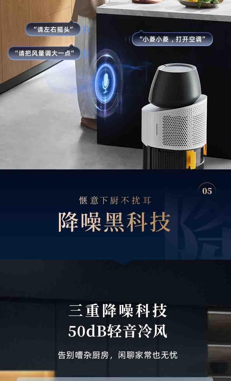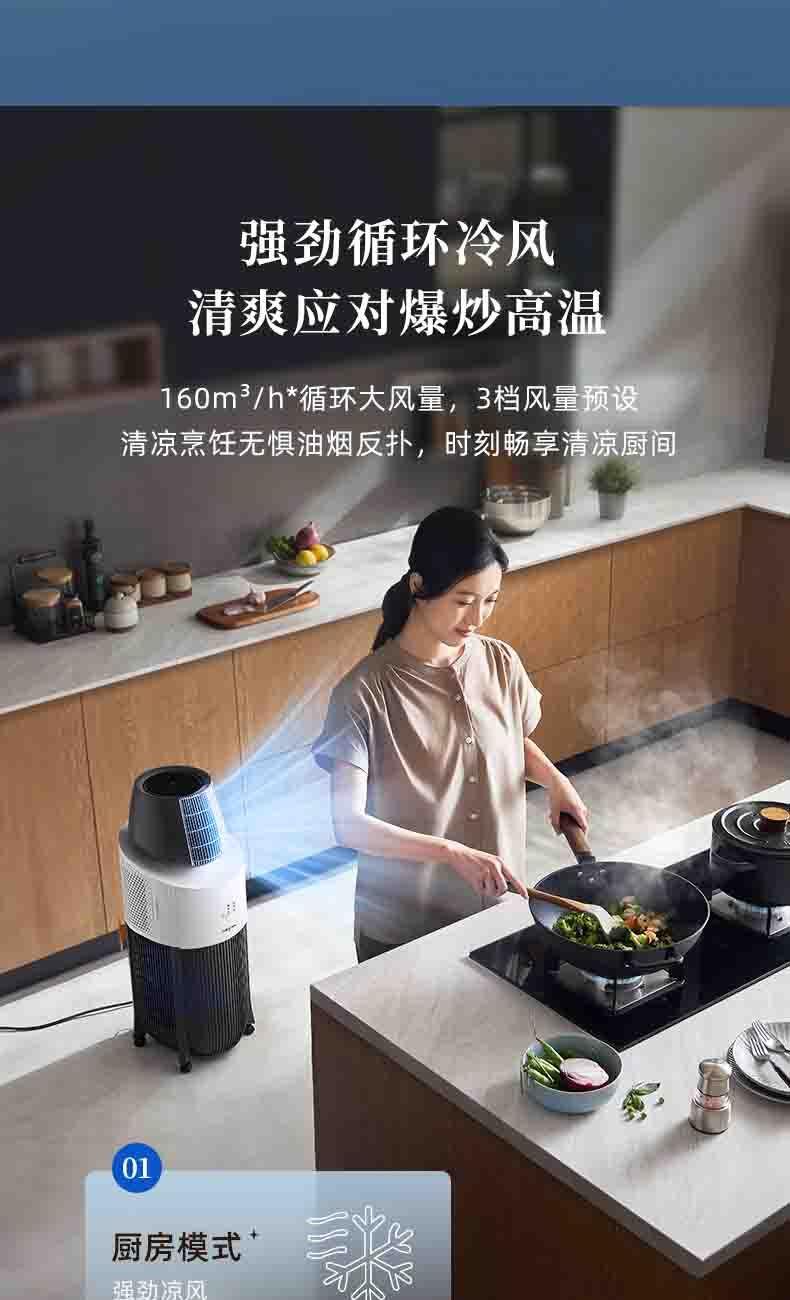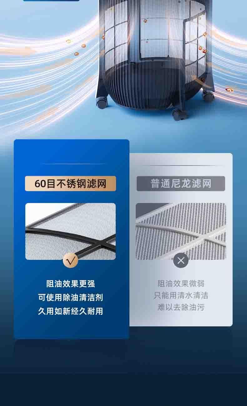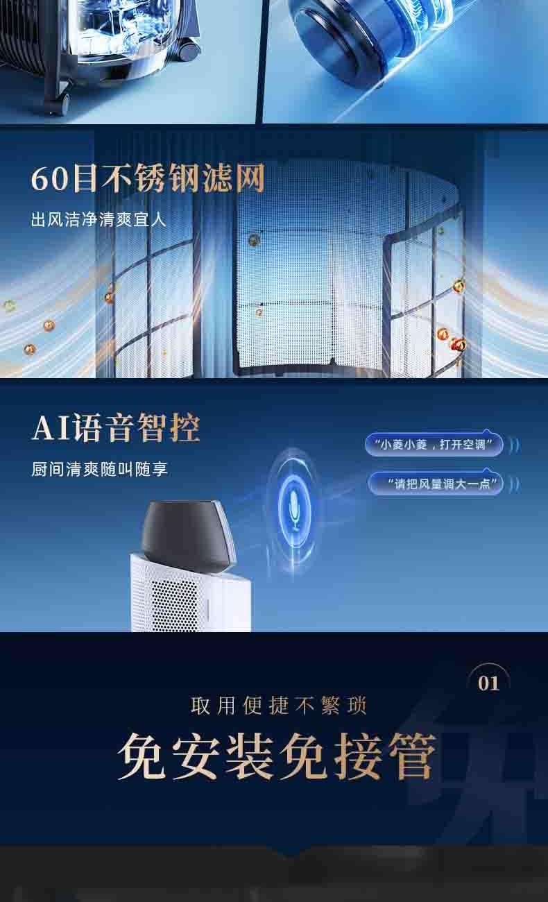 一体机身免安装,加水插电即享清凉 AI语音+智能触控,厨间清爽随叫随享 上下左右广角送风,3档风量全 方位凉爽 60目不锈钢滤网,高效过滤油烟/灰尘/毛发