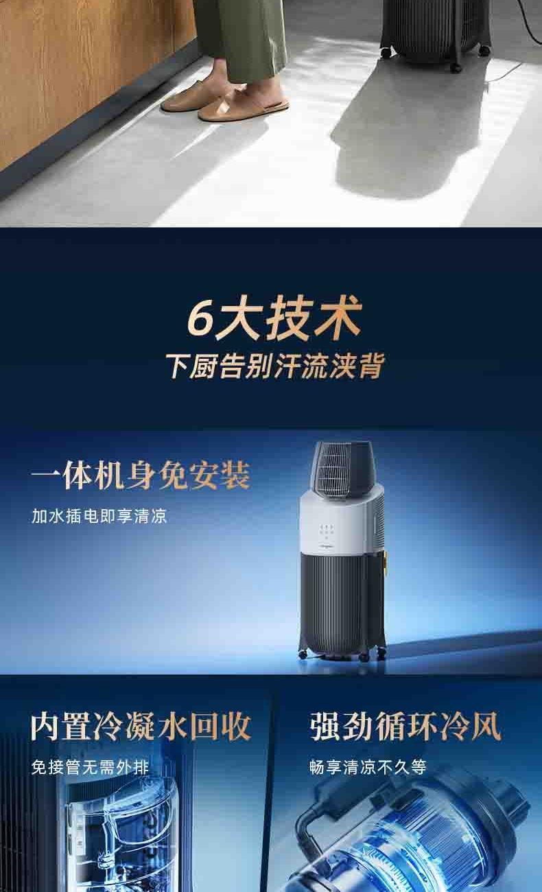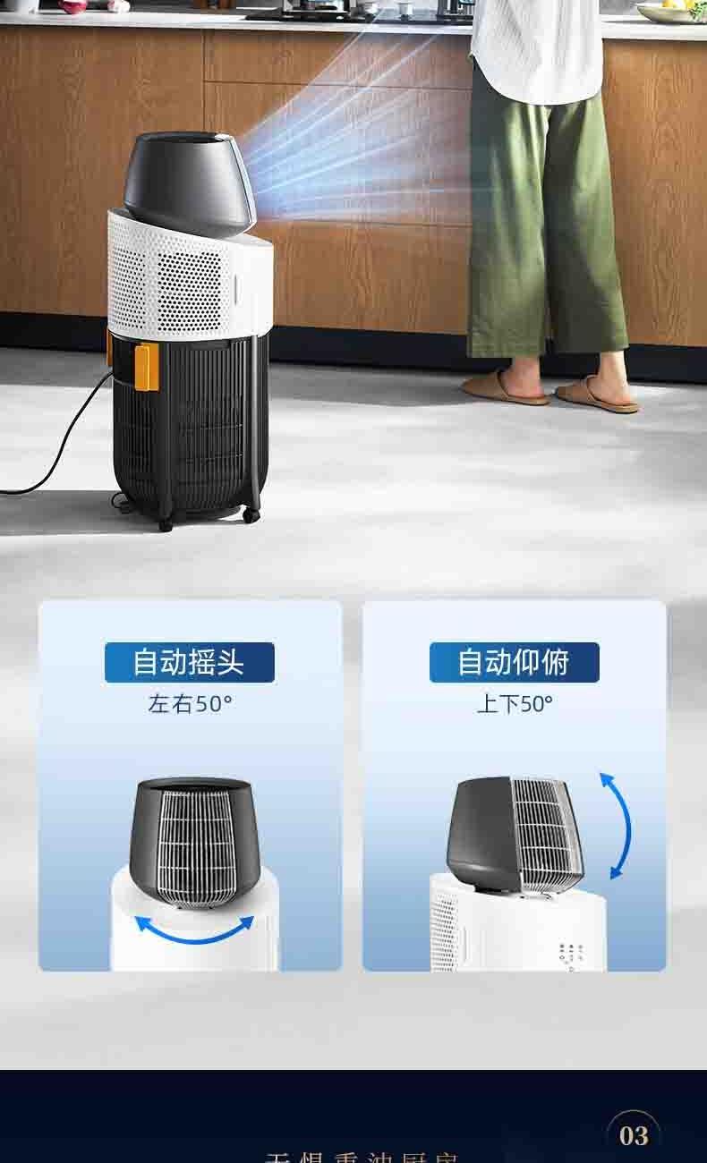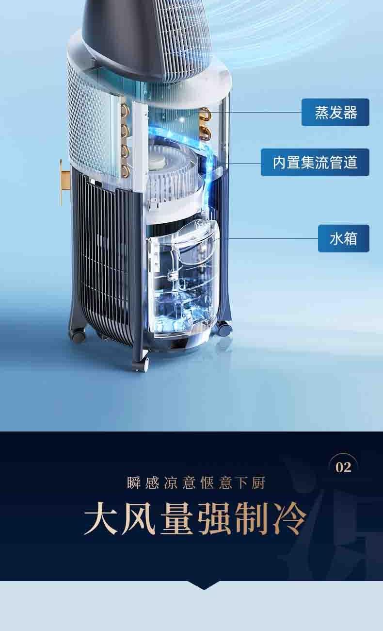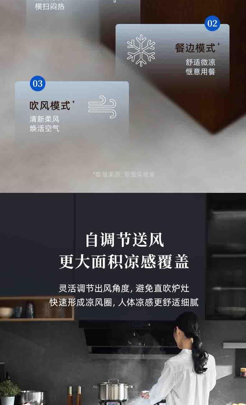 一体机身免安装,加水插电即享清凉 AI语音+智能触控,厨间清爽随叫随享 上下左右广角送风,3档风量全 方位凉爽 60目不锈钢滤网,高效过滤油烟/灰尘/毛发