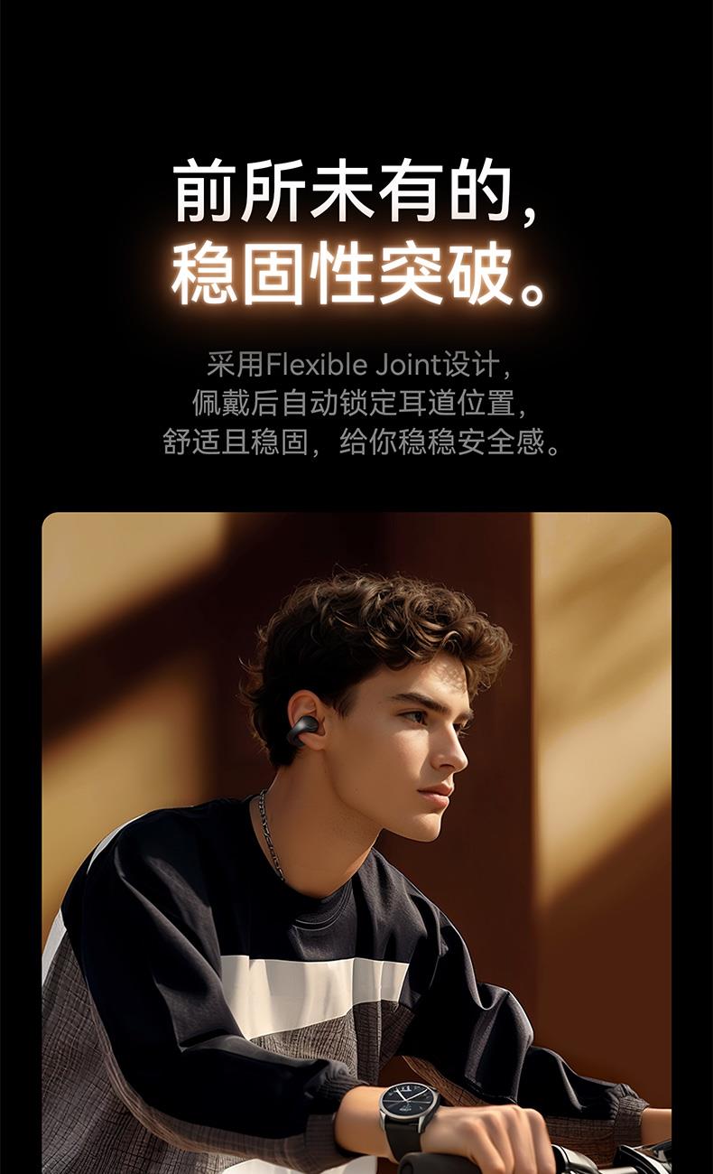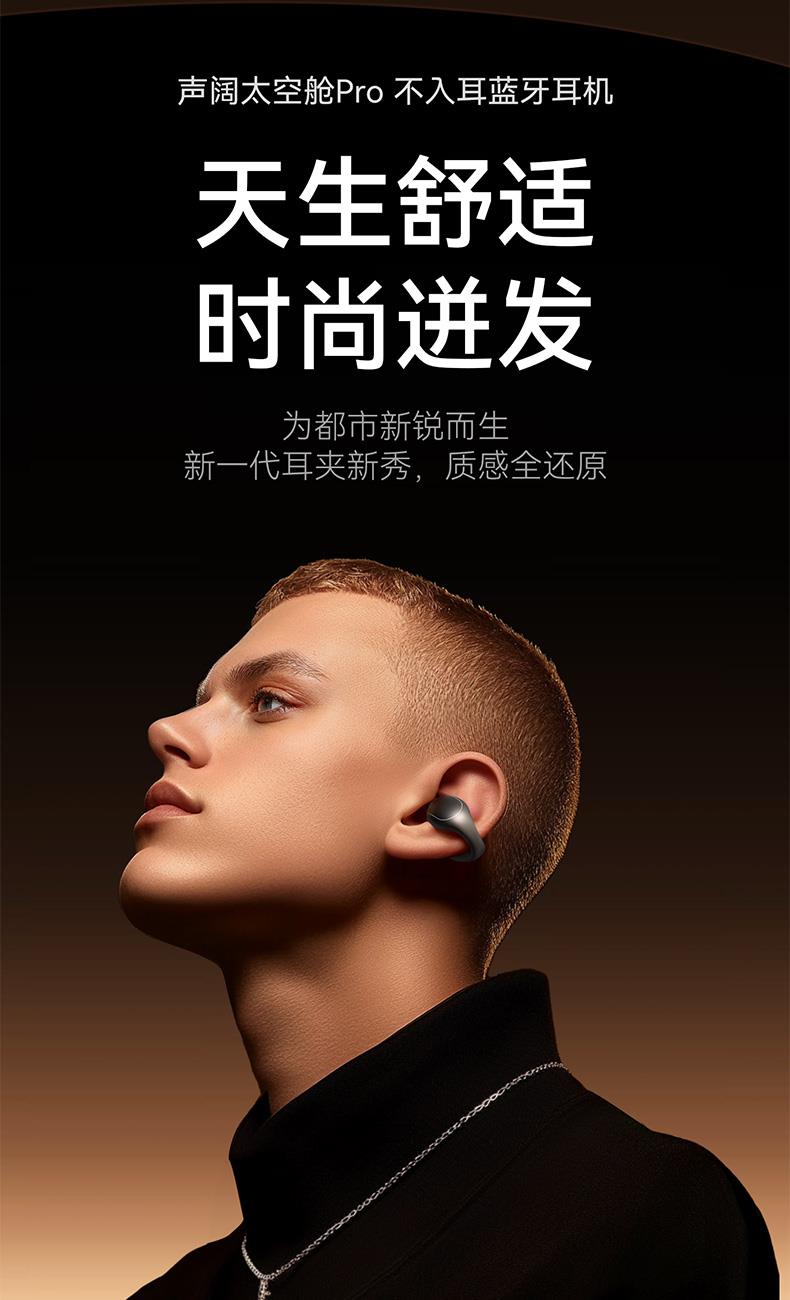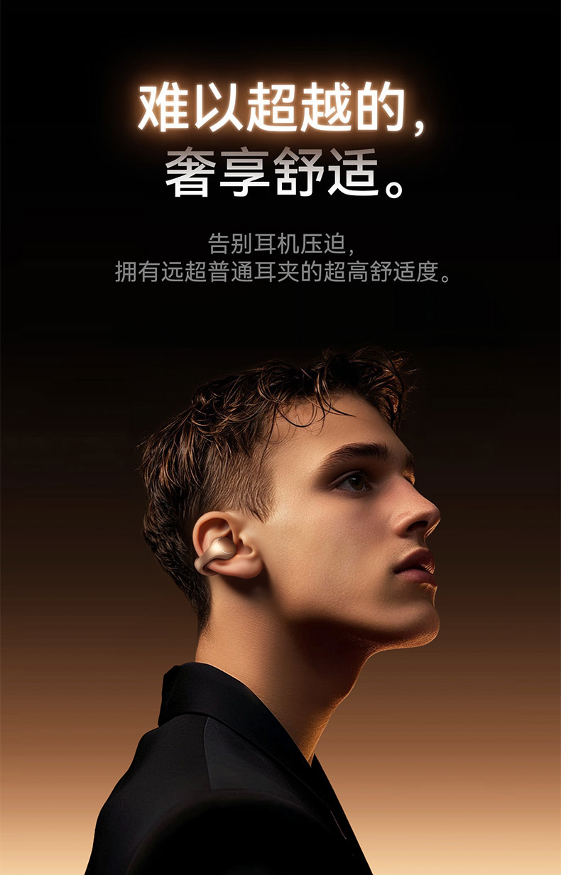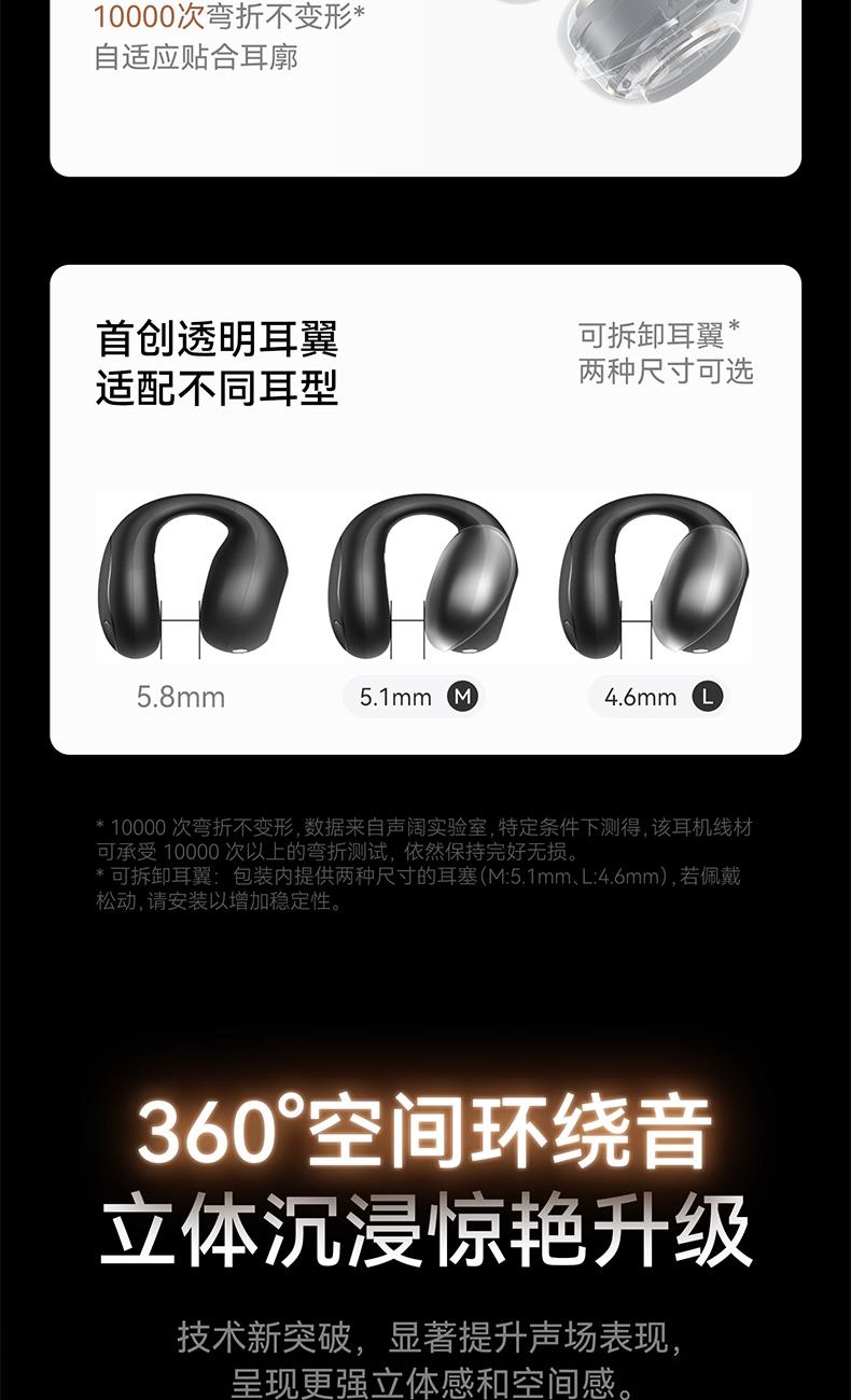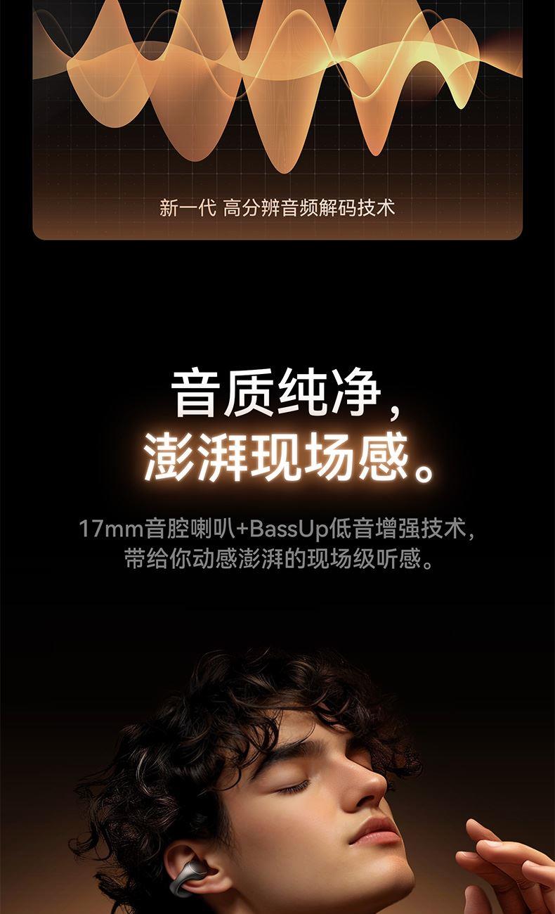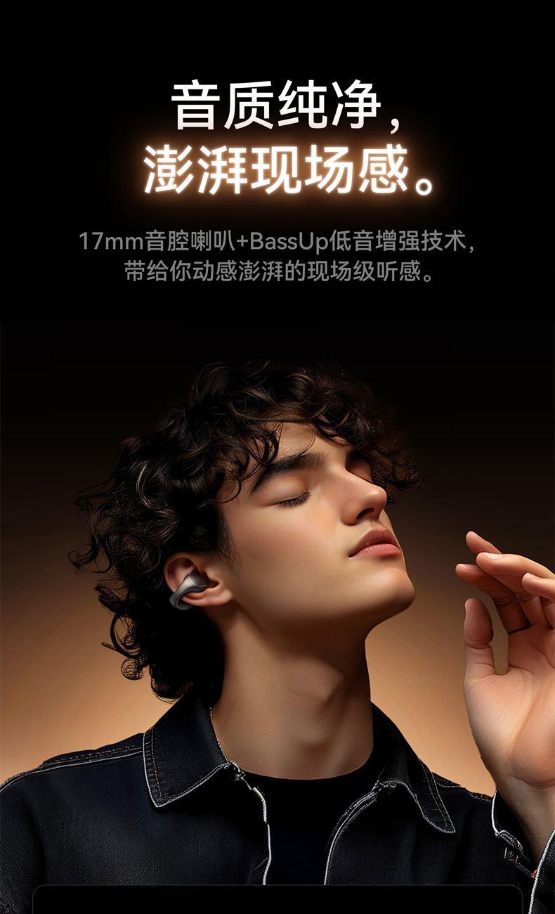 1、耳夹式不入耳,不闷堵舒适聆听 2、 零压感设计,全天候舒适佩戴 3、 记忆钛丝软胶,自适应贴合耳廓 4、 首创透明耳翼,适配不同耳型 5、 17mm跑道型喇叭,音质立体澎湃 6、 总续航21小时,日夜随心听