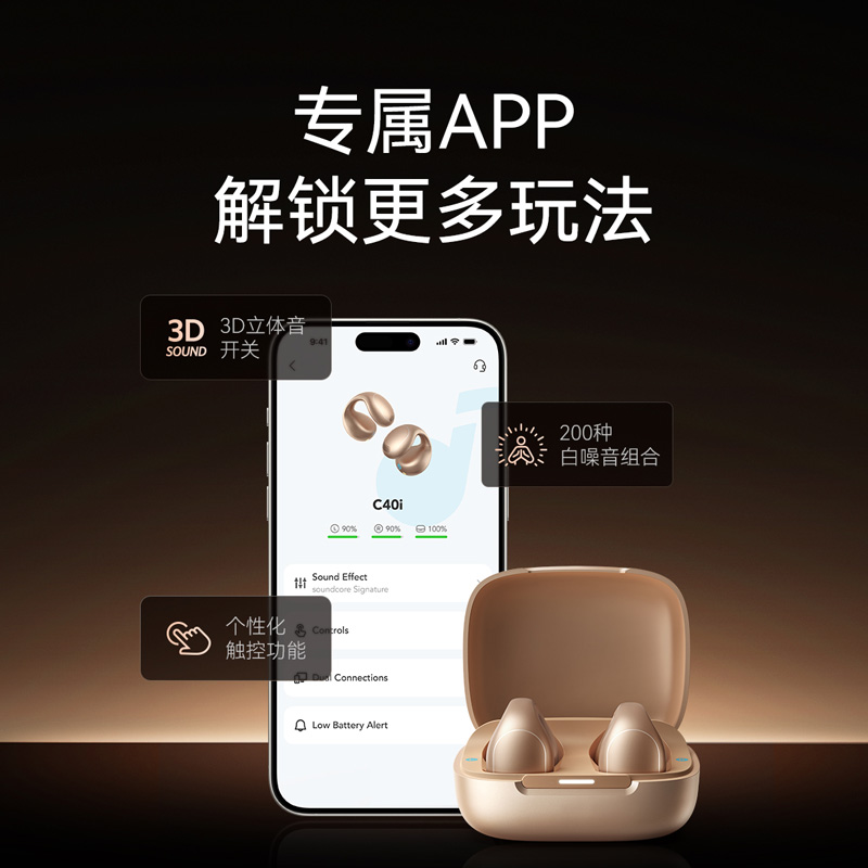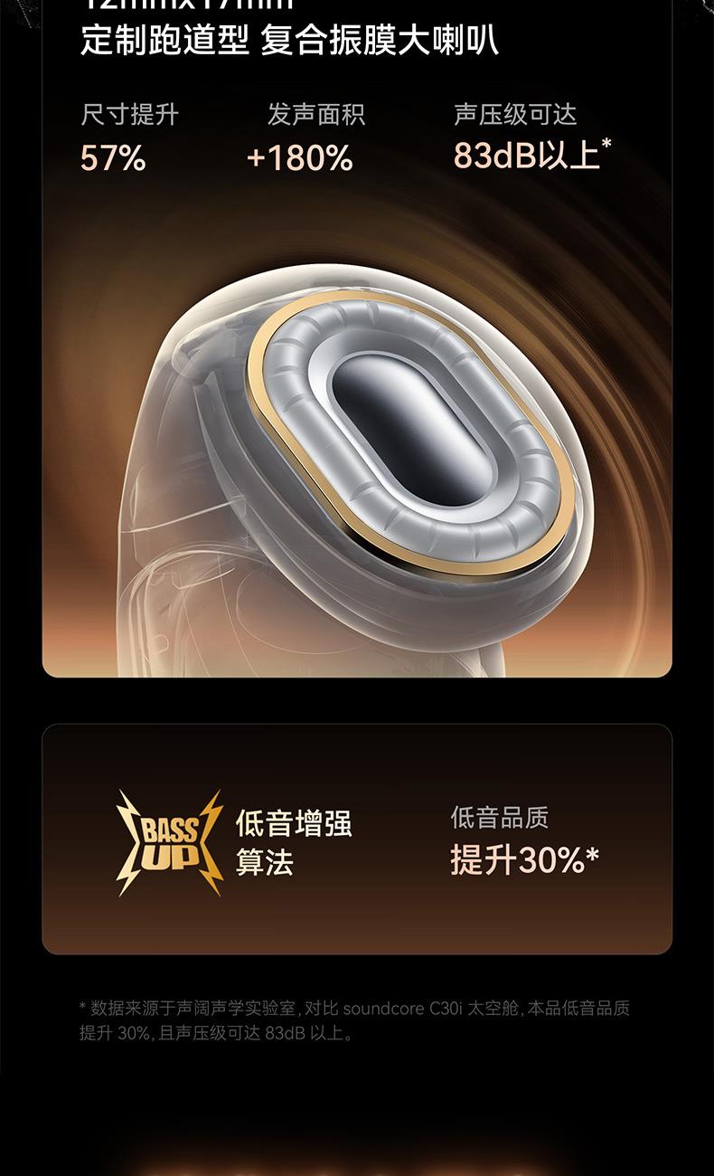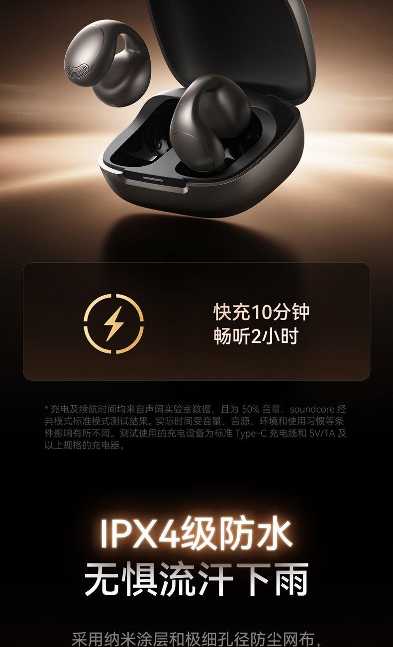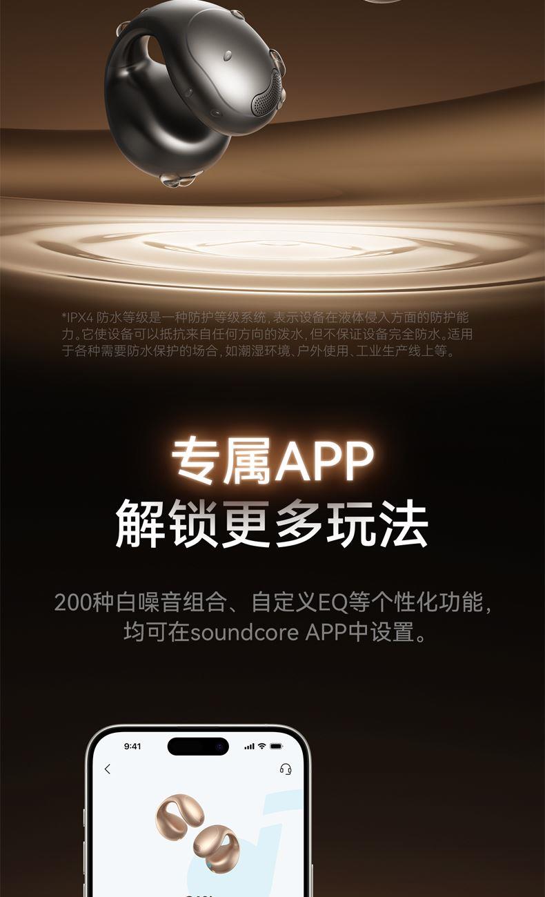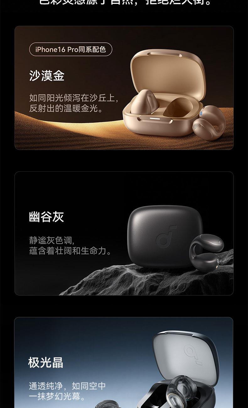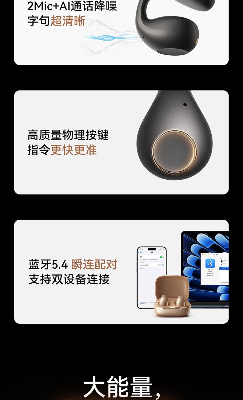 1、耳夹式不入耳,不闷堵舒适聆听 2、 零压感设计,全天候舒适佩戴 3、 记忆钛丝软胶,自适应贴合耳廓 4、 首创透明耳翼,适配不同耳型 5、 17mm跑道型喇叭,音质立体澎湃 6、 总续航21小时,日夜随心听