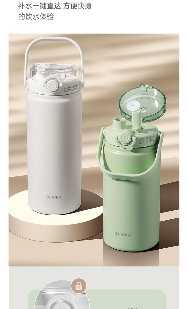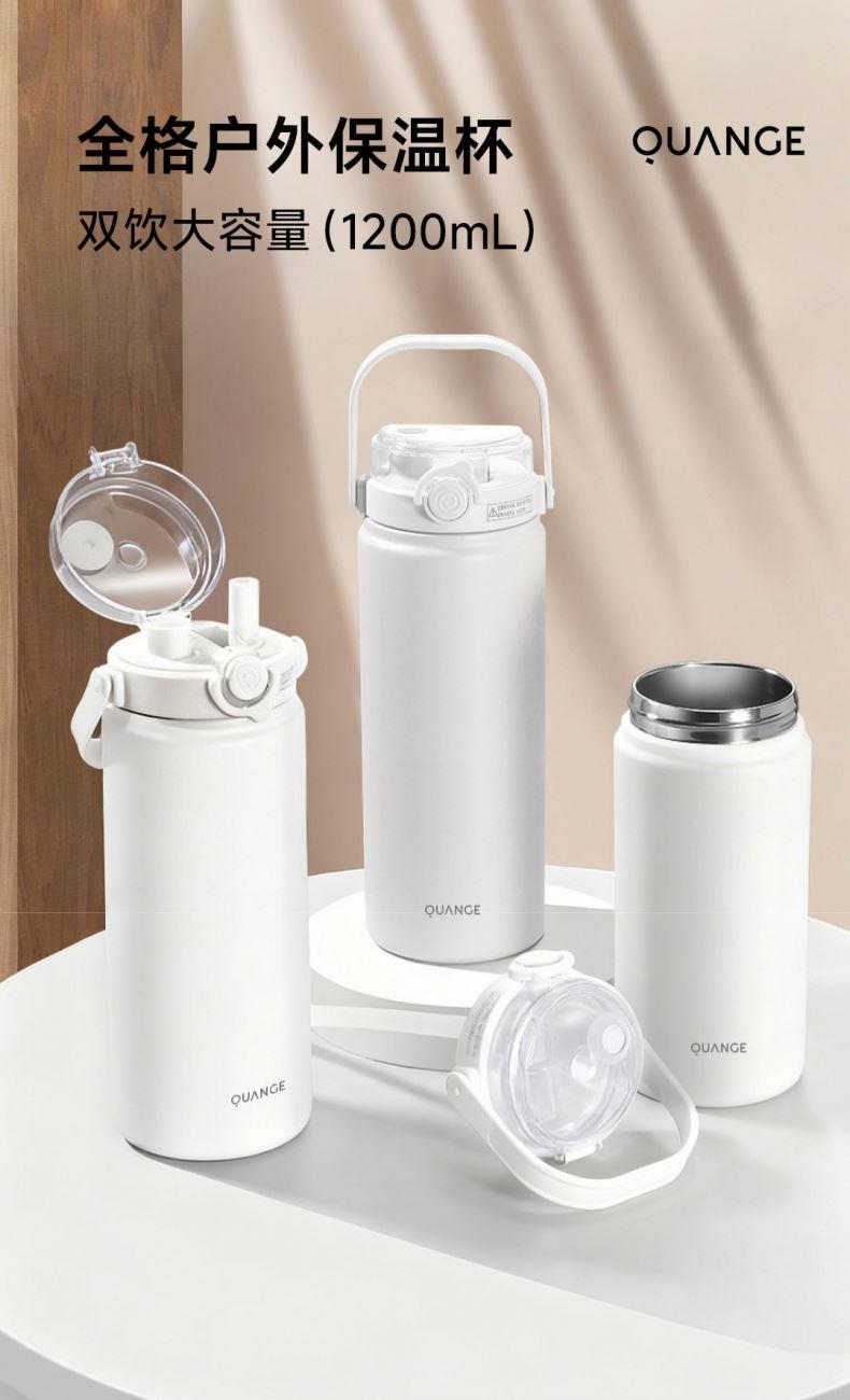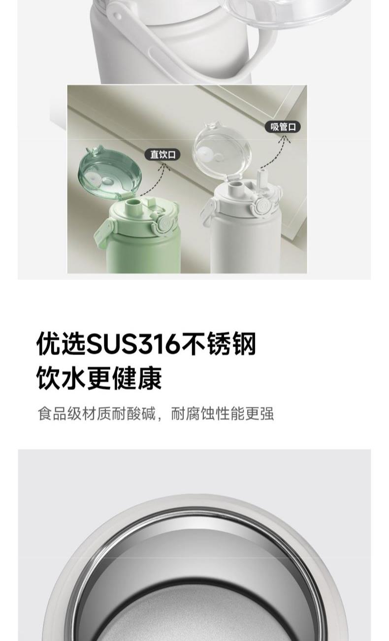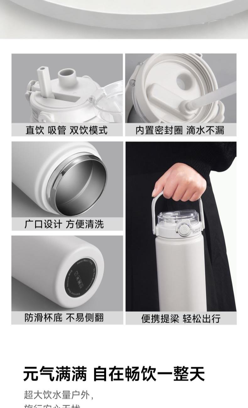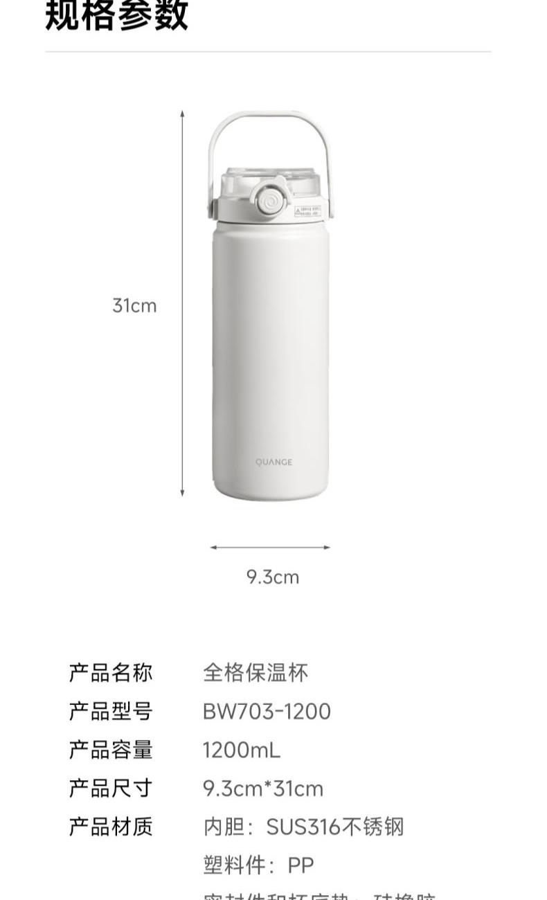 颜色:白色 容量:1200ml 材质:内胆底SUS316,杯盖/吸管:食品级PP密封件:硅橡胶 产品尺寸:φ10.2*26.5cm 包装尺寸:27*11.5*10.7cm 1、大容量1200ml,一键开盖,双饮模式,便携提梁 2、内置茶滤,茶水分离