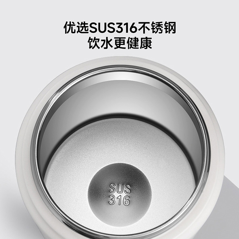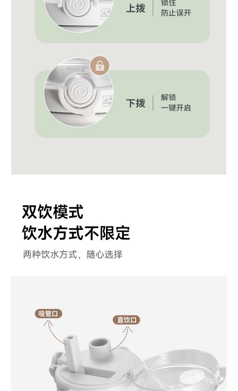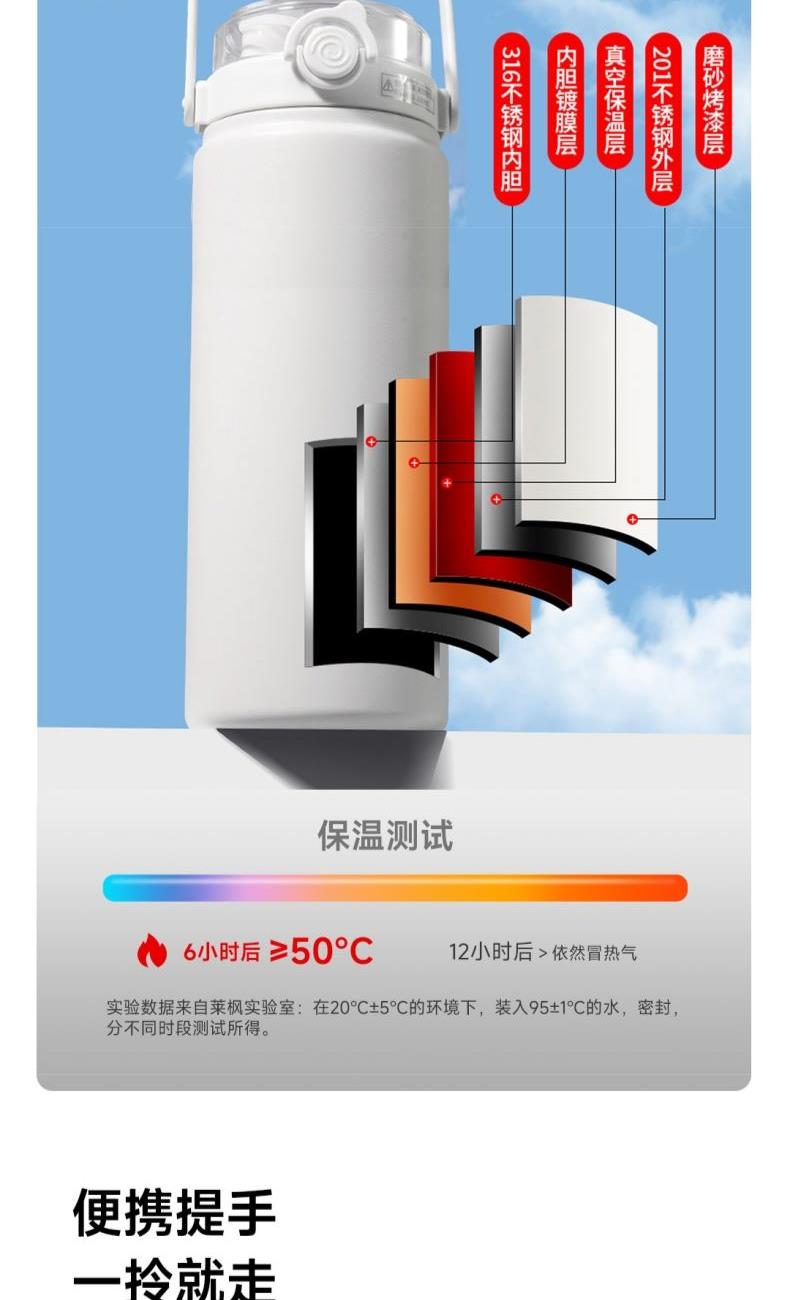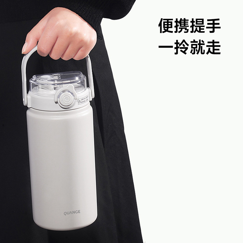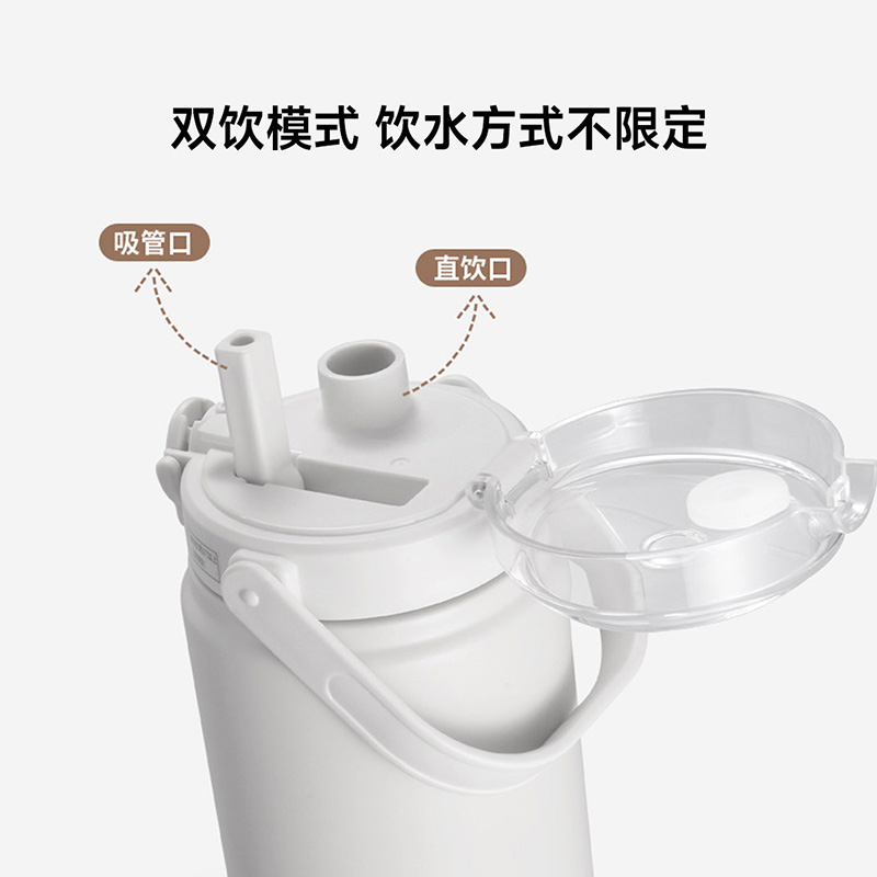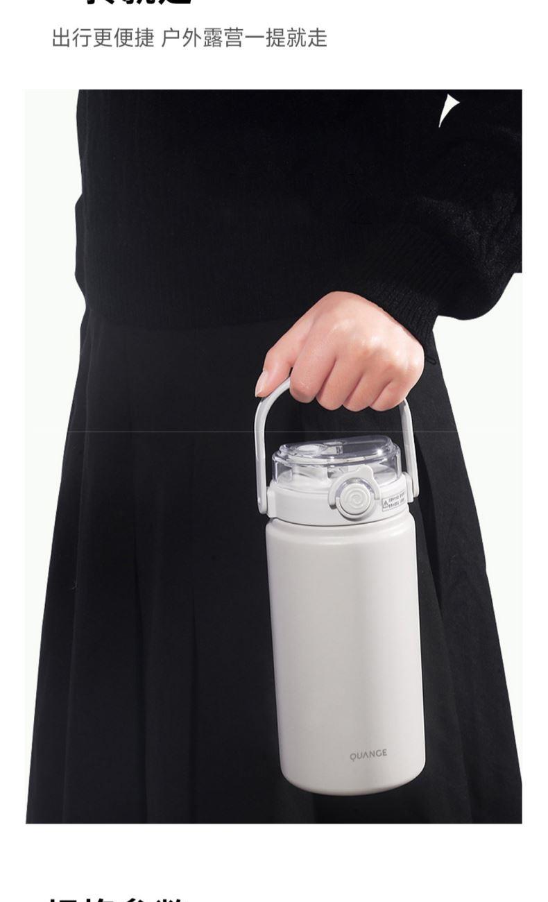 颜色:白色 容量:1200ml 材质:内胆底SUS316,杯盖/吸管:食品级PP密封件:硅橡胶 产品尺寸:φ10.2*26.5cm 包装尺寸:27*11.5*10.7cm 1、大容量1200ml,一键开盖,双饮模式,便携提梁 2、内置茶滤,茶水分离