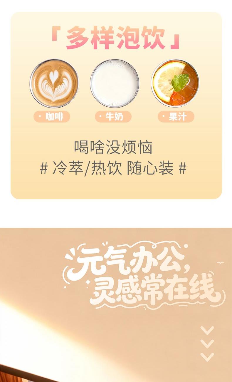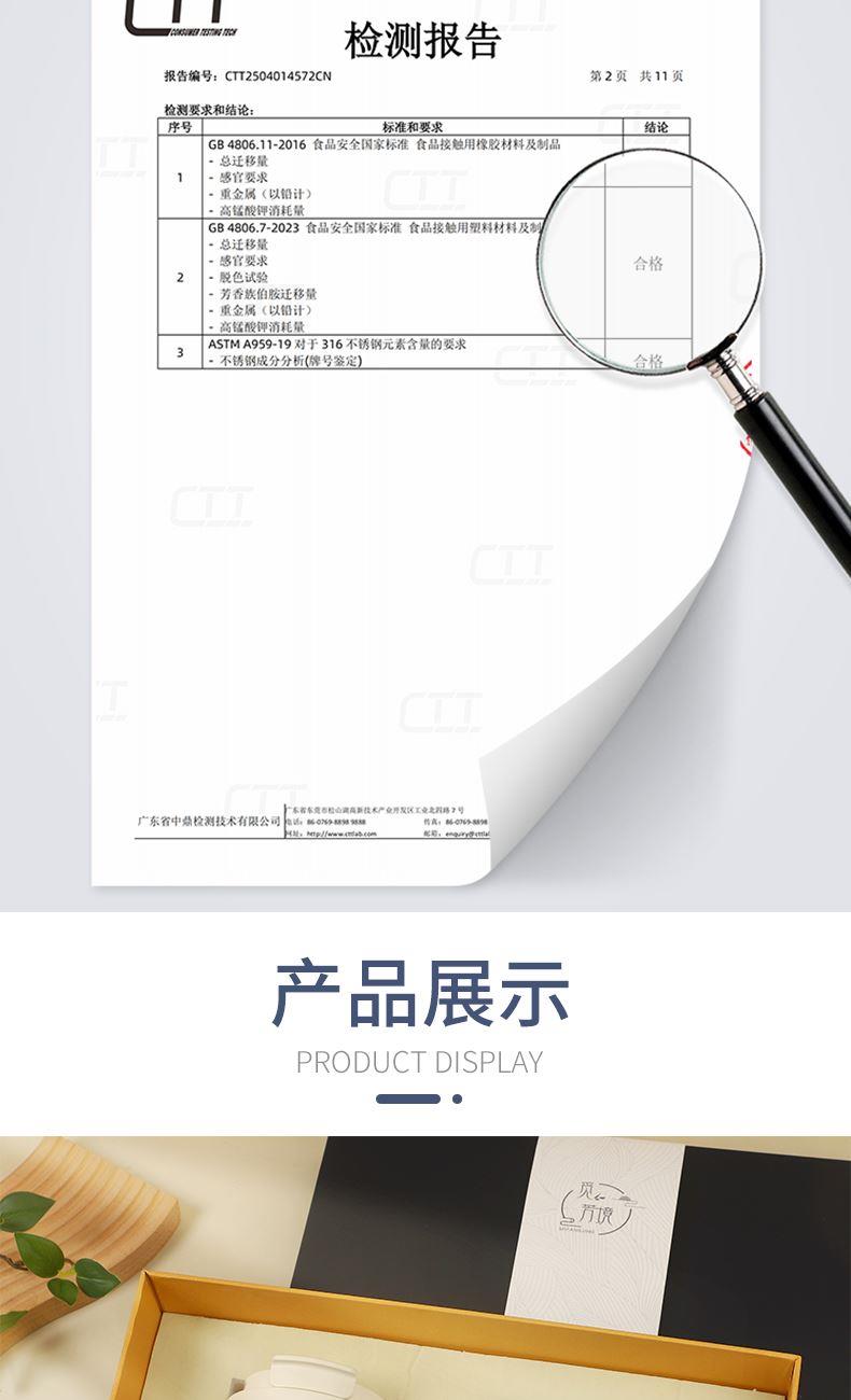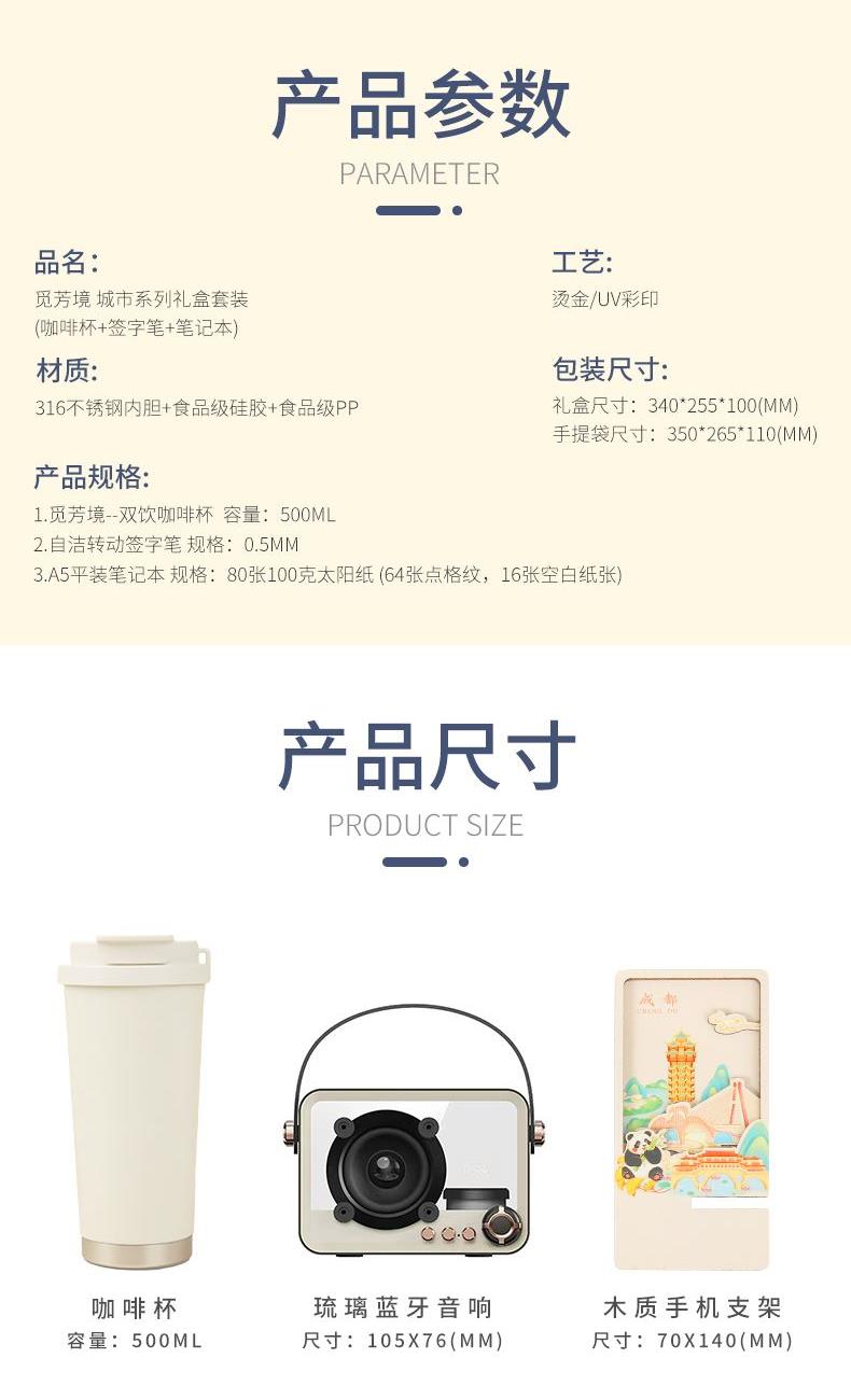 1.觅芳境--双饮咖啡杯 容量:500ml 内胆:316 外壳:304 杯盖:食品级PP 吸管:食品级硅胶 吸嘴:食品级PP 密封圈:食品级硅胶 2.自洁转动签字笔 规格:0.5mm 3.A5平装笔记本 规格:80张100克太阳纸 (64张点格纹,16张空白纸张) 礼盒尺寸:340*255*100(MM) 手提袋尺寸:350*265*110(MM)