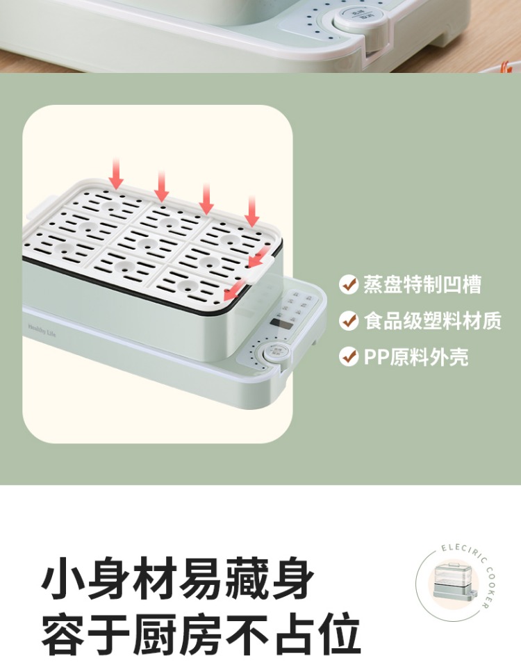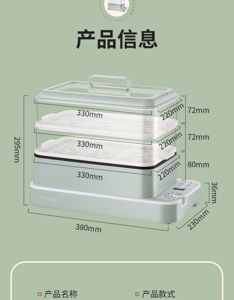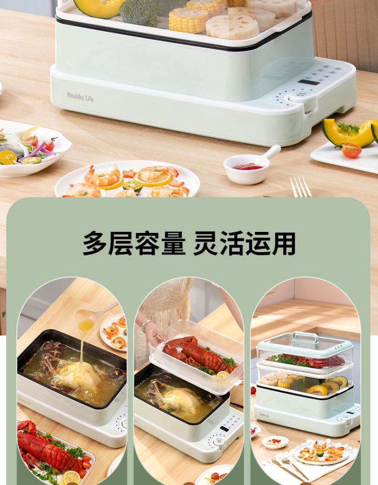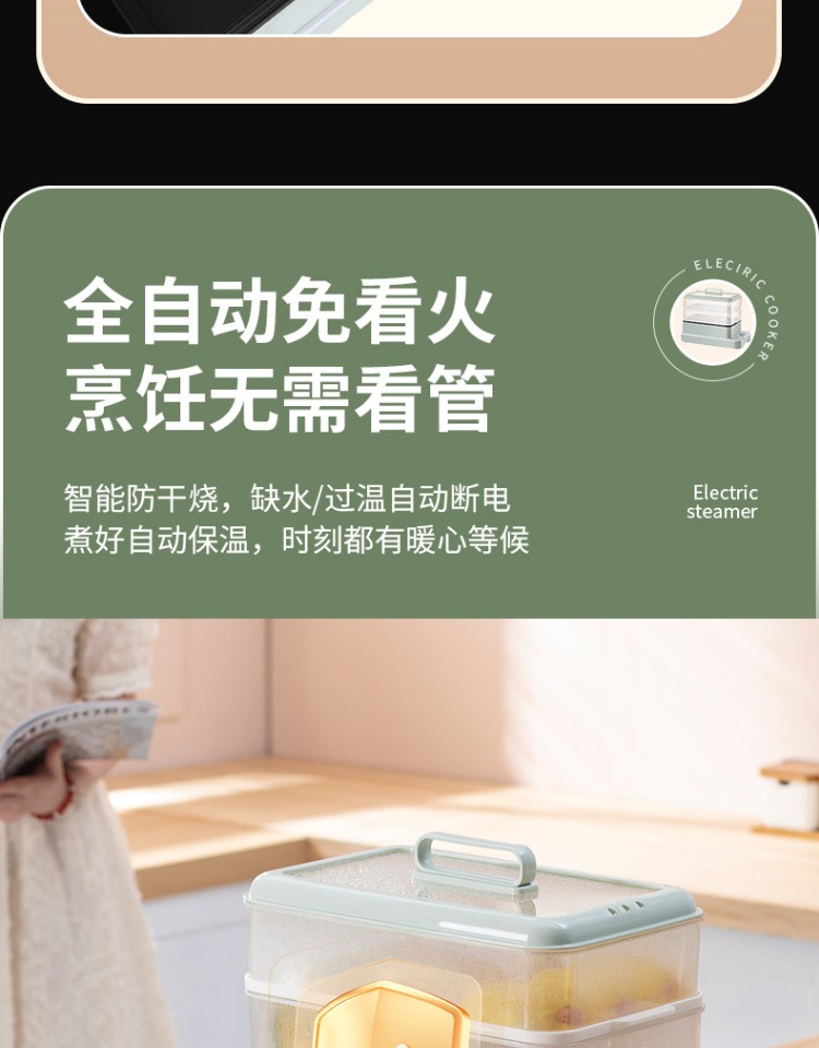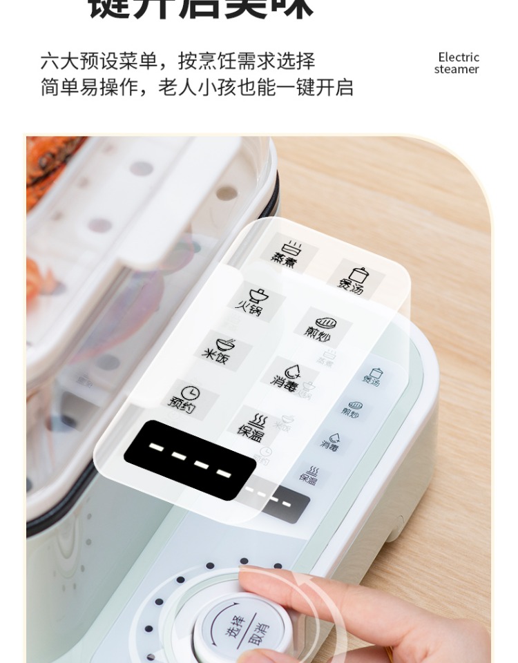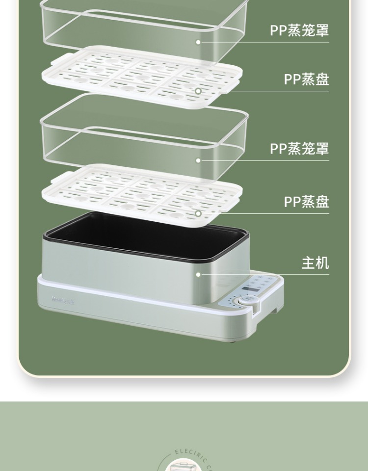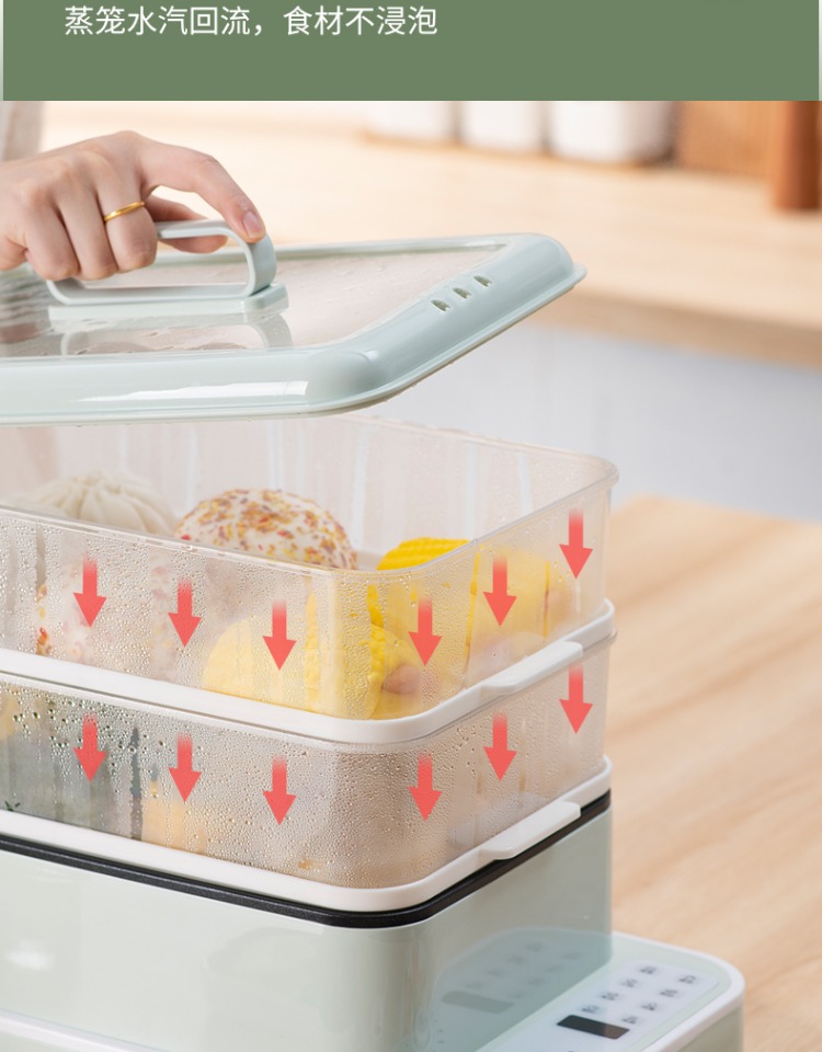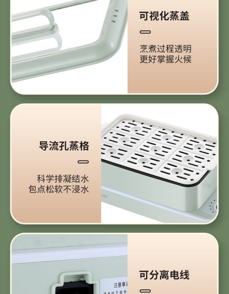 3、可分离电线,清洗方便,安全使用;主机容量4L,蒸笼自有组合;