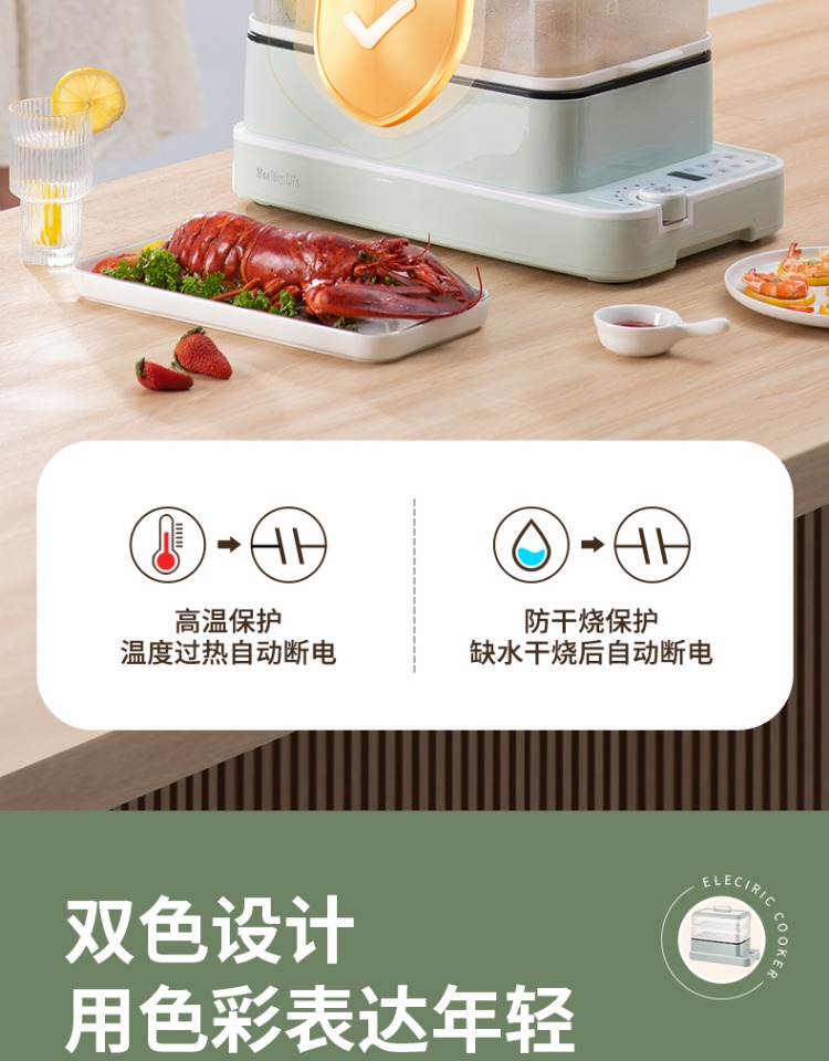 2、可视化蒸盖,烹煮过程更好掌握火候;镀金提手,隔层隔热不会烫手;