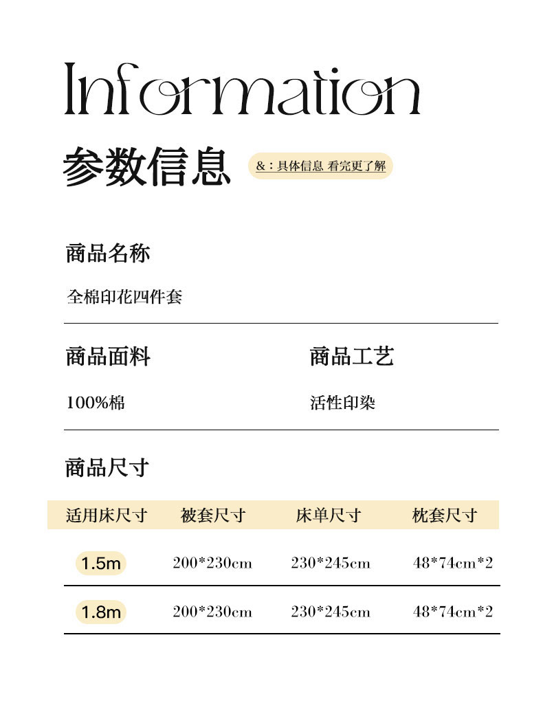 被套:200×230cm 床单:230×250cm 枕套:48×74cm 适用:1.5M-1.8M床 面料:棉 印染工艺:环保印花 包装:手提礼盒 甄选全棉面料,纯净无刺激,柔软亲肤,AB版设计,舒适透气,不易起球。