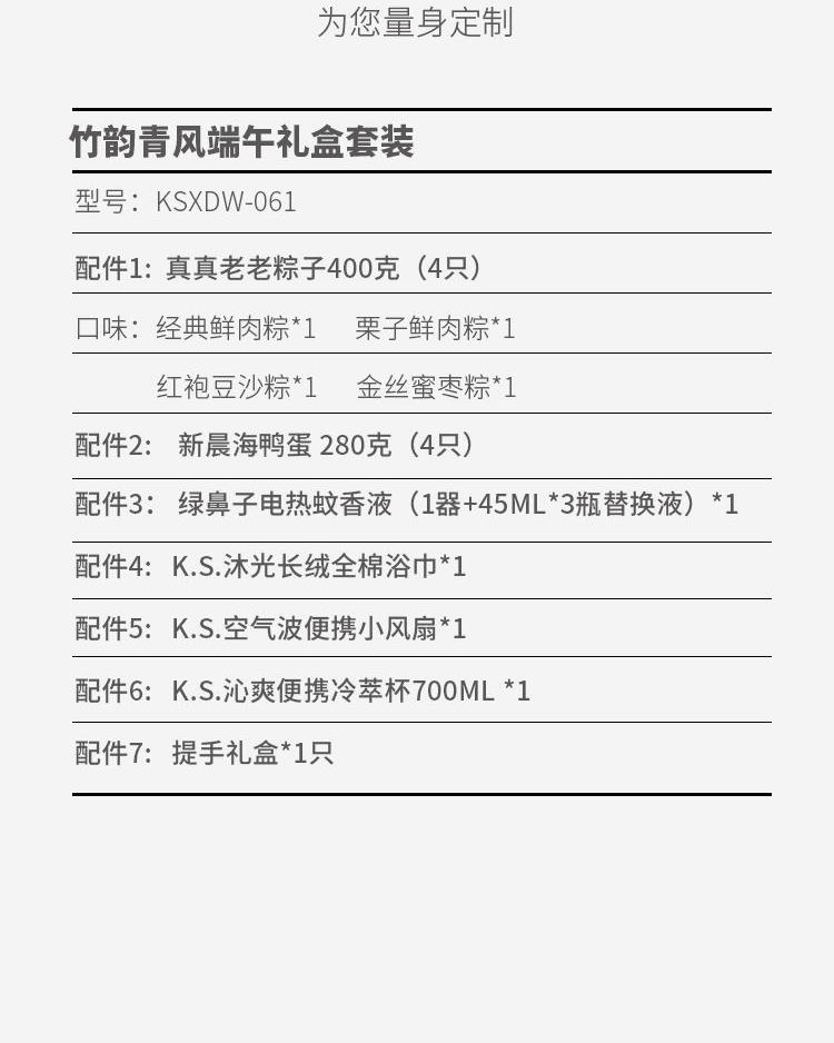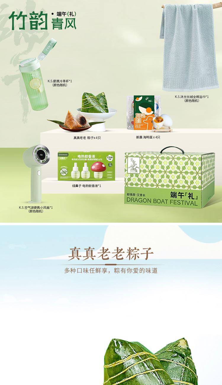 1. 真真老老粽子400克(4只) 2. 新晨海鸭蛋 (4只) 3. 绿鼻子电热蚊香液(1器+45ML*3瓶替换液)*1 4. K.S.沐光长绒全棉浴巾70*140CM *1 5. K.S.空气波便携小风扇*1 6. K.S.沁爽便携冷萃杯700ML *1 7. 提手礼盒*1只 真真老老粽子口味(单只100g): 经典鲜肉粽*1 栗子鲜肉粽*1 红袍豆沙粽*1 金丝蜜枣粽*1 国韵雅致几何纹样礼盒,水墨植绘点缀东方意趣,手提设计富有仪式感。更适配客户伴手礼,核心员工福利等多元礼赠场景,尽显尊贵心意。 真真老老粽子、海鸭蛋、绿鼻子电热蚊香液、全棉浴巾、小风扇、冷萃杯,每一件单品都藏着生活仪式感,支持小批量专属定制,让节日馈赠更有温度与分量。