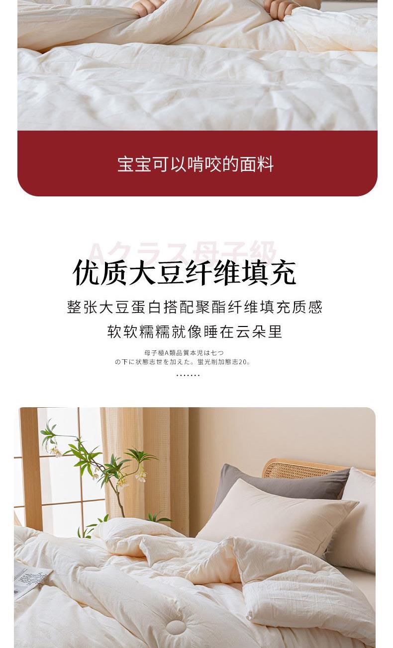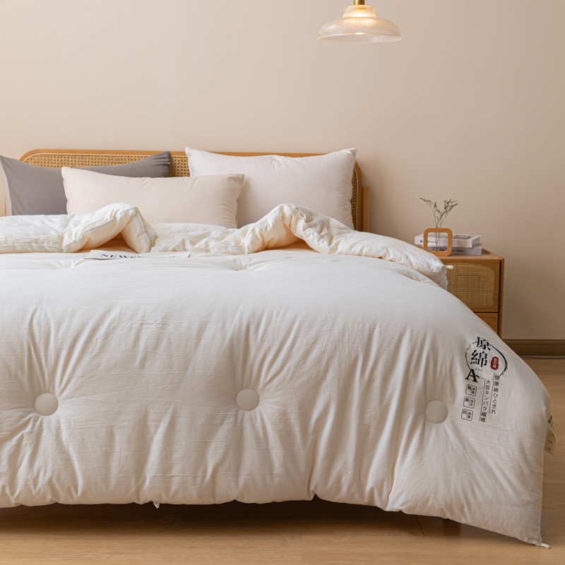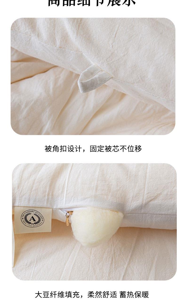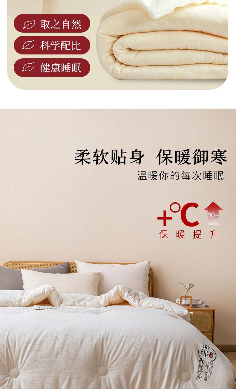 产品规格:200*230 cm*1 面料成份:原棉 填 充 物:大豆纤维/羽丝棉 克 重:2500g 产品说明:亲肤原棉面料,面料手感柔软细腻,适合贴身裸睡回归自然,亲和肌肤。 大豆纤维与羽丝棉的科学搭配,软糯棉柔,舒肤不压身。